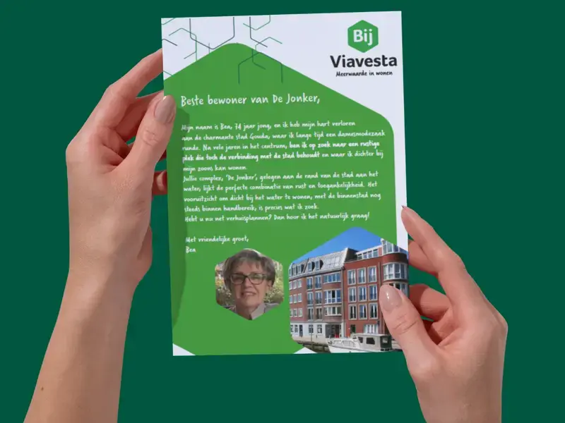 Dat ze bij Bij Viavesta terechtkwam, was geen toeval. “Ik heb wat rondgebeld, op websites gekeken en kreeg meteen een goed gevoel. Het contact was warm en doordacht. Niet opdringerig, maar wel betrokken.” Wat haar vooral is bijgebleven? De actie die werd ondernomen toen ze interesse had in een specifiek appartement aan de Turfsingel.“Dat appartement stond nog niet te koop, maar Bij Viavesta heeft toen speciaal voor mij geflyerd in dat complex. Gewoon om te peilen of iemand misschien wilde verkopen. Dat vond ik zó attent. Ze namen initiatief, zonder dat ik erom hoefde te vragen. Ik voelde me gezien.”