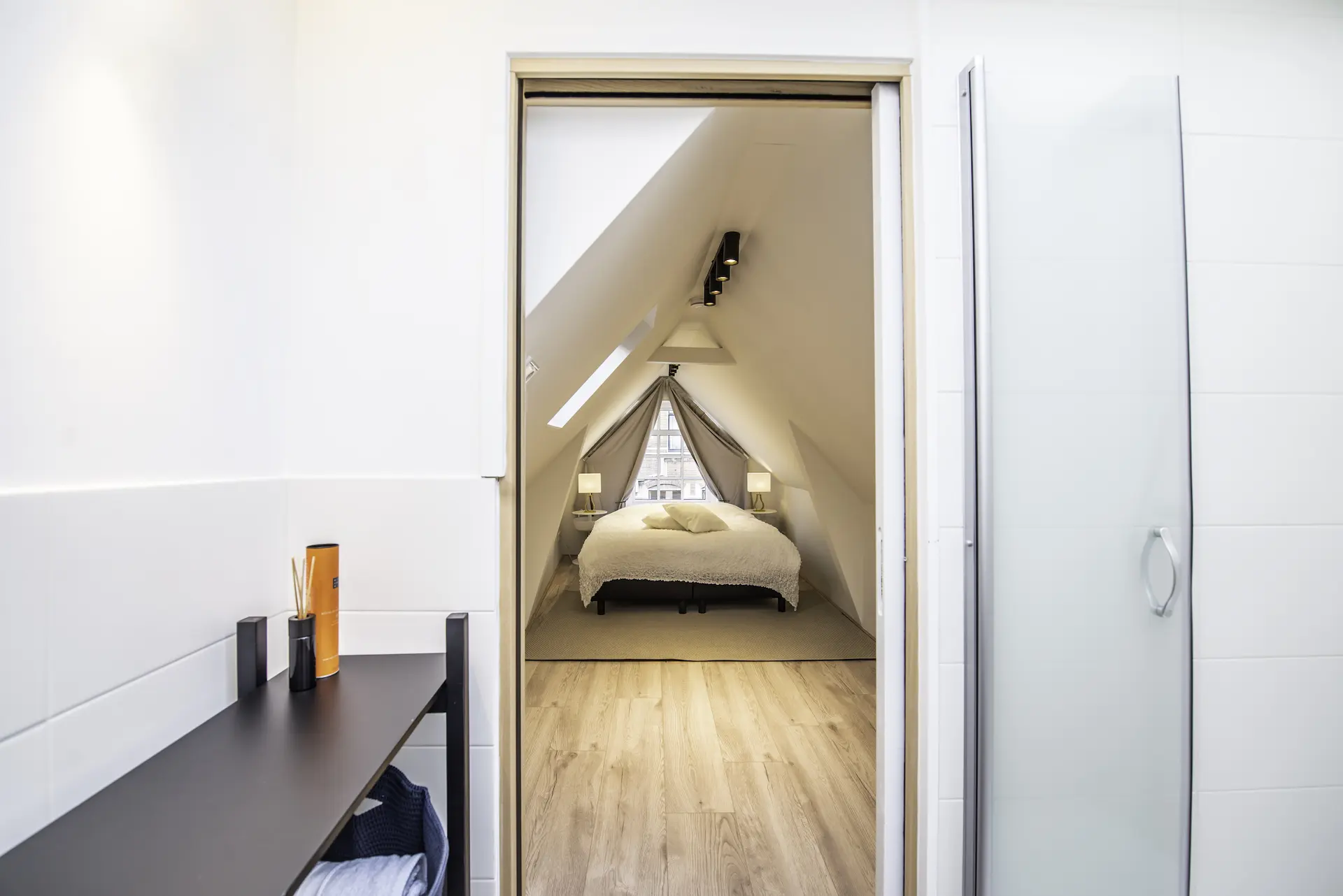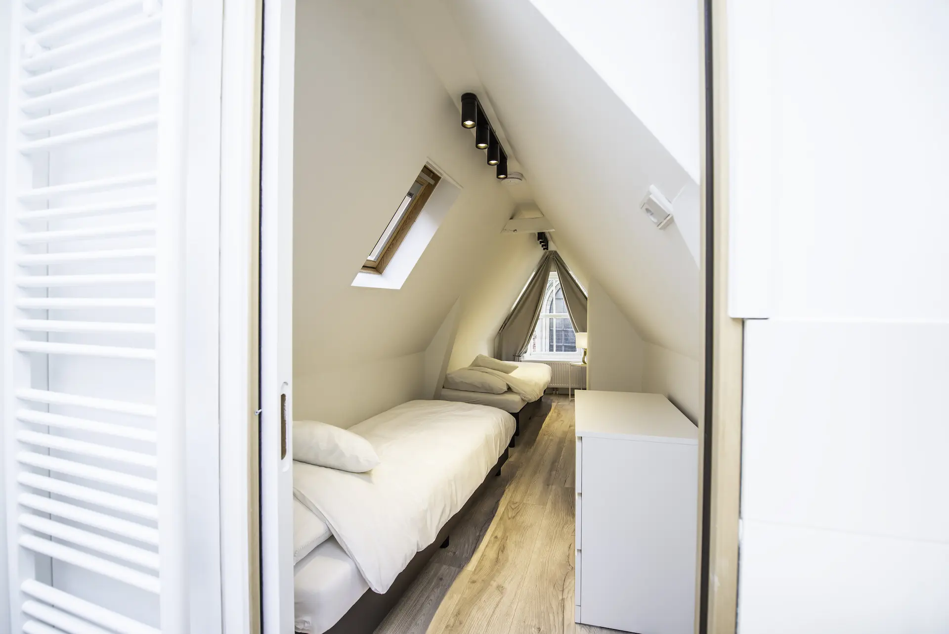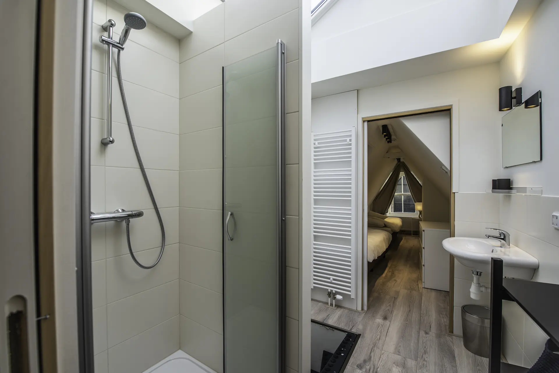 Via de spiltrap vanuit de keuken kom je op de verdieping met twee slaapkamers. Beide kamers beschikken over een raam of dakraam, waardoor er voldoende daglicht binnenkomt. De lichtstraat met dubbel glas zorgt voor extra licht en een ruimtelijk gevoel. Op de overloop vind je een douchecabine en een wastafel.