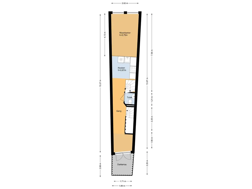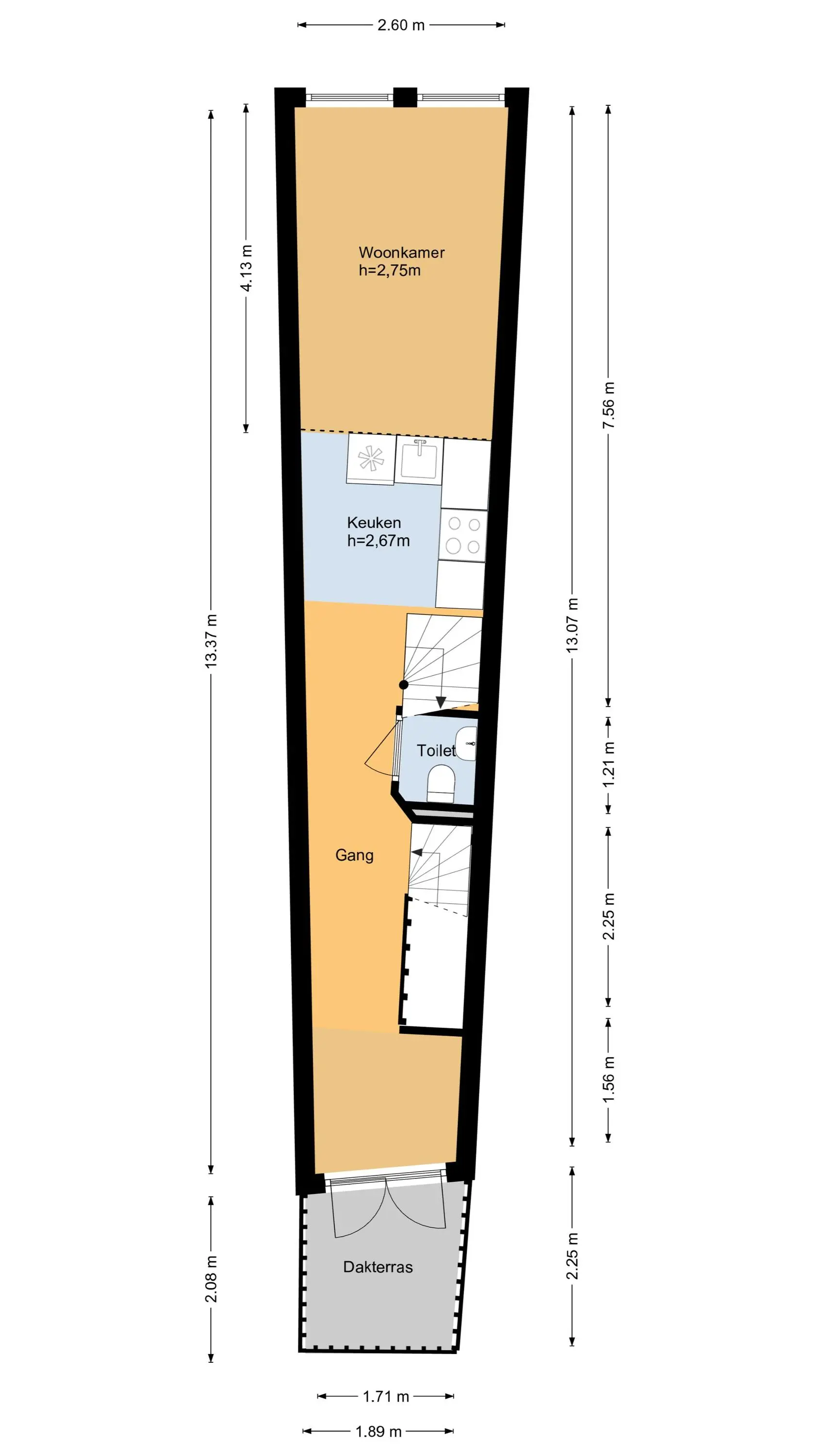 Een ruime hal met toegang tot een terras aan de voorzijde. Hier bevindt zich tevens het toilet, geheel betegeld en voorzien van een fontein en zwevend closet. De compacte keuken is uitgerust met een los koelkast, oven, 4-pits inductiekookplaat en afzuigkap. Aan de achterzijde zorgen schuiframen met monumentenglas voor lichtinval, terwijl de woonkamer is voorzien van een balkenplafond, gestucte wanden en een nette laminaatvloer, een prettige combinatie van oud en nieuw.