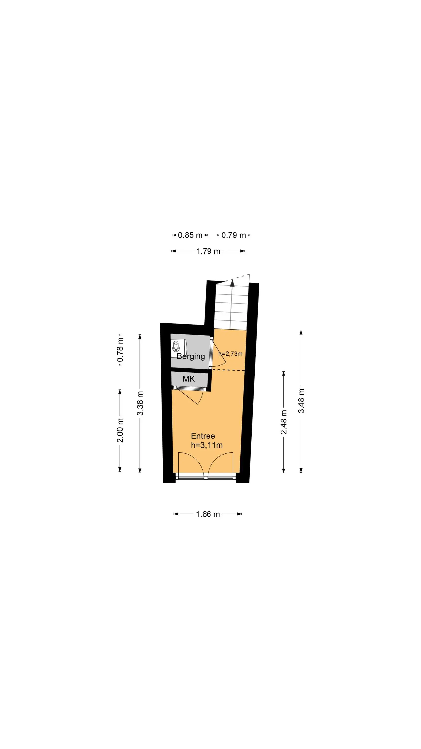 Via de entree aan de Achter de Kerk bereik je de hal met vernieuwde meterkast, voorzien van eigen meters, cv-installatie en mechanische ventilatie box. De begane grond bestaat uitsluitend uit de opgang naar de woning; de winkel op de begane grond behoort tot een andere eigenaar binnen de VvE.