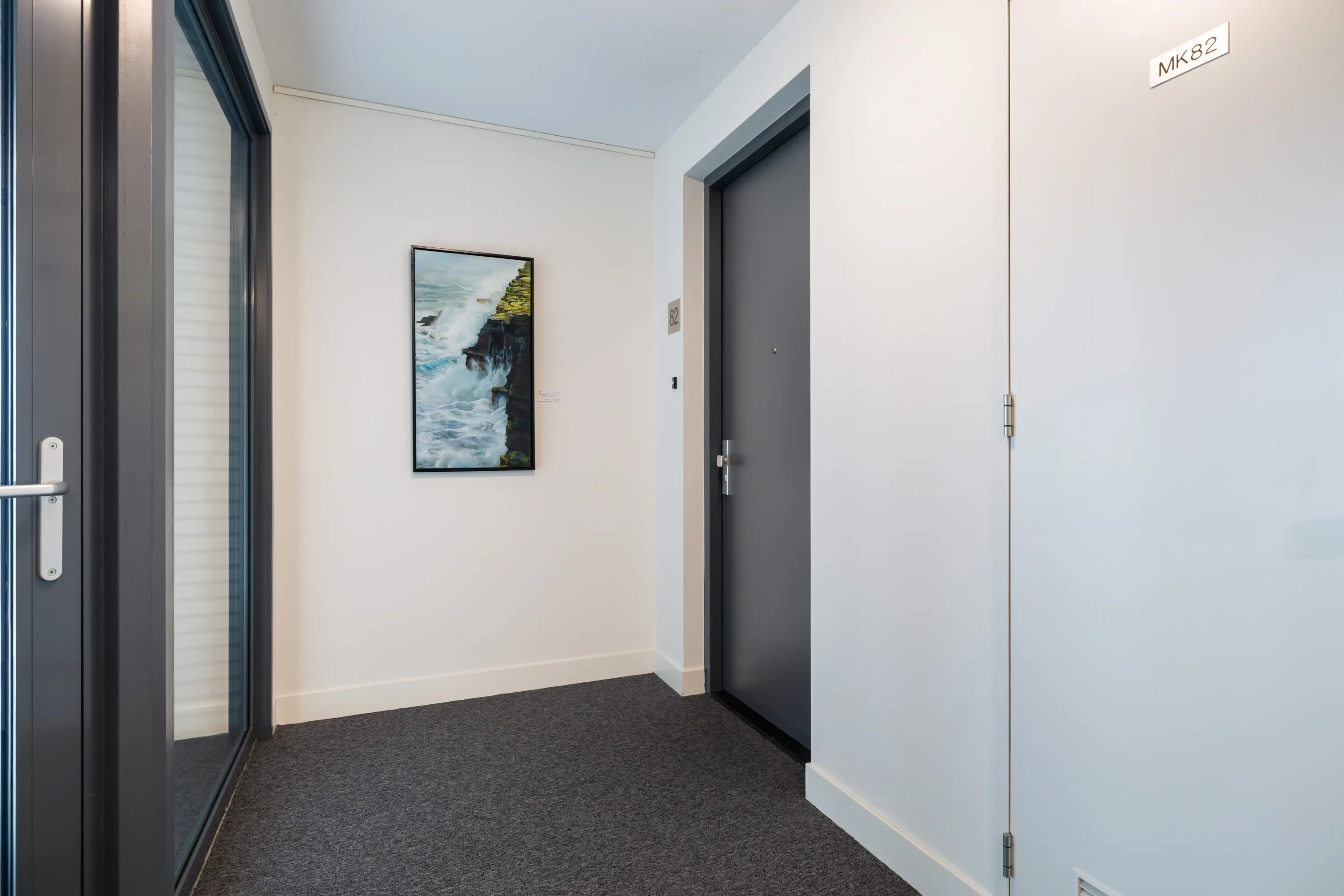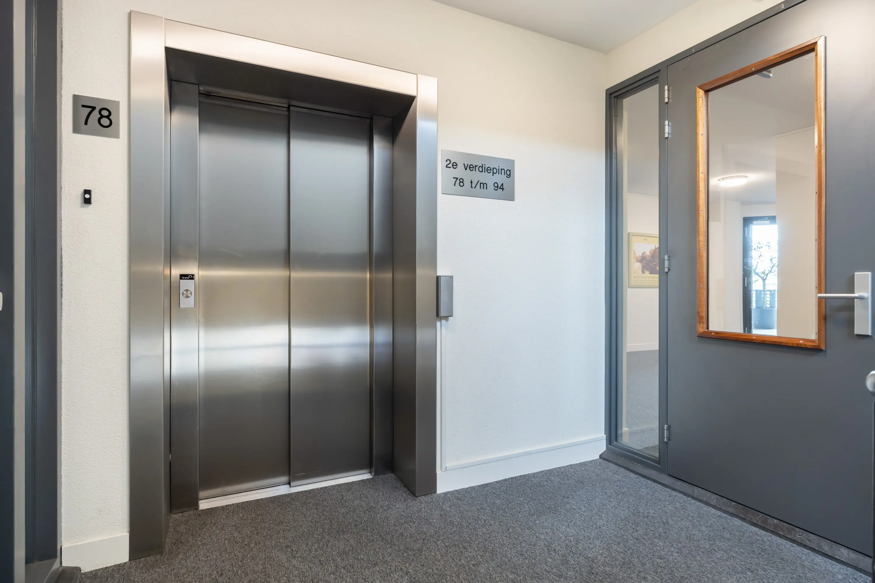 Ingang appartementencomplex met aan de buitenzijde de brievenbussen en een bellentableau. In de nette centrale hal is zowel de lift als het trappenhuis te bereiken. Het gebouw heeft een moderne en verzorgde uitstraling, wat meteen een welkom gevoel geeft.