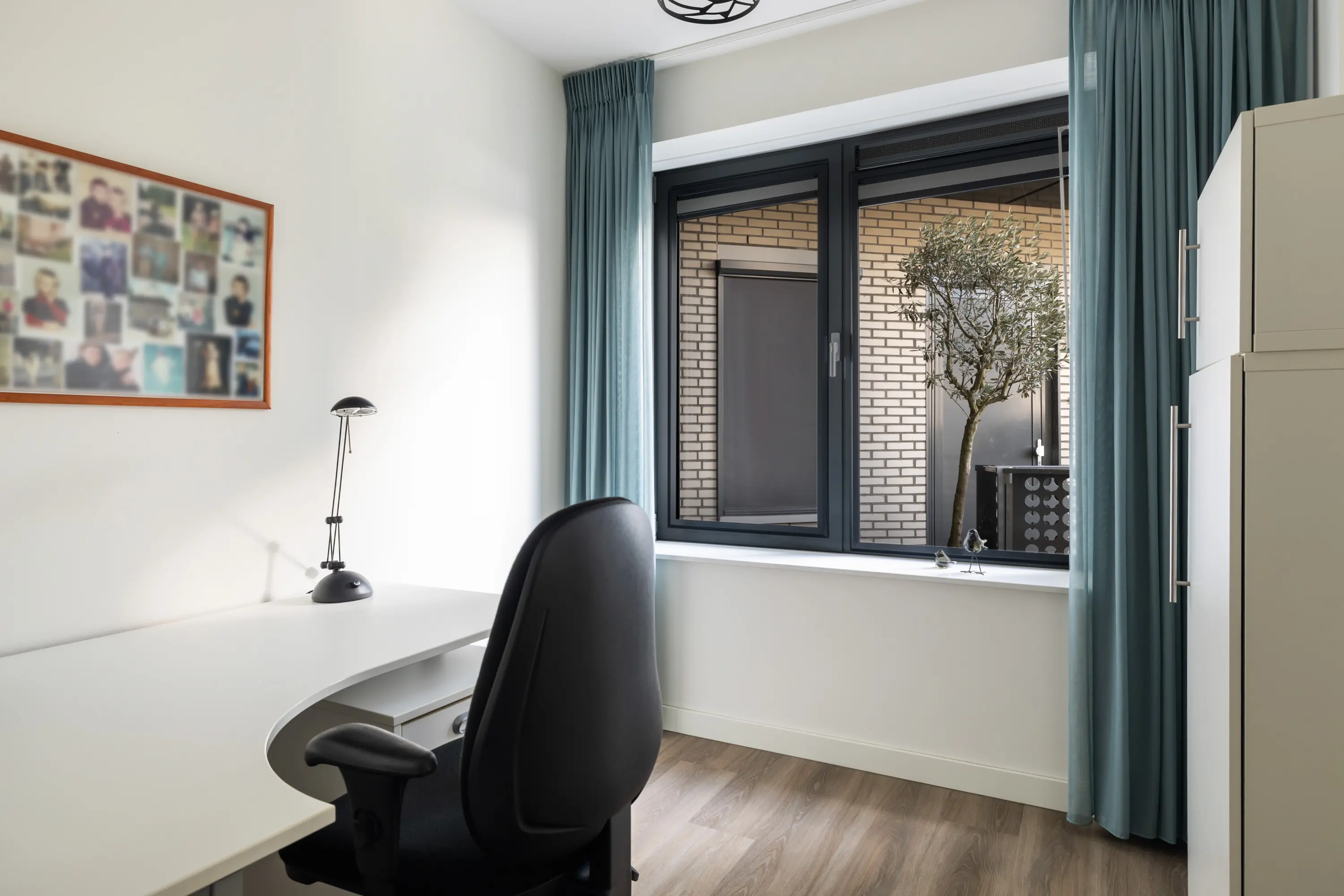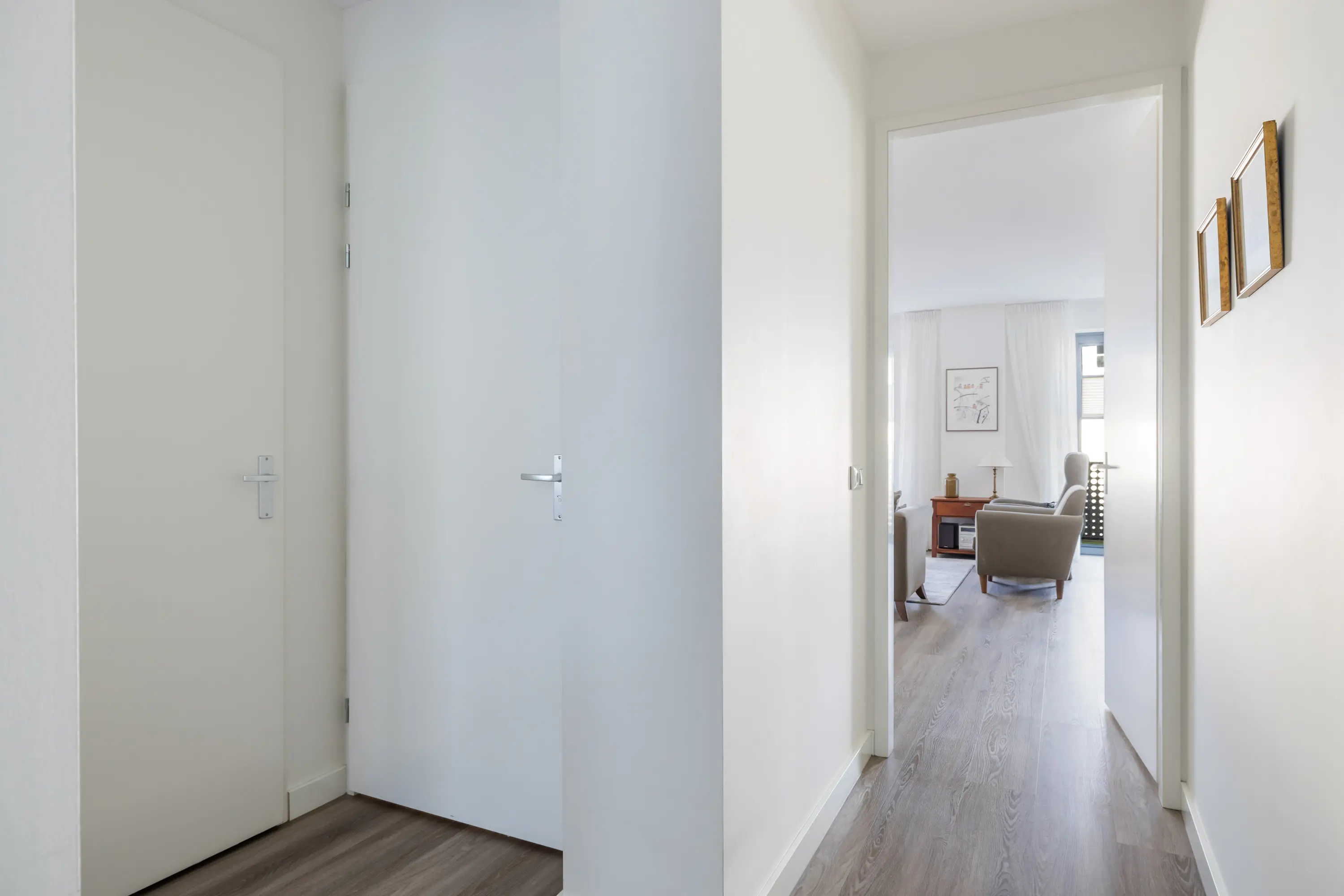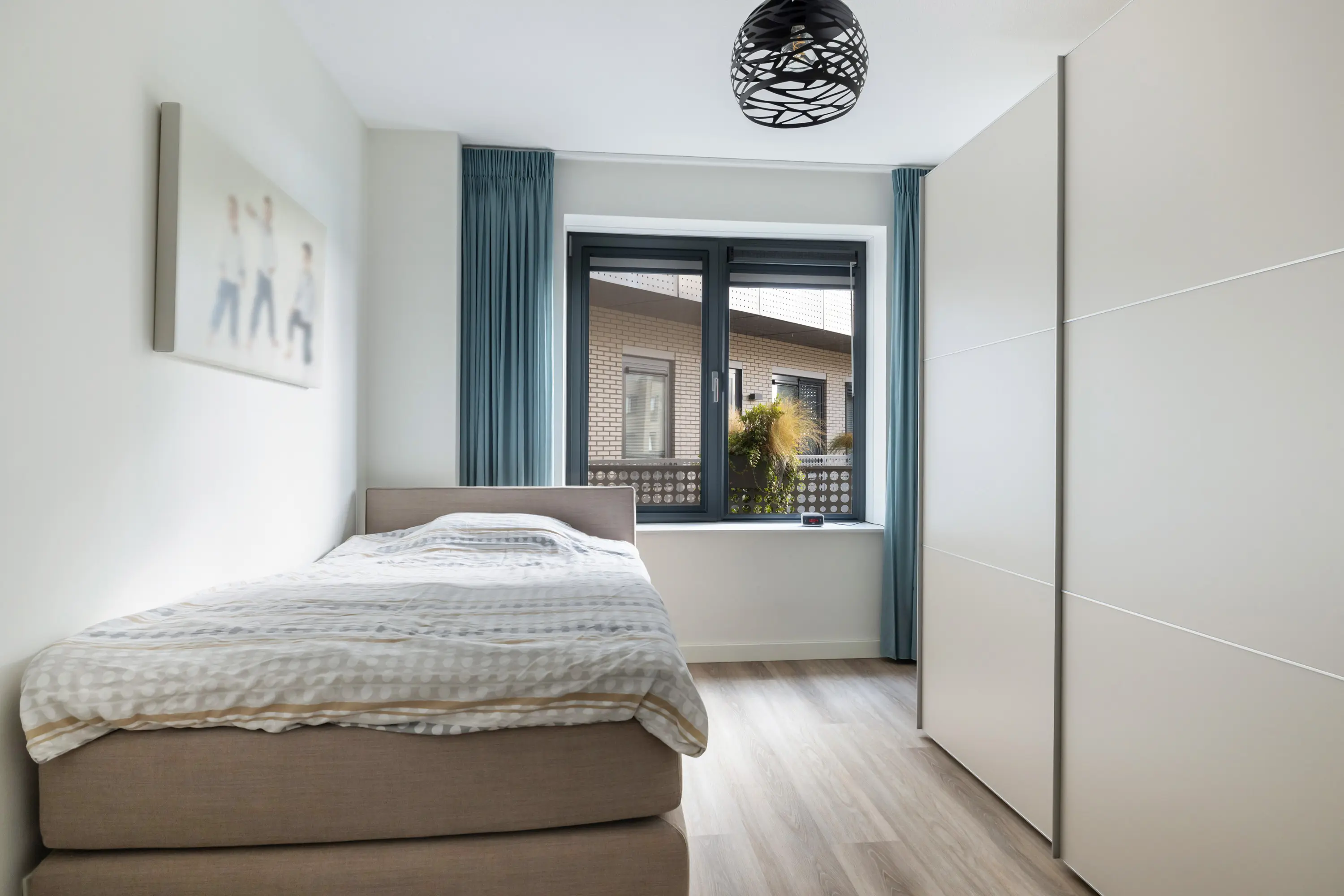 Tegenover de badkamer liggen de 2 slaapkamers van ca. 12 m² en ca. 7 m². Dankzij de grote raampartijen zijn de kamers heerlijk licht. De grote slaapkamer biedt voldoende ruimte voor een tweepersoonsbed en een kledingkast. De 2e slaapkamer is geschikt als logeer- of werkkamer.