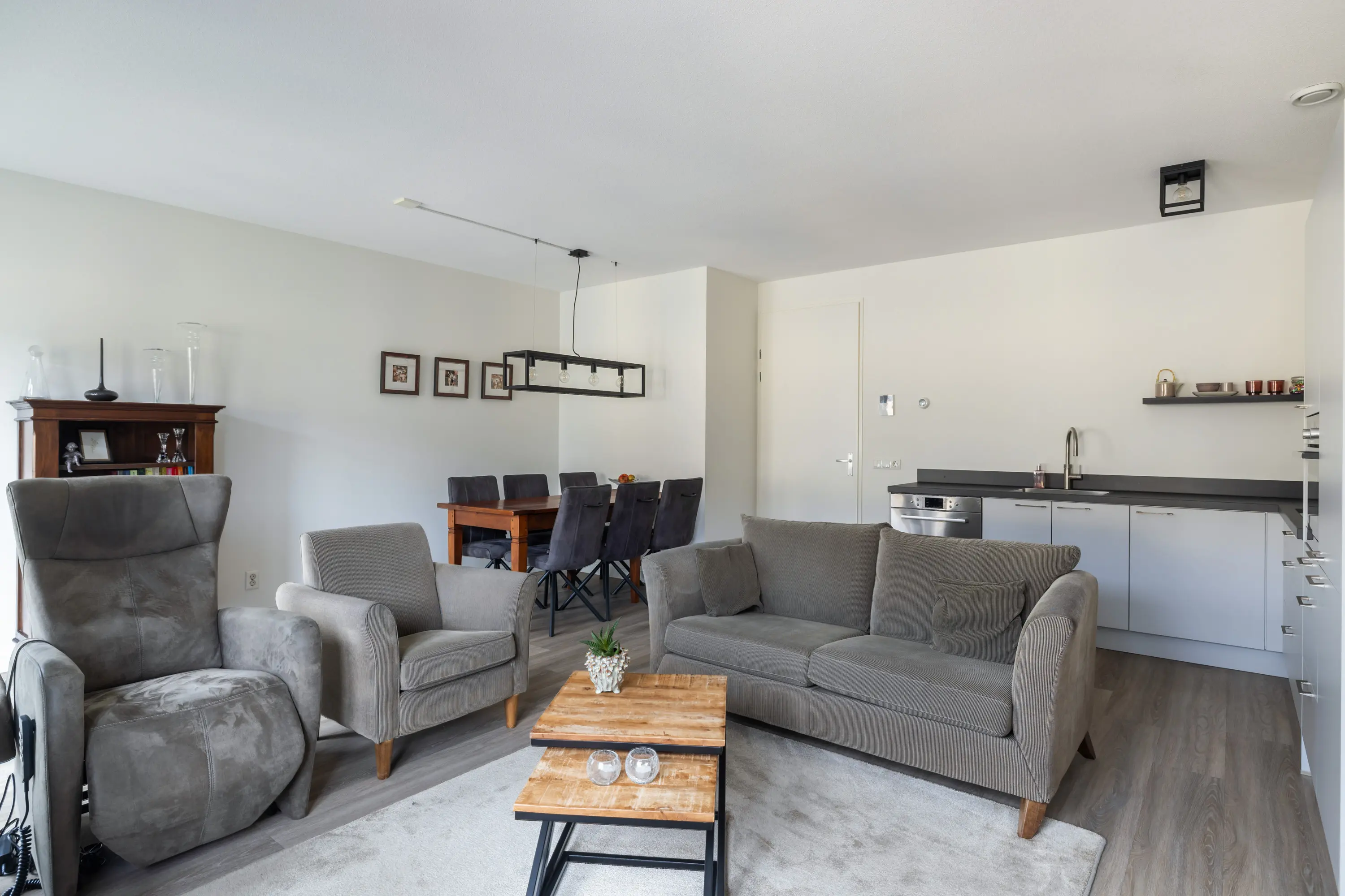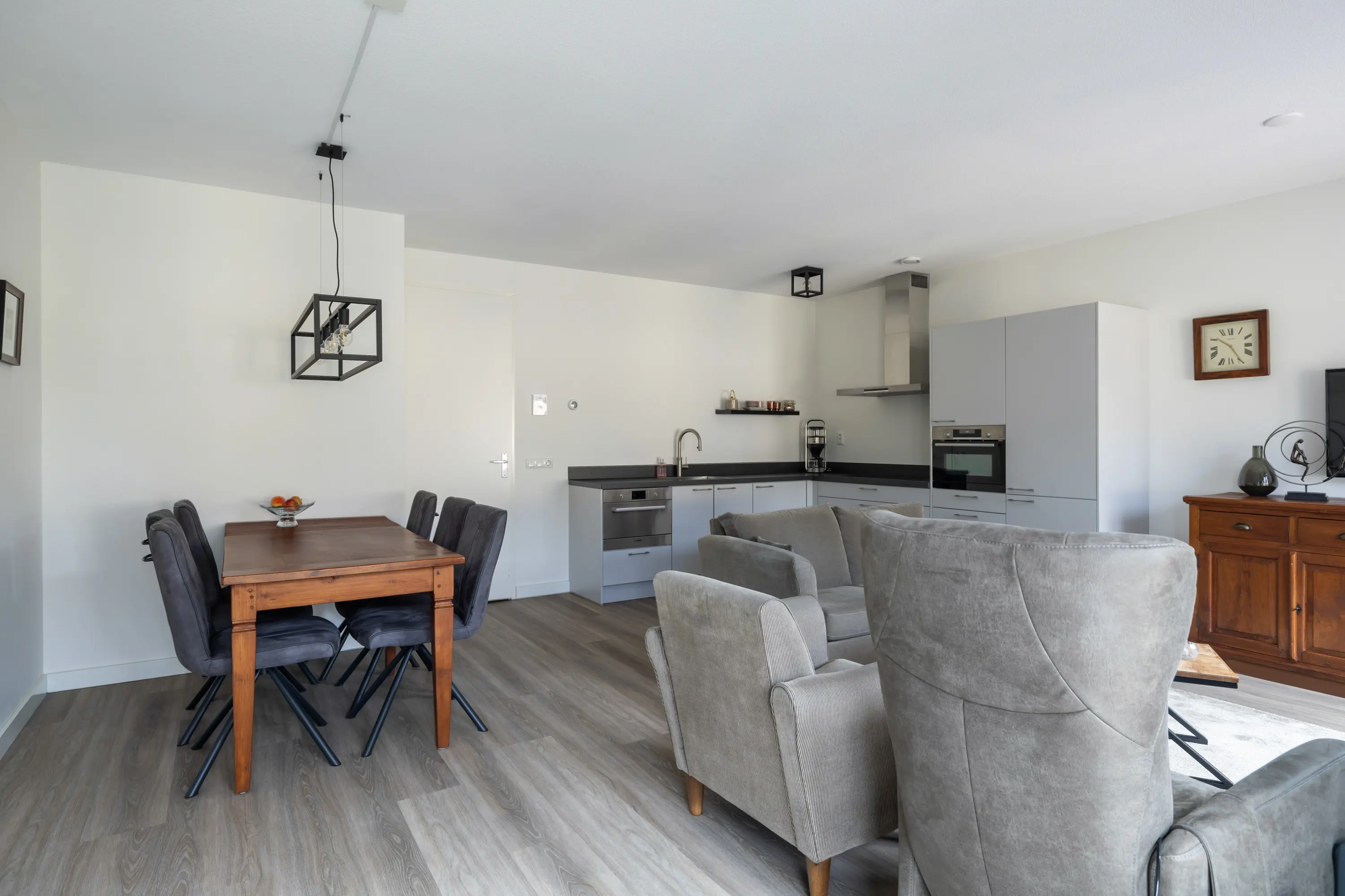 De keuken is praktisch ingedeeld en biedt voldoende kastruimte. Hier kookt u met plezier terwijl u in contact blijft met uw gasten of huisgenoten.