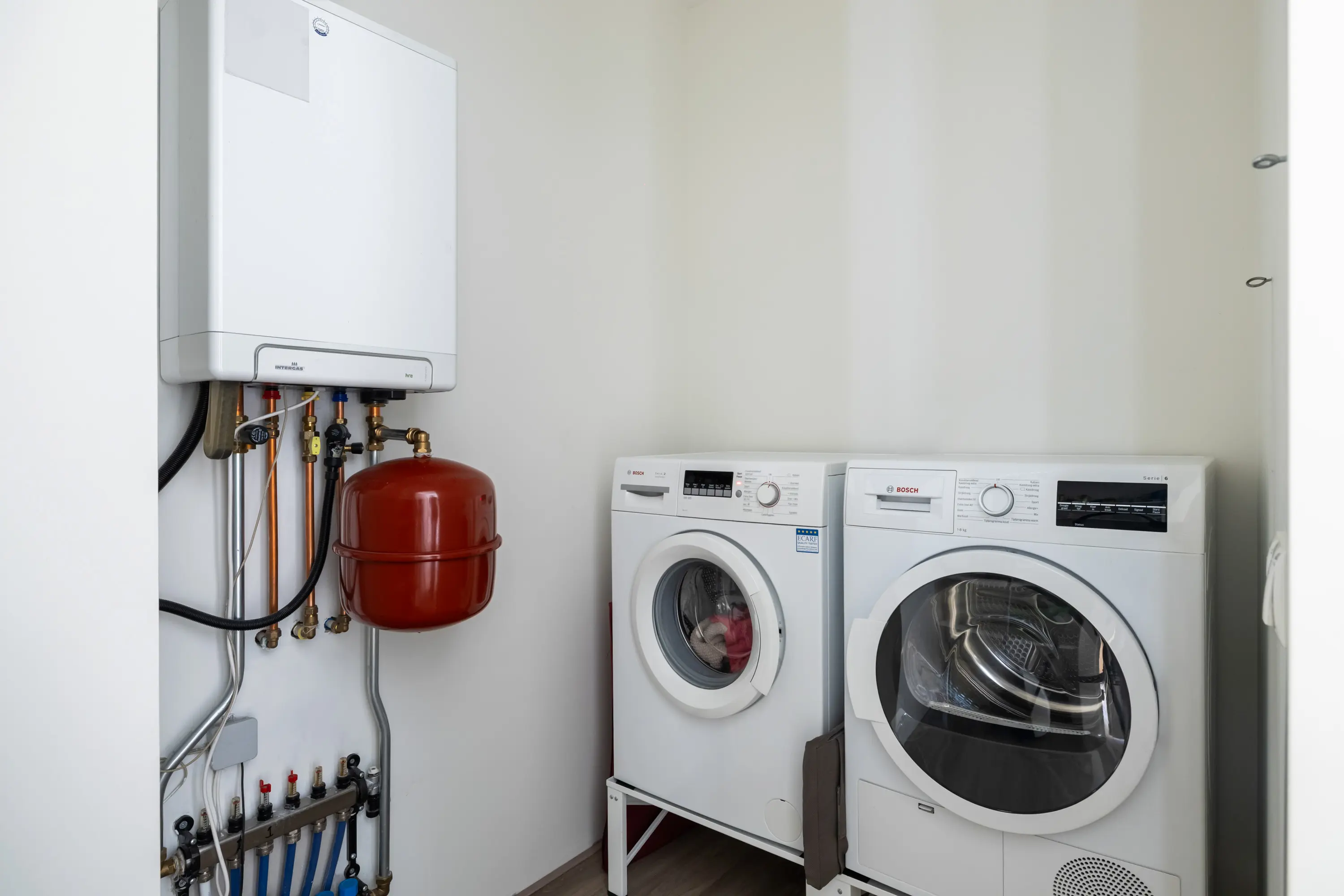In de hal bevindt zich een praktische inpandige berging van ca. 4 m². Hier vindt u de cv-combiketel (Intergas, 2019) en de aansluitingen voor wasmachine en droger. Daarnaast is er voldoende plek om extra spullen op te slaan, zoals schoonmaakartikelen of voorraad.