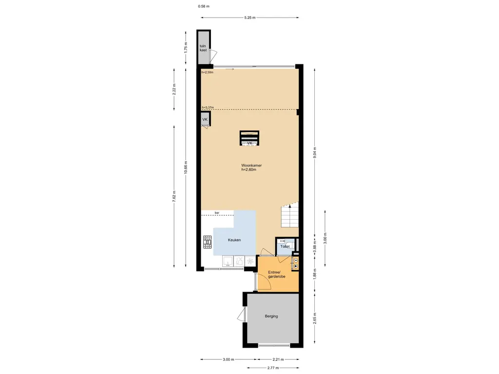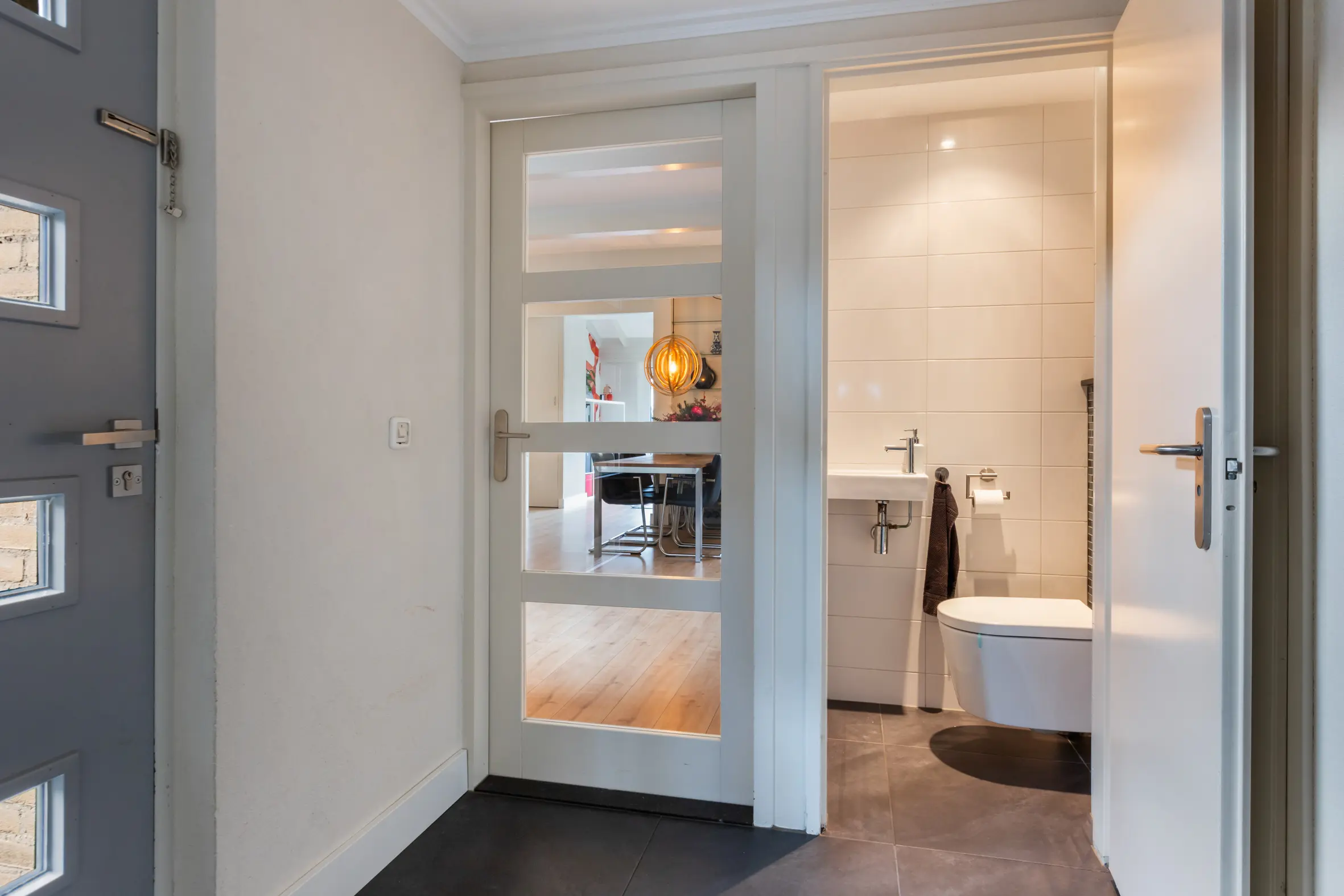 Via de entree kom je in de hal met een nieuwe vloer, meterkast (voorzien van vijf groepen en glasvezel) en een modern toilet met wandcloset en fontein. Vanuit de hal is ook de aangebouwde stenen berging bereikbaar, voorzien van elektra en een praktische vliering. De berging is zowel inpandig als via buiten toegankelijk, ideaal voor fietsen, opslag of hobby’s.