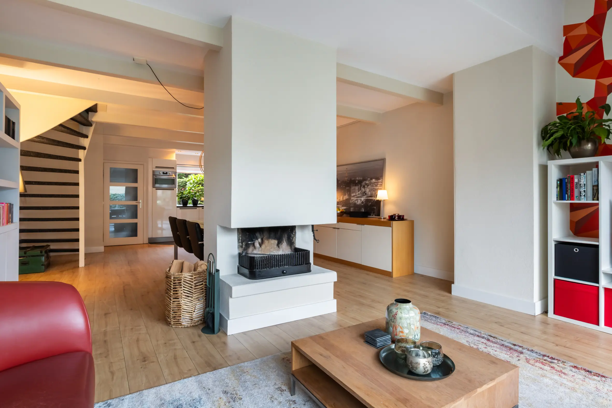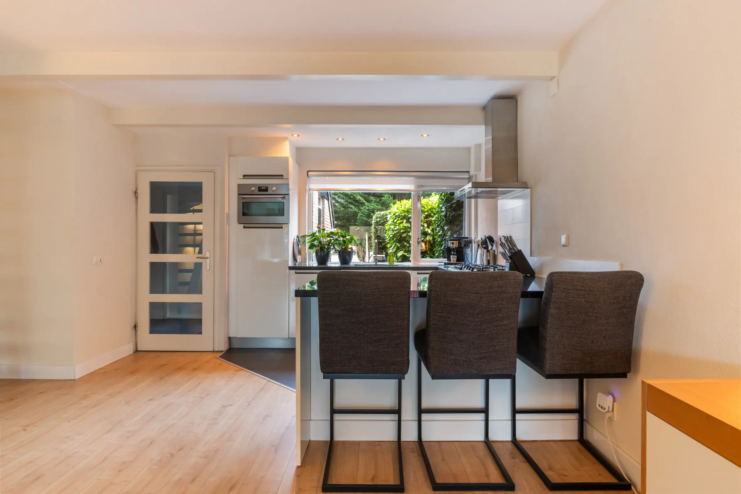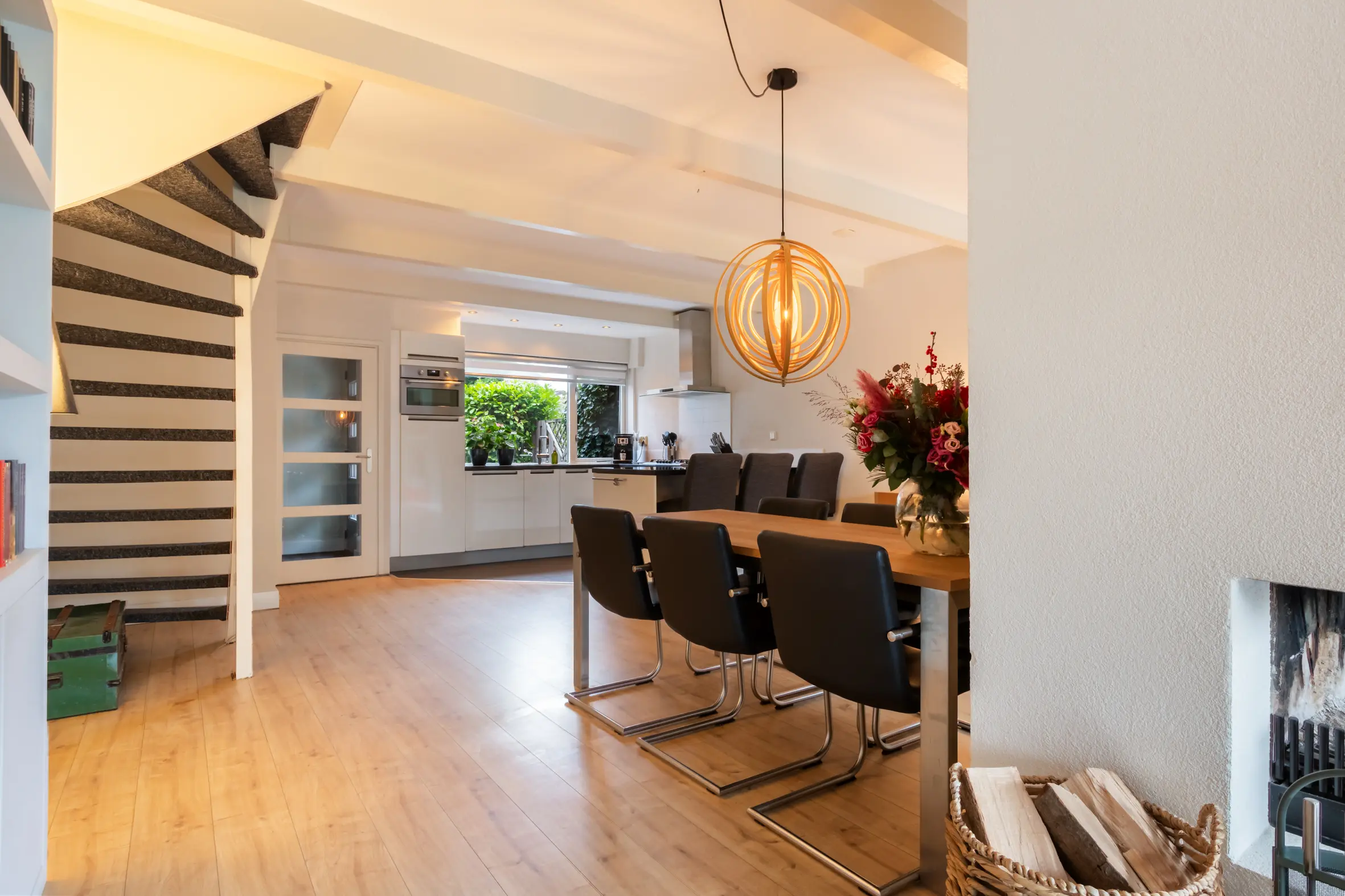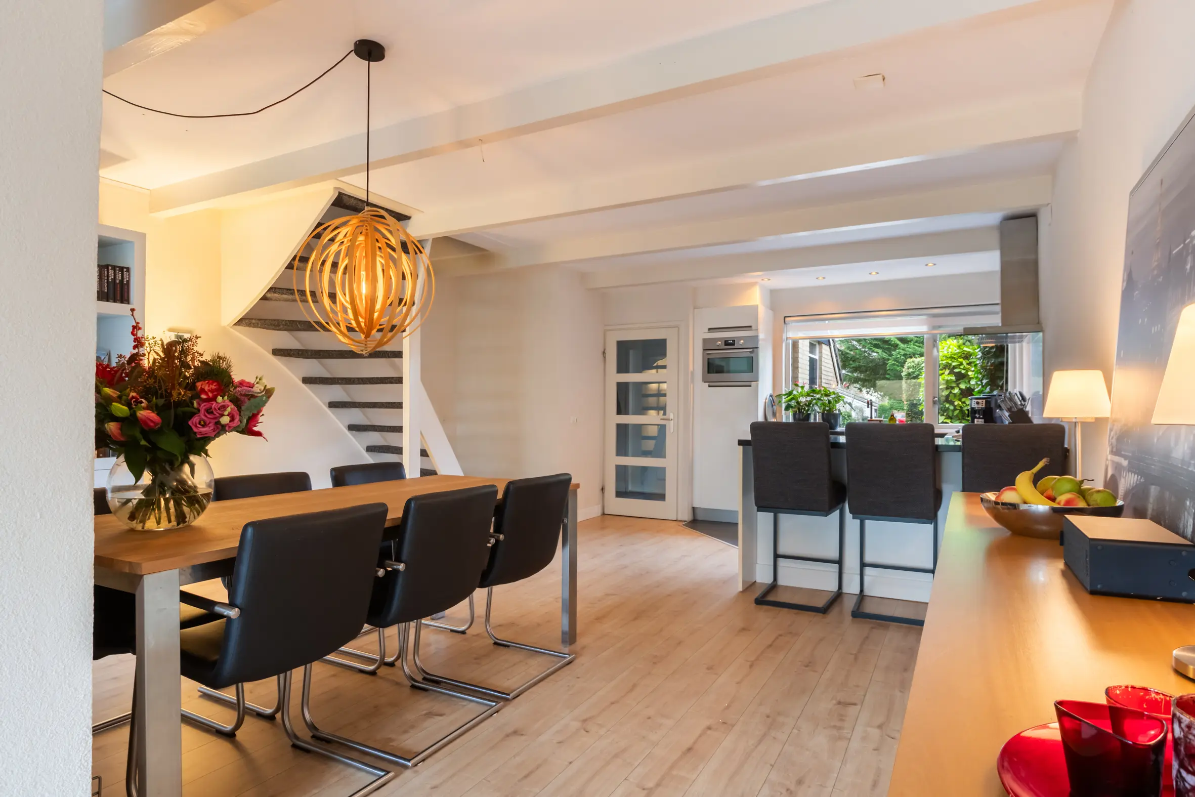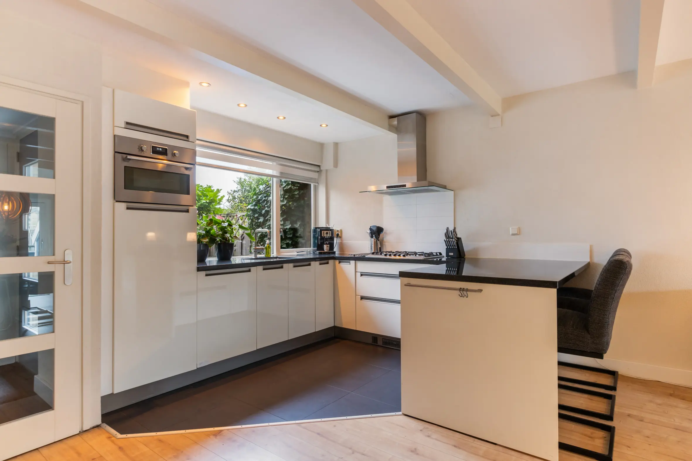 De uitgebouwde woonkamer is ruim, licht en sfeervol. De open haard vormt een prettig middelpunt en dankzij de grote, vernieuwde schuifpui is er veel daglicht en een fijne verbinding met de achtertuin. Aan de voorzijde van de woning bevindt zich de keuken, voorzien van plintverwarming, een gezellig barretje en diverse inbouwapparatuur, waaronder een combimagnetronoven, een 5-pits gasfornuis met wokbrander, afzuigkap, vaatwasser en koelkast. Er is voldoende ruimte voor een grote eettafel, waardoor de begane grond een echte leefverdieping vormt.