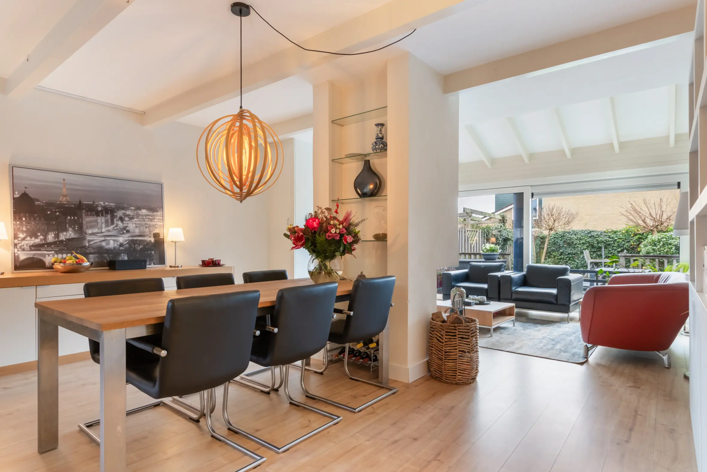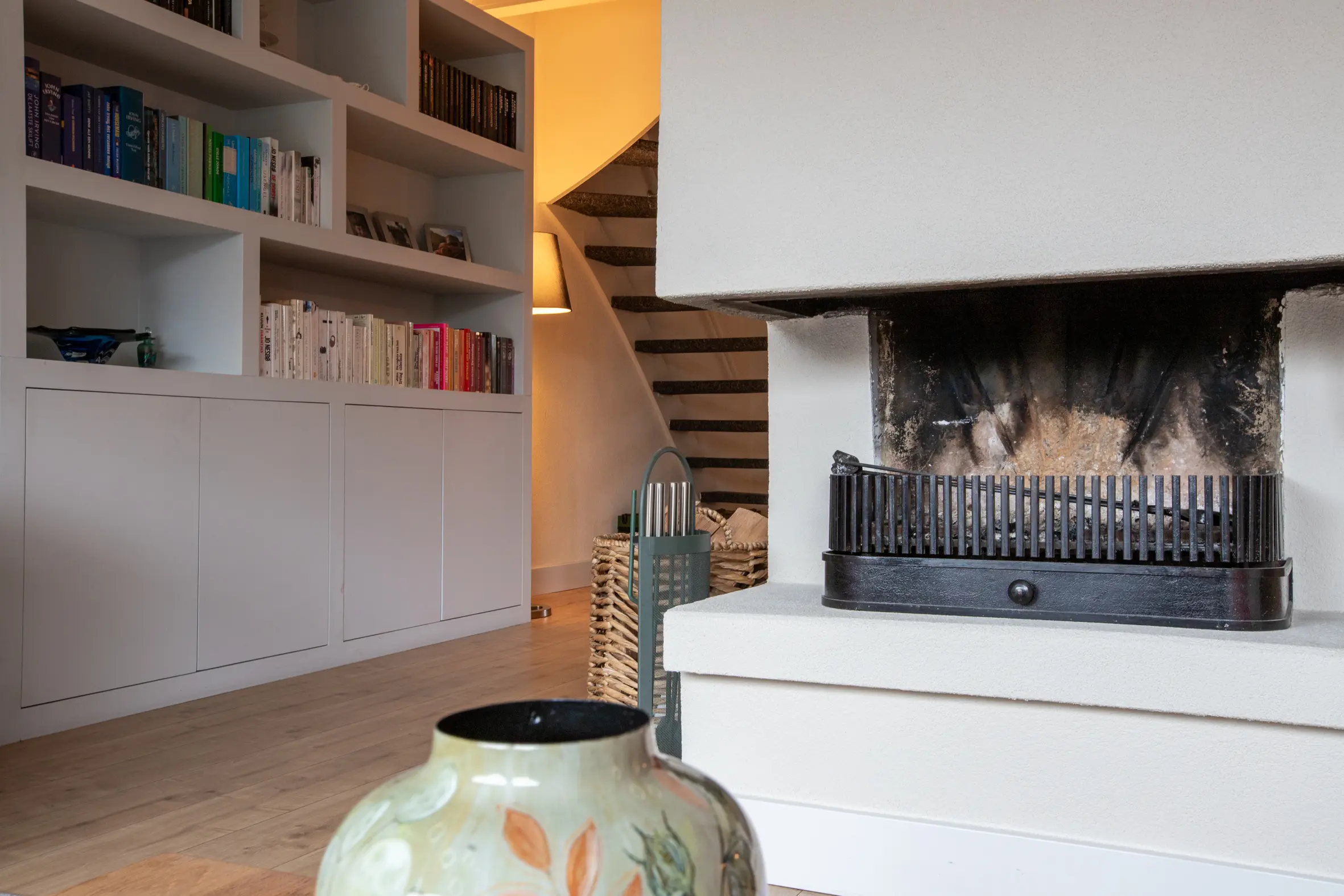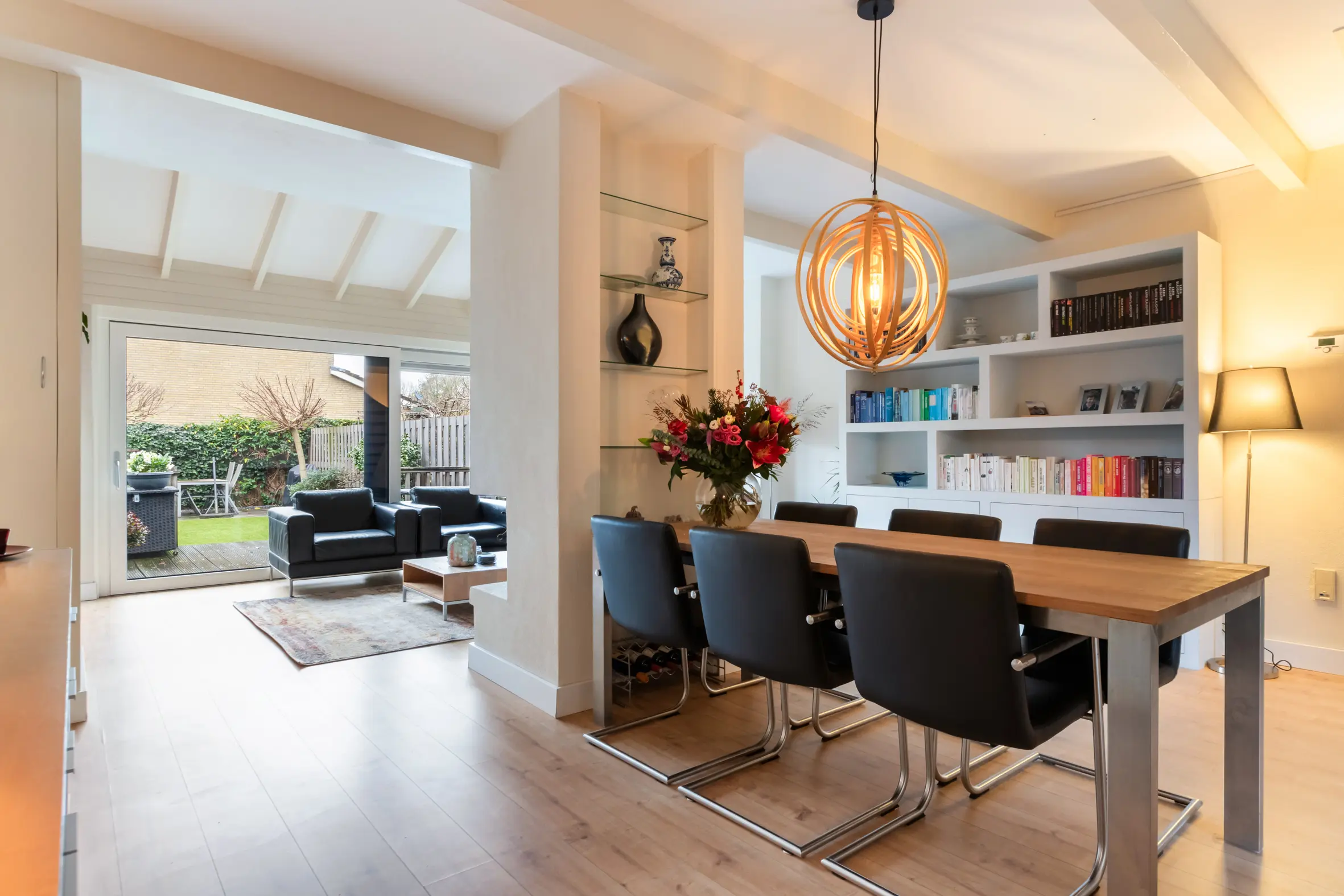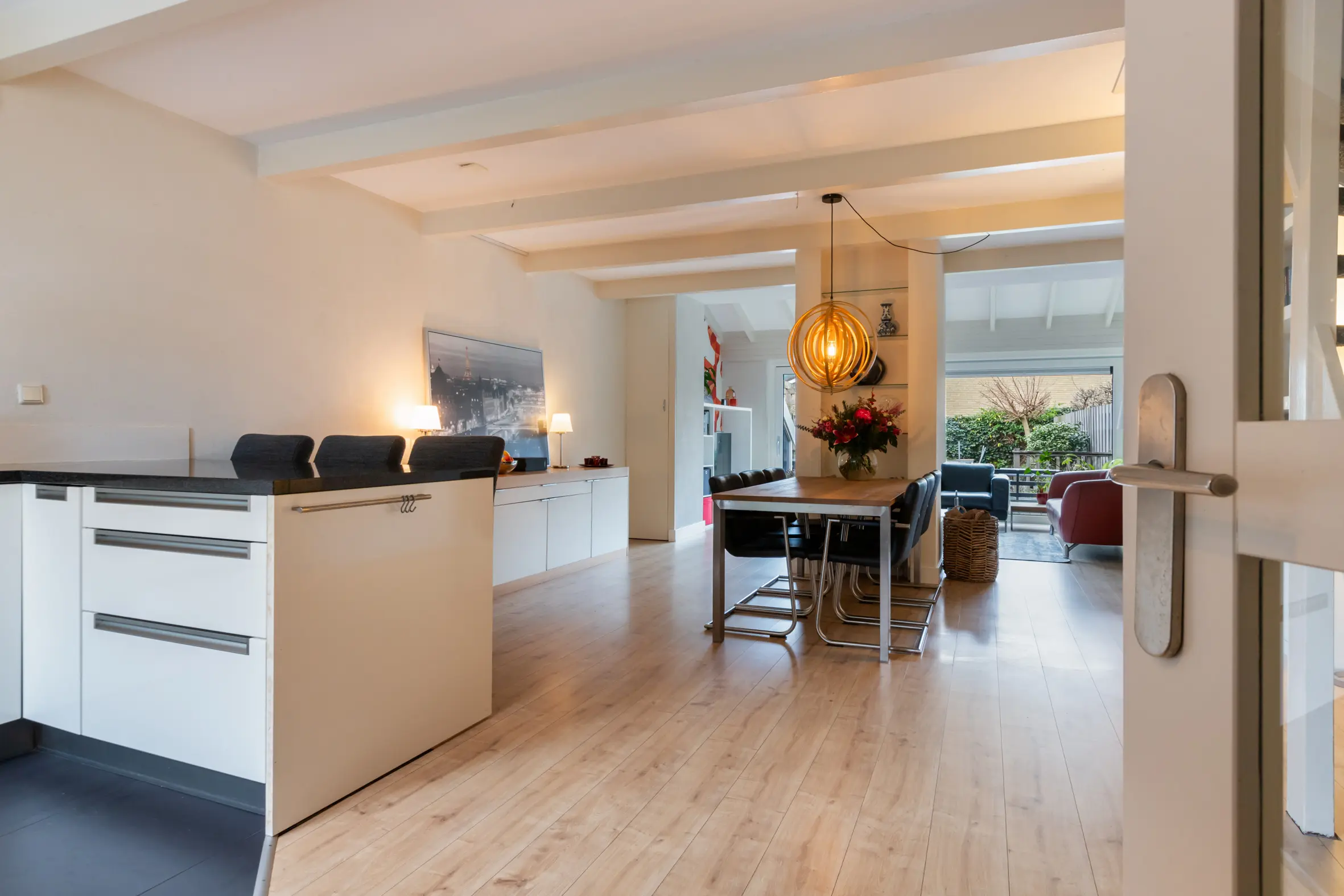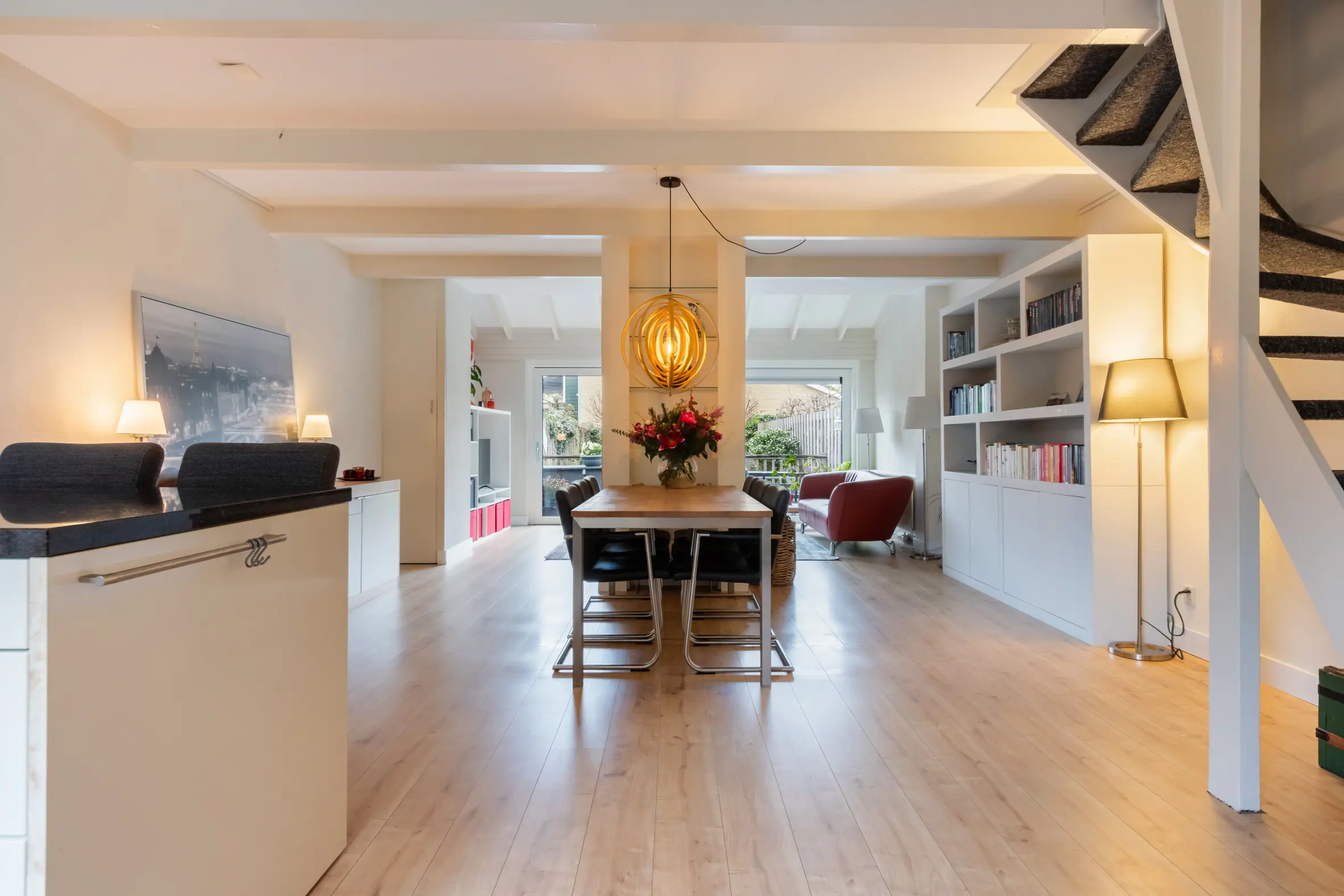 De uitgebouwde woonkamer is ruim, licht en sfeervol. De open haard vormt een prettig middelpunt en dankzij de grote, vernieuwde schuifpui is er veel daglicht en een fijne verbinding met de achtertuin. Aan de voorzijde van de woning bevindt zich de keuken, voorzien van plintverwarming, een gezellig barretje en diverse inbouwapparatuur, waaronder een combimagnetronoven, een 5-pits gasfornuis met wokbrander, afzuigkap, vaatwasser en koelkast. Er is voldoende ruimte voor een grote eettafel, waardoor de begane grond een echte leefverdieping vormt.