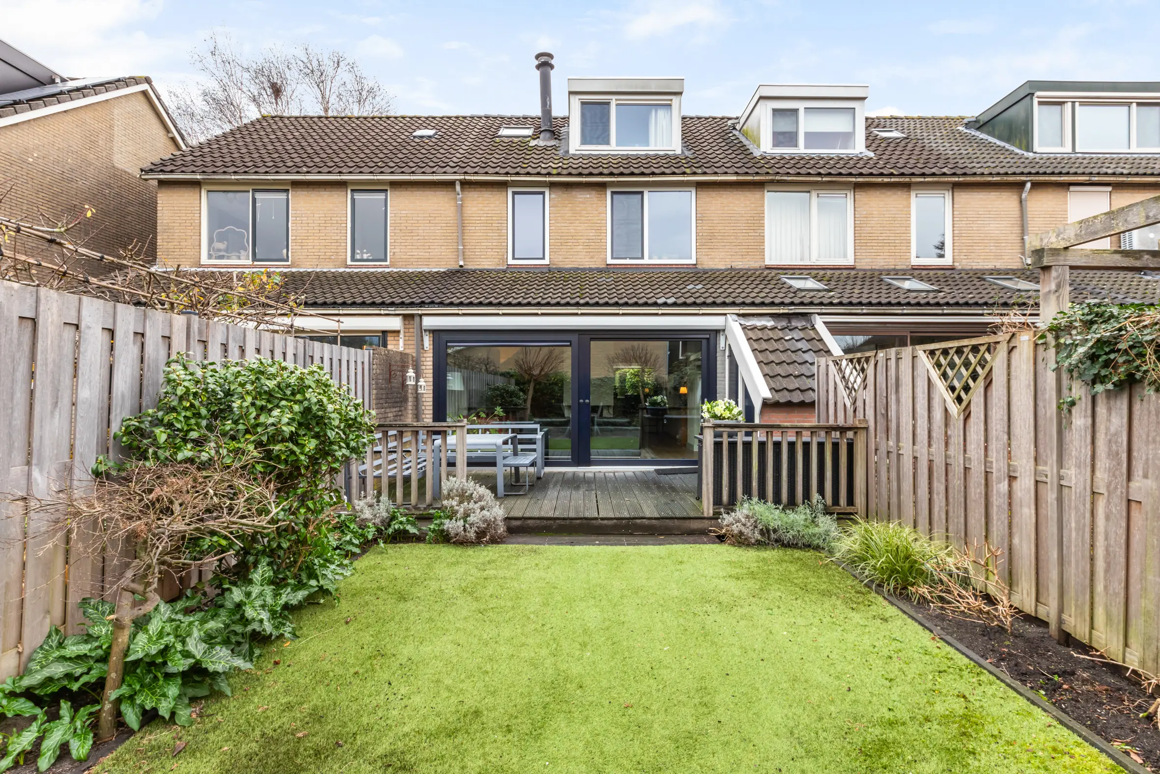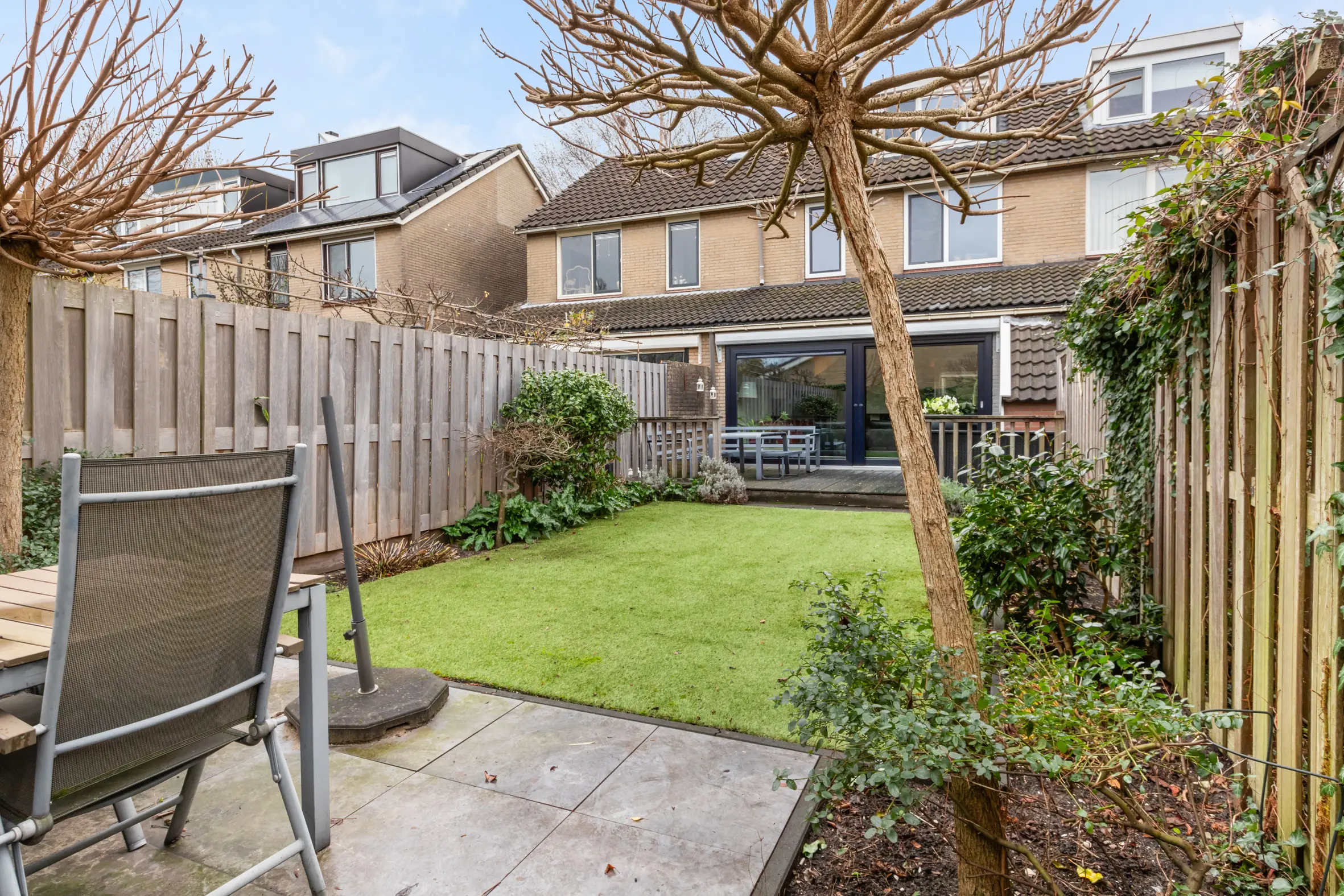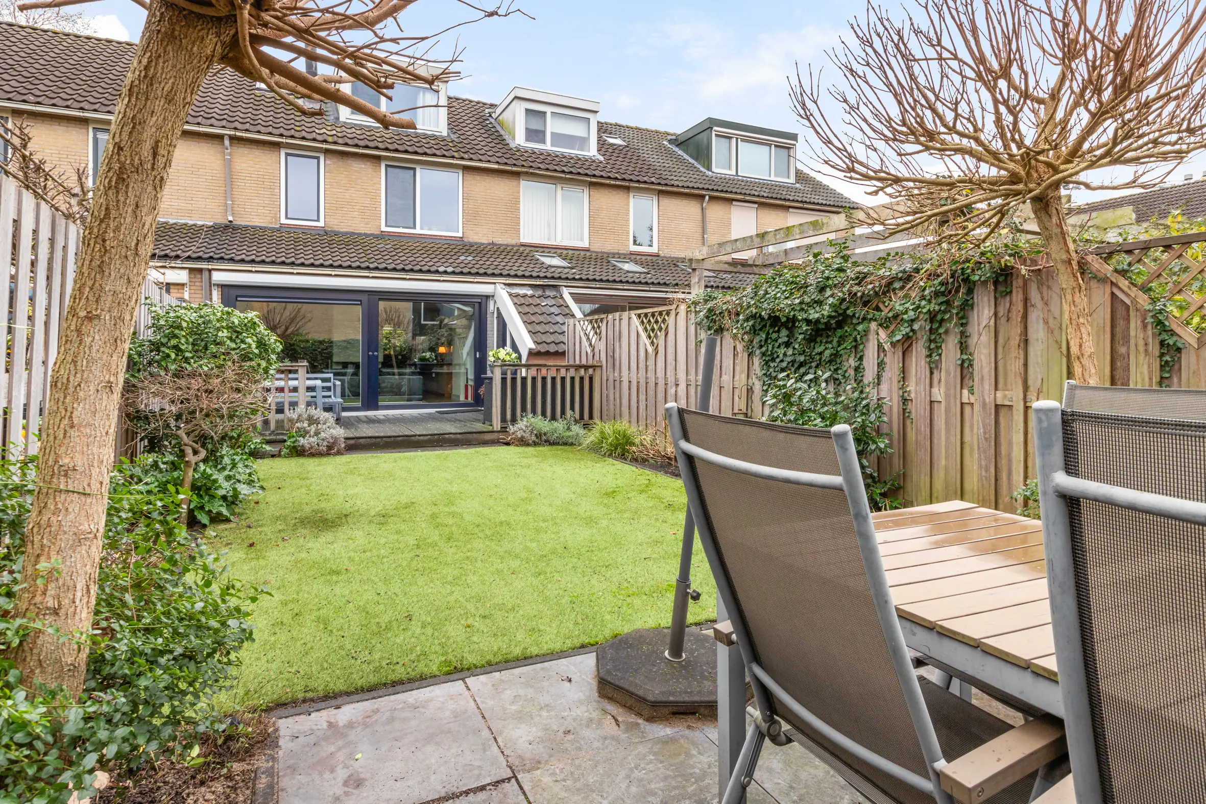 De achtertuin is in 2021 opnieuw aangelegd en verzorgd ingericht. Dankzij de ligging op het westen is het hier heerlijk zonnig. De tuin beschikt over een vlonderterras, kunstgras en een tweede terras achterin, waardoor er altijd een fijne plek is om te zitten. Verder zijn er elektra, een tuinkast en een elektrisch zonnescherm aanwezig. In de voortuin is parkeergelegenheid op eigen terrein, wat het woongenot compleet maakt.
