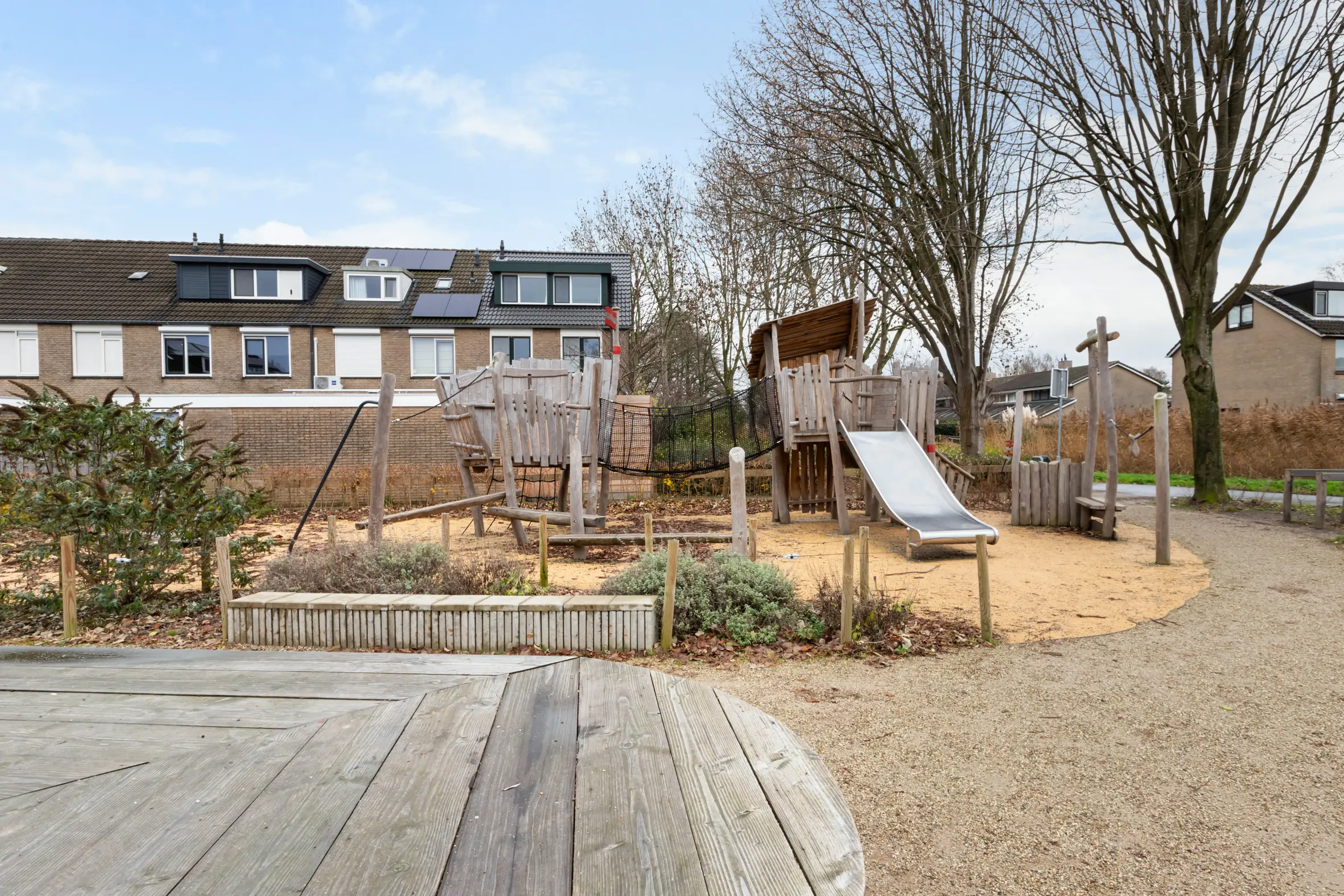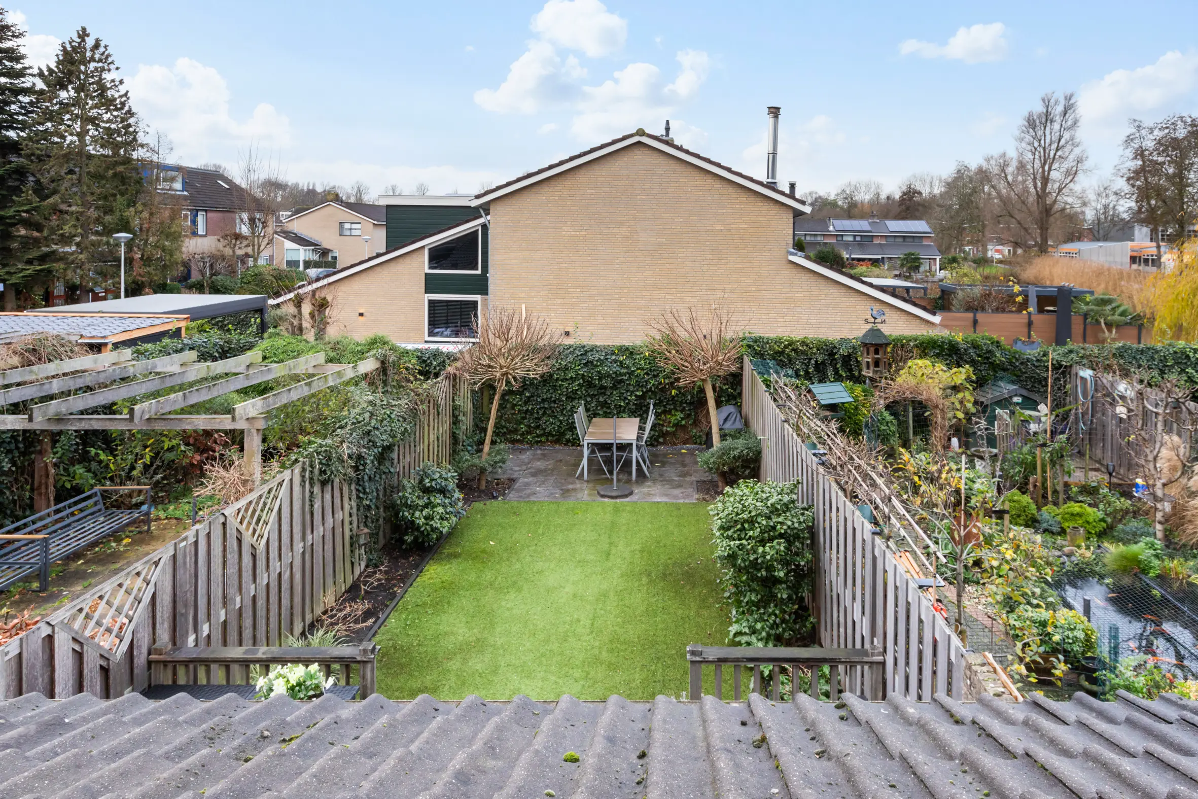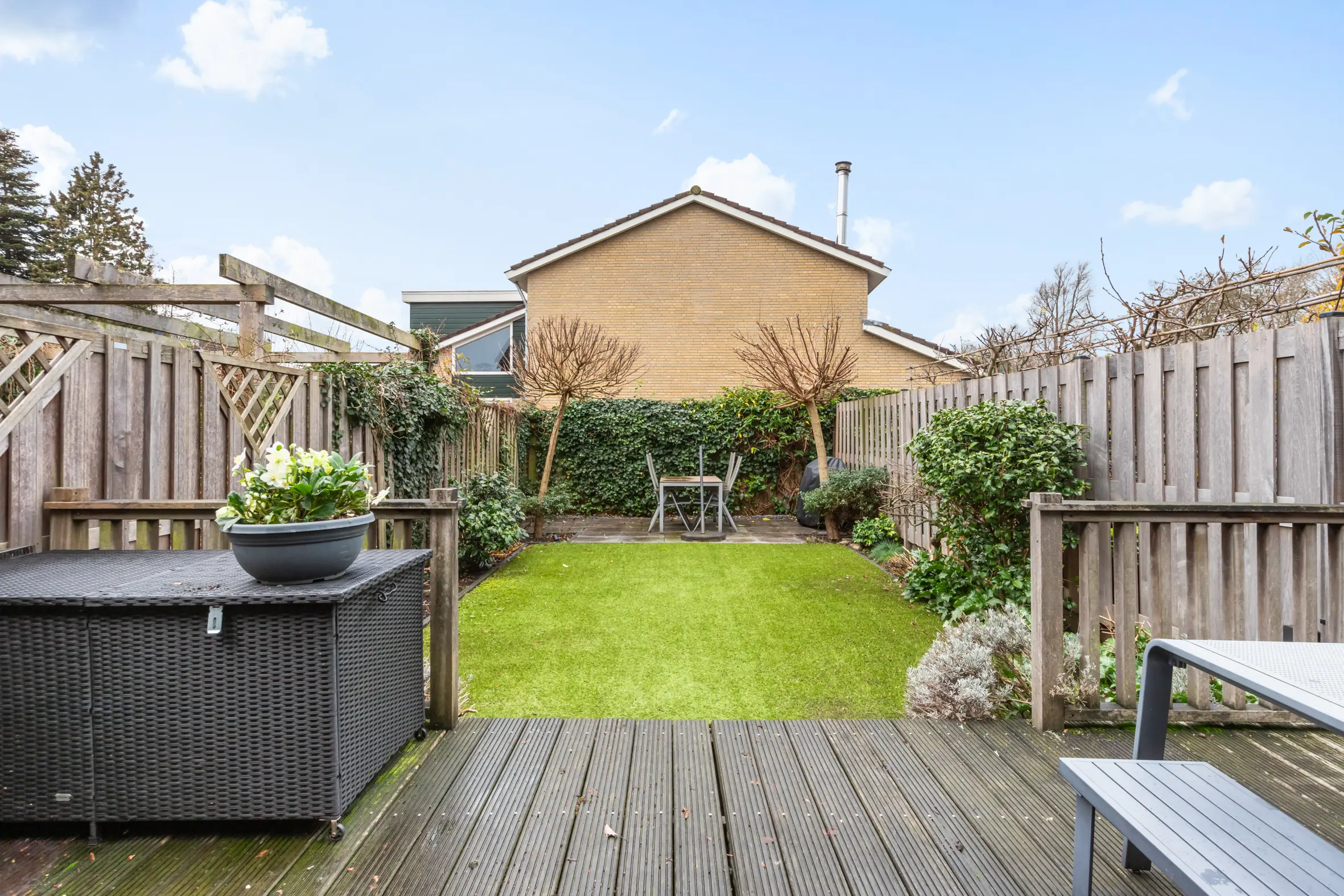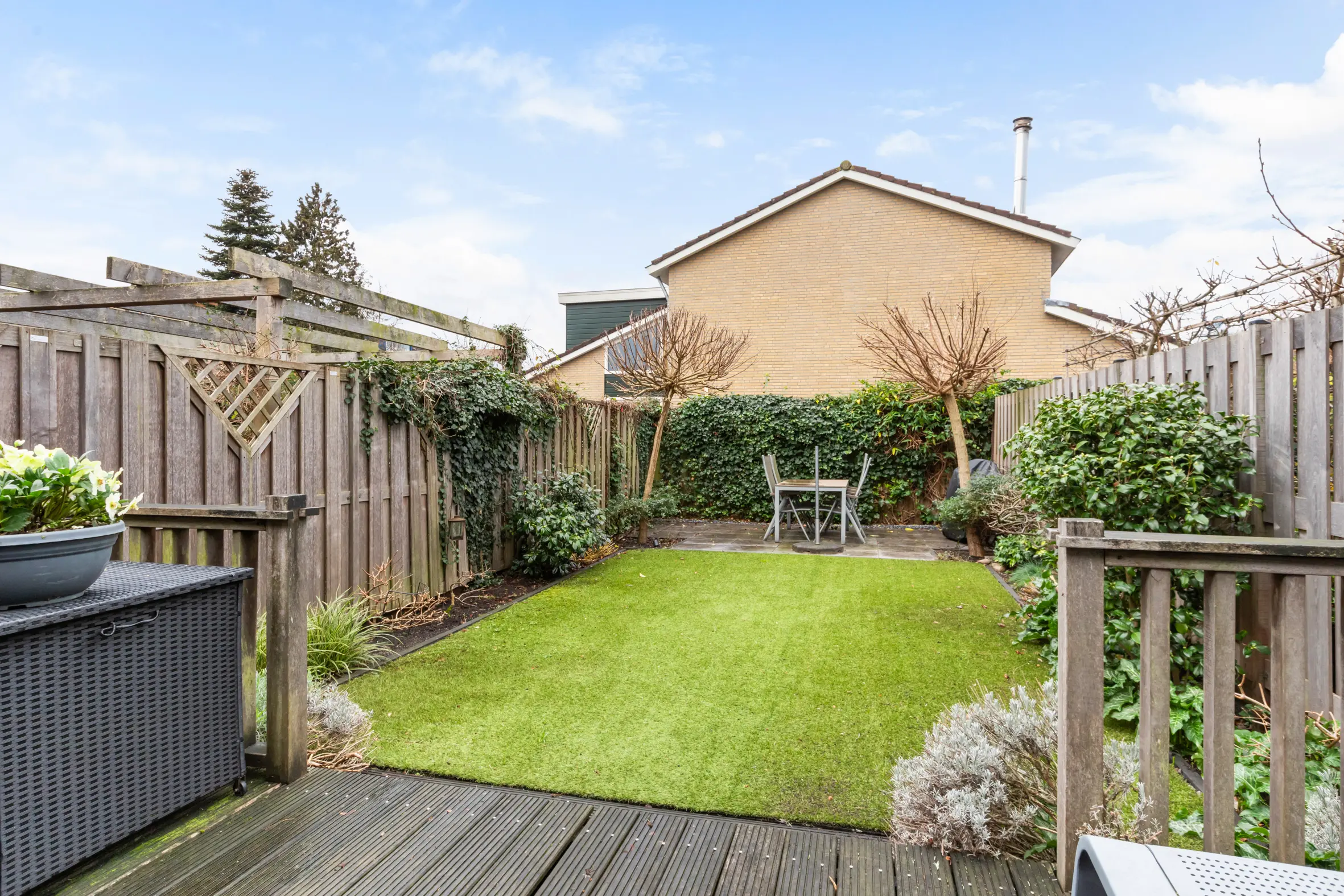 De achtertuin is in 2021 opnieuw aangelegd en verzorgd ingericht. Dankzij de ligging op het westen is het hier heerlijk zonnig. De tuin beschikt over een vlonderterras, kunstgras en een tweede terras achterin, waardoor er altijd een fijne plek is om te zitten. Verder zijn er elektra, een tuinkast en een elektrisch zonnescherm aanwezig. In de voortuin is parkeergelegenheid op eigen terrein, wat het woongenot compleet maakt.
