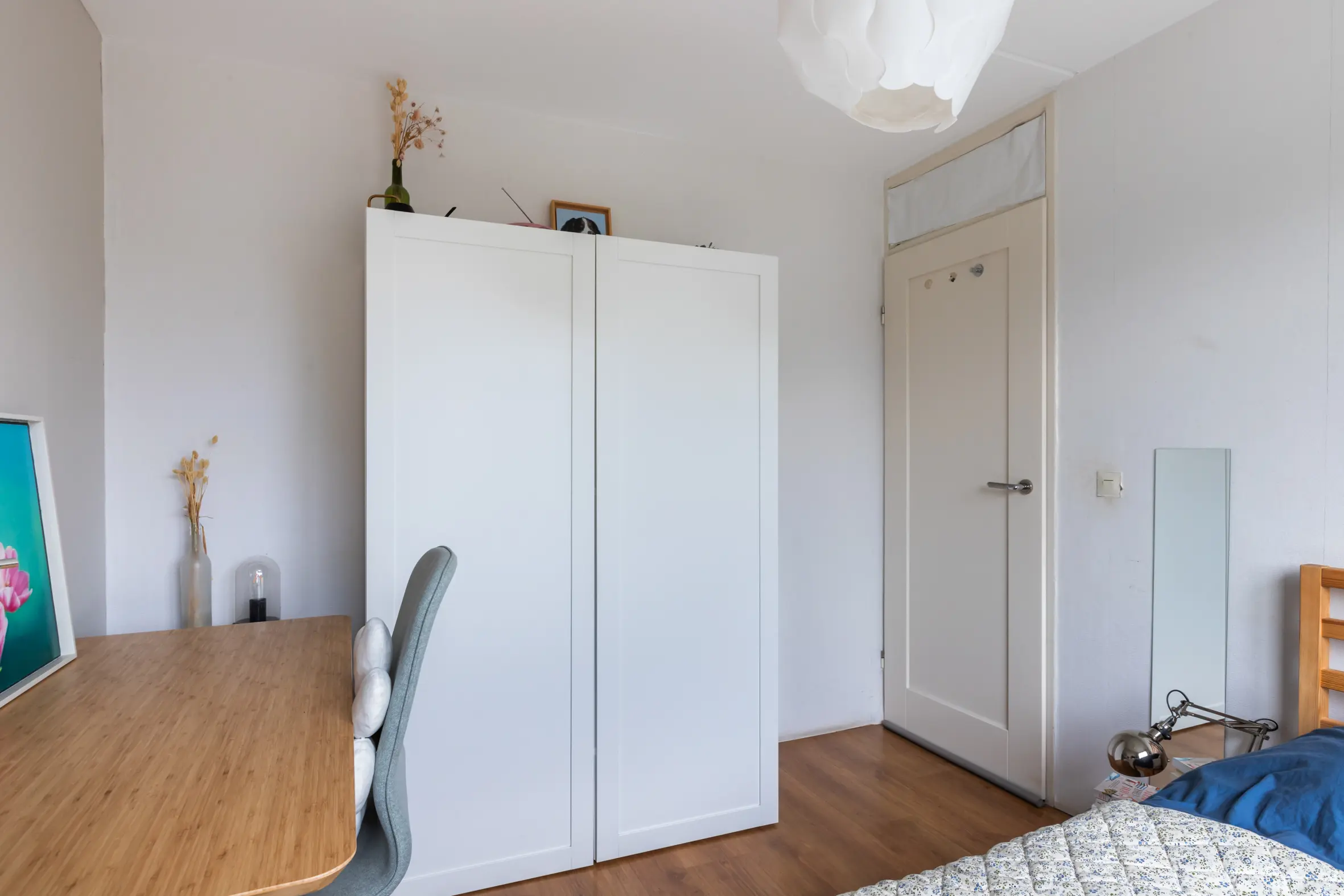 Op de eerste verdieping bevinden zich twee slaapkamers. De royale master bedroom is ontstaan door het samenvoegen van twee kamers en beschikt over een vaste schuifkast. Indien gewenst is deze ruimte eenvoudig weer op te splitsen, waardoor een extra slaapkamer kan worden gecreëerd. De ramen aan de achterzijde zijn in 2024 en 2025 vernieuwd en voorzien van HR++ glas. De tweede slaapkamer ligt aan de voorzijde. De moderne badkamer is compleet uitgevoerd met een inloopdouche, ligbad, tweede toilet, badmeubel, een spiegel met verlichting en verwarming en een designradiator.