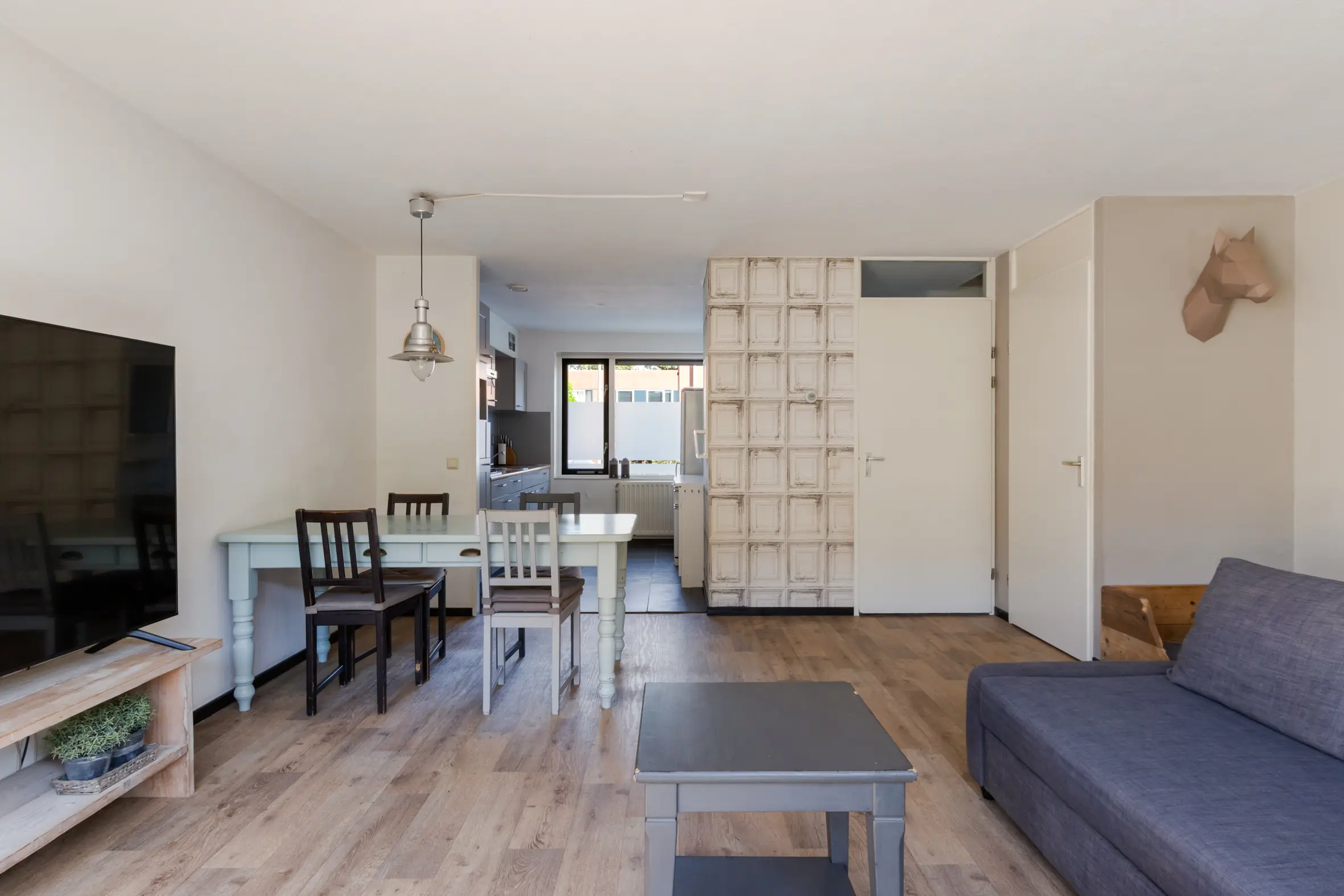Via de voortuin met parkeerplaats kom je binnen in de hal met meterkast, toilet en trapopgang. De hal biedt toegang tot de woonkamer. De woonkamer is licht en kijkt uit op de zonnige achtertuin. Aan de achterzijde is een aluminium schuifpui en een extra raam aanwezig. De half open keuken is voorzien van losse apparatuur en bevindt zich aan de voorzijde van de woning.
