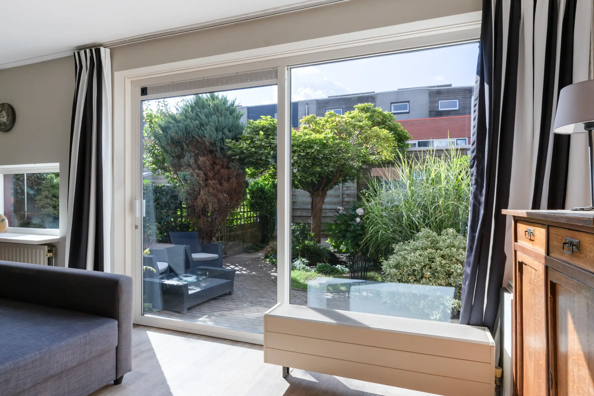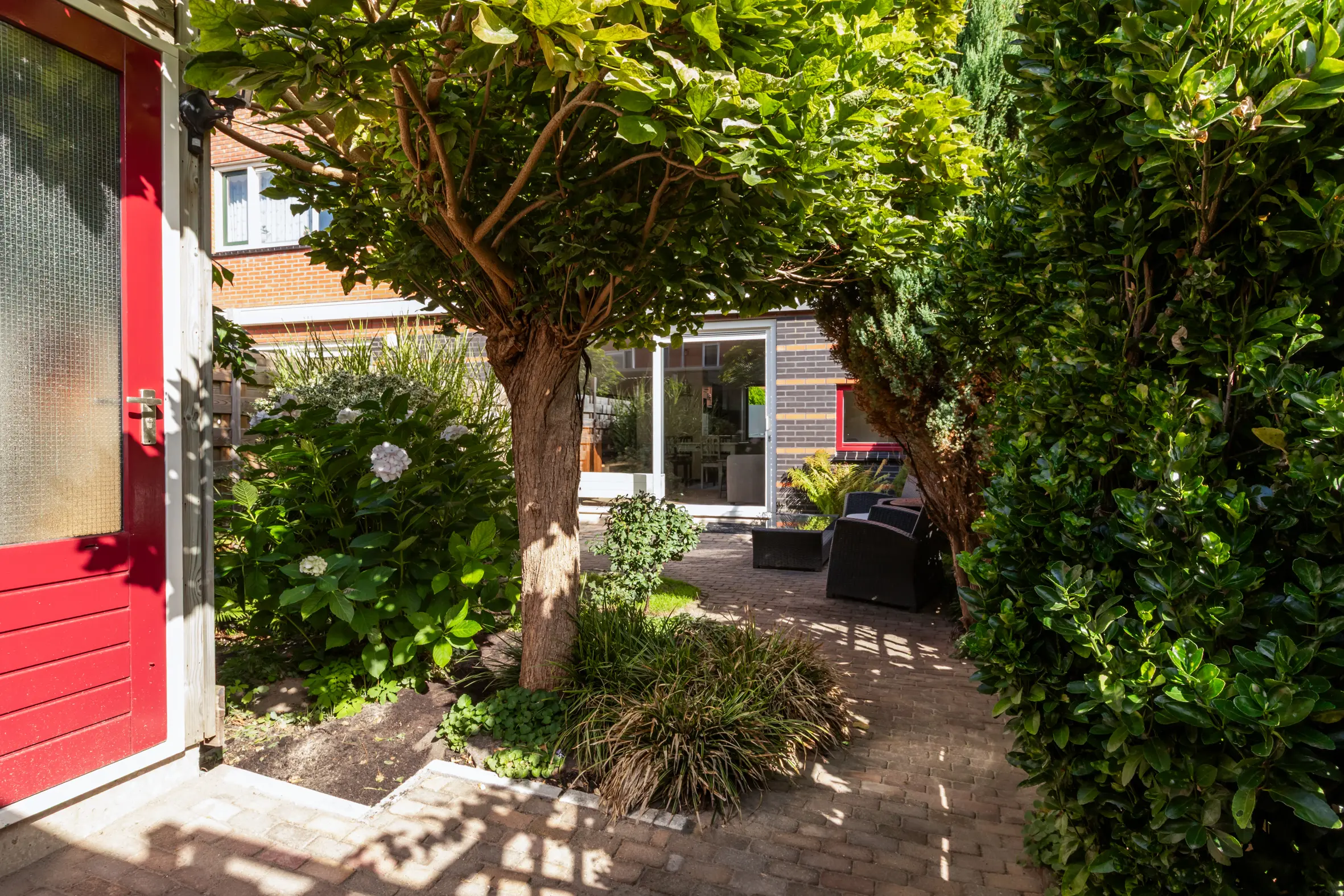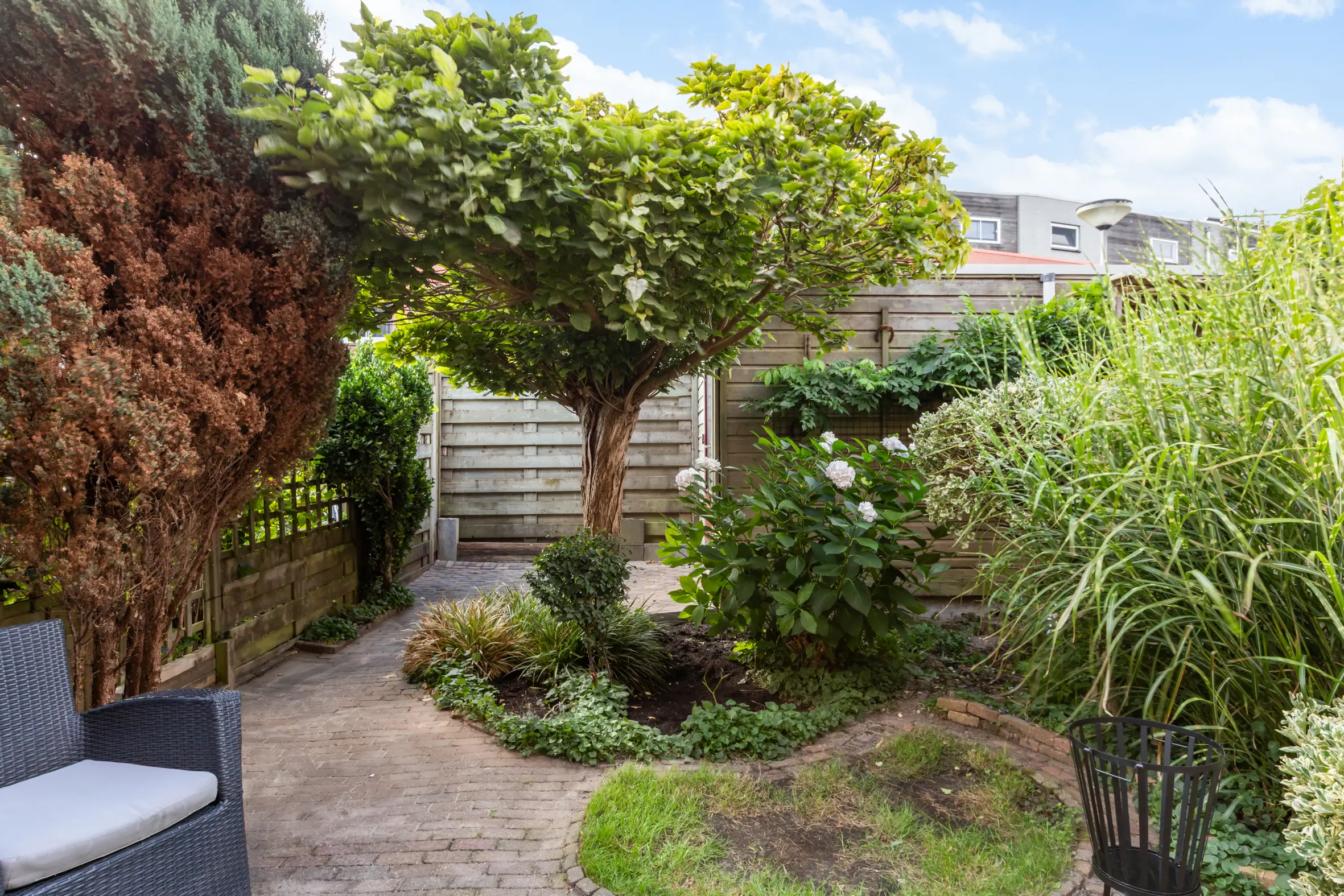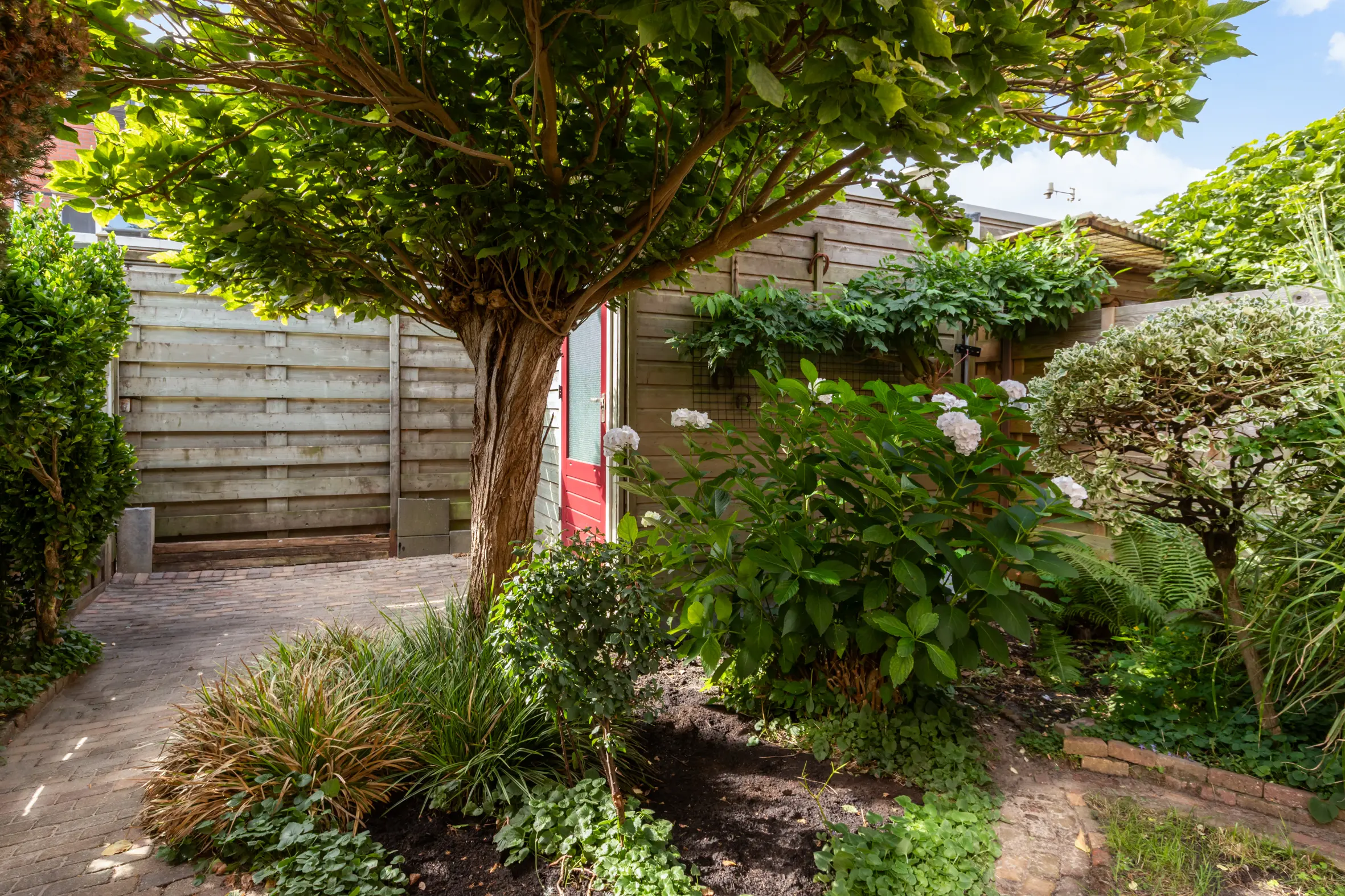 Via de aluminium schuifpui is de achtertuin te bereiken. De tuin van bijna 9 meter diep is zonnig gelegen en voorzien van een vrijstaande houten berging en een achterom. Voor de zonnige dagen is een zonwering aanwezig die voor verkoeling zorgt. De voortuin biedt parkeergelegenheid op eigen terrein.