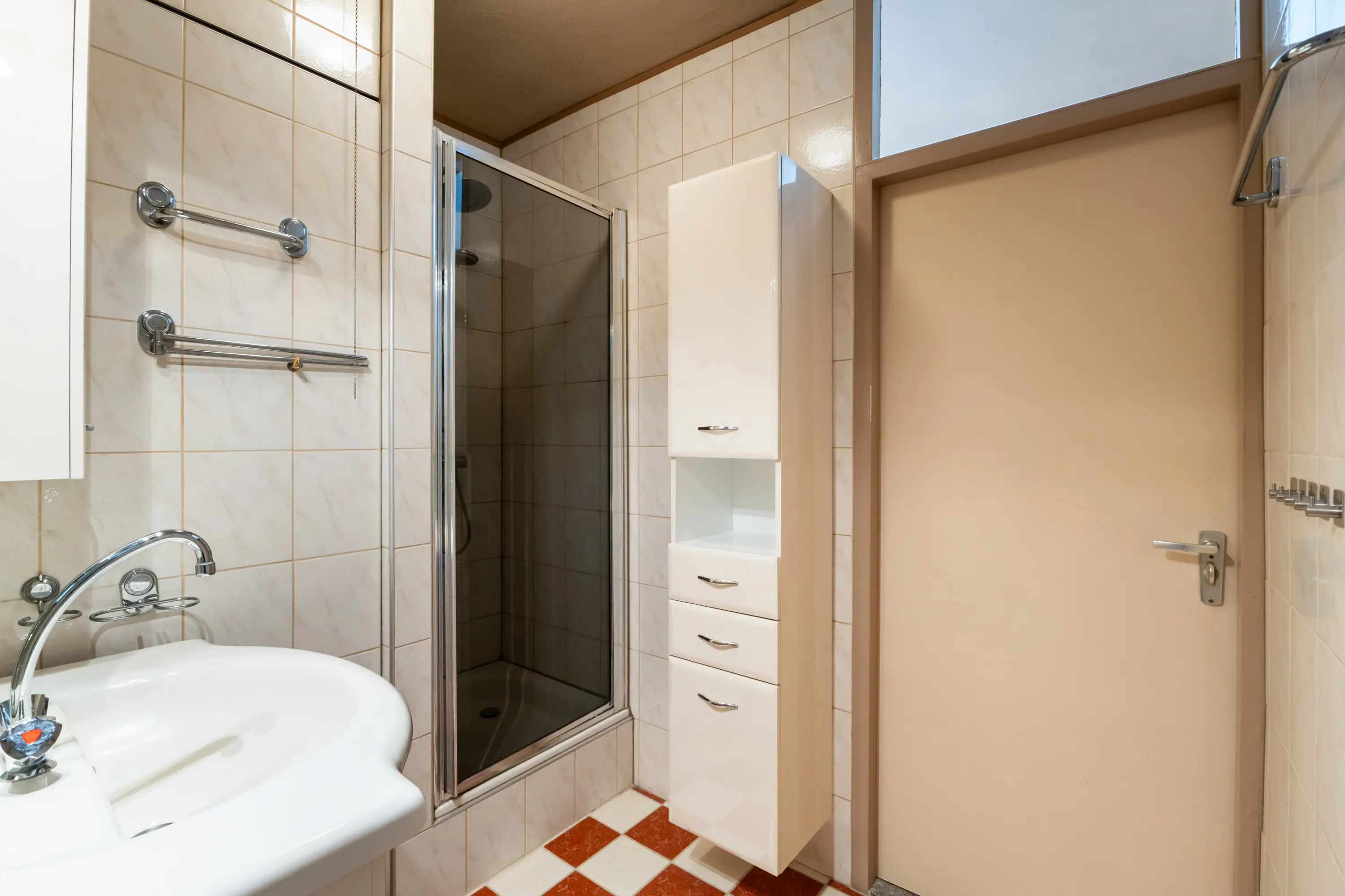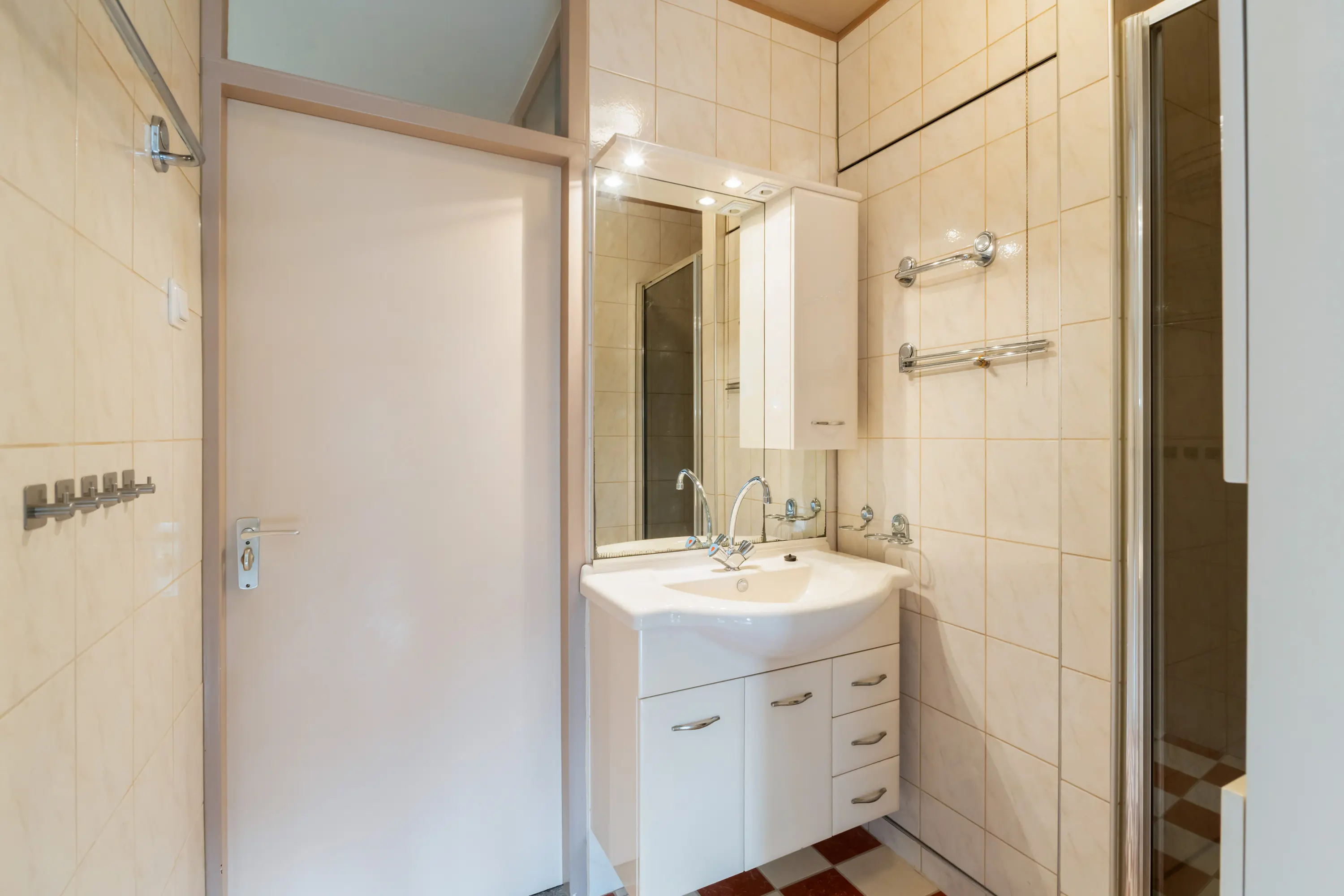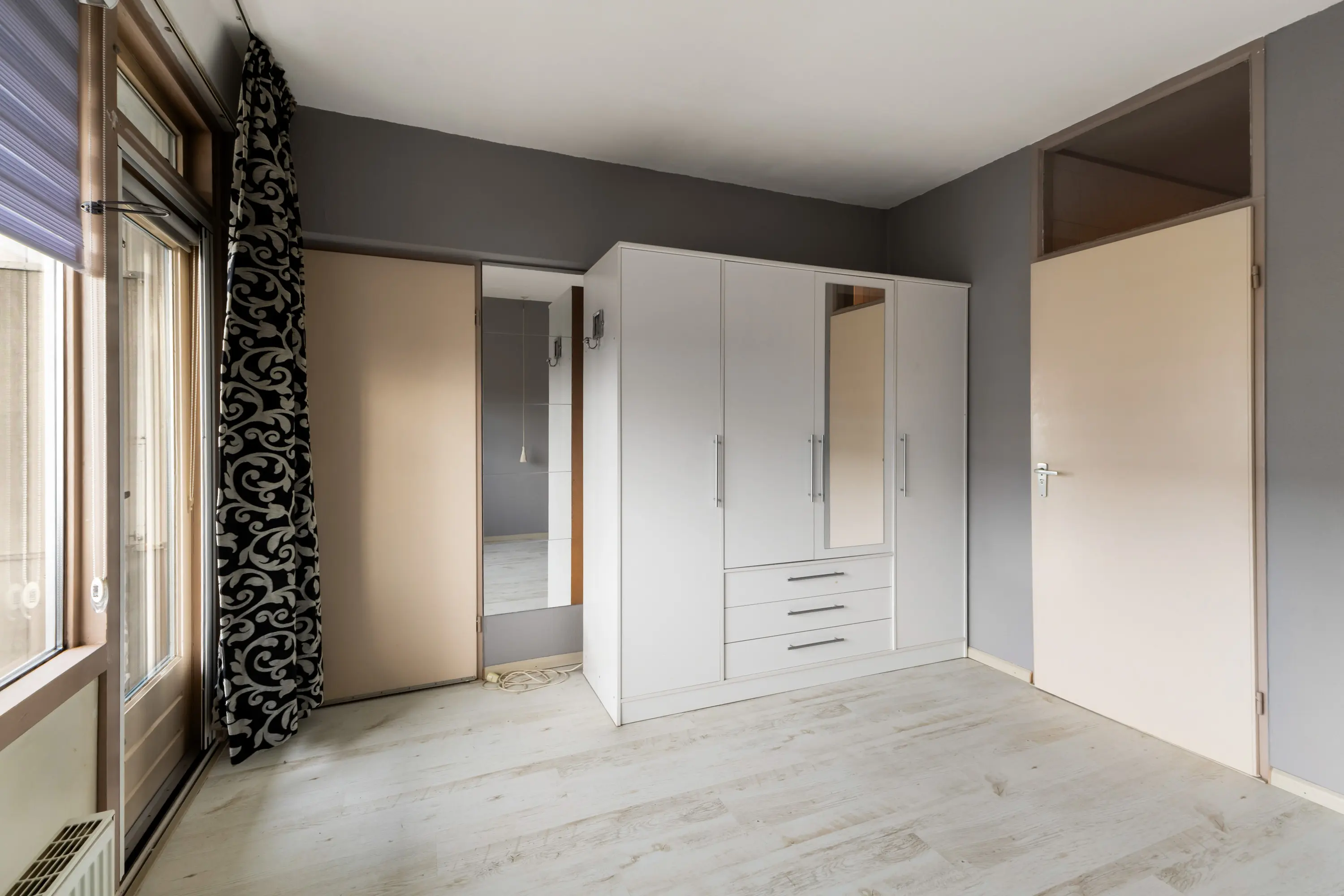 De grootste slaapkamer is te bereiken vanuit de woonkamer en vanuit de badkamer. Deze kamer is voorzien van een laminaat vloer, deur naar balkon met hordeur. Het gestreepte zonnescherm met elektrische bediening houdt de zon uit de kamer. Het balkon ligt op het westen, ideaal voor zon in de middag en avond. Hier geniet je van het open uitzicht en de rustige ligging. De badkamer (2005) is geheel betegeld en heeft een douchecabine en een wastafelmeubel.