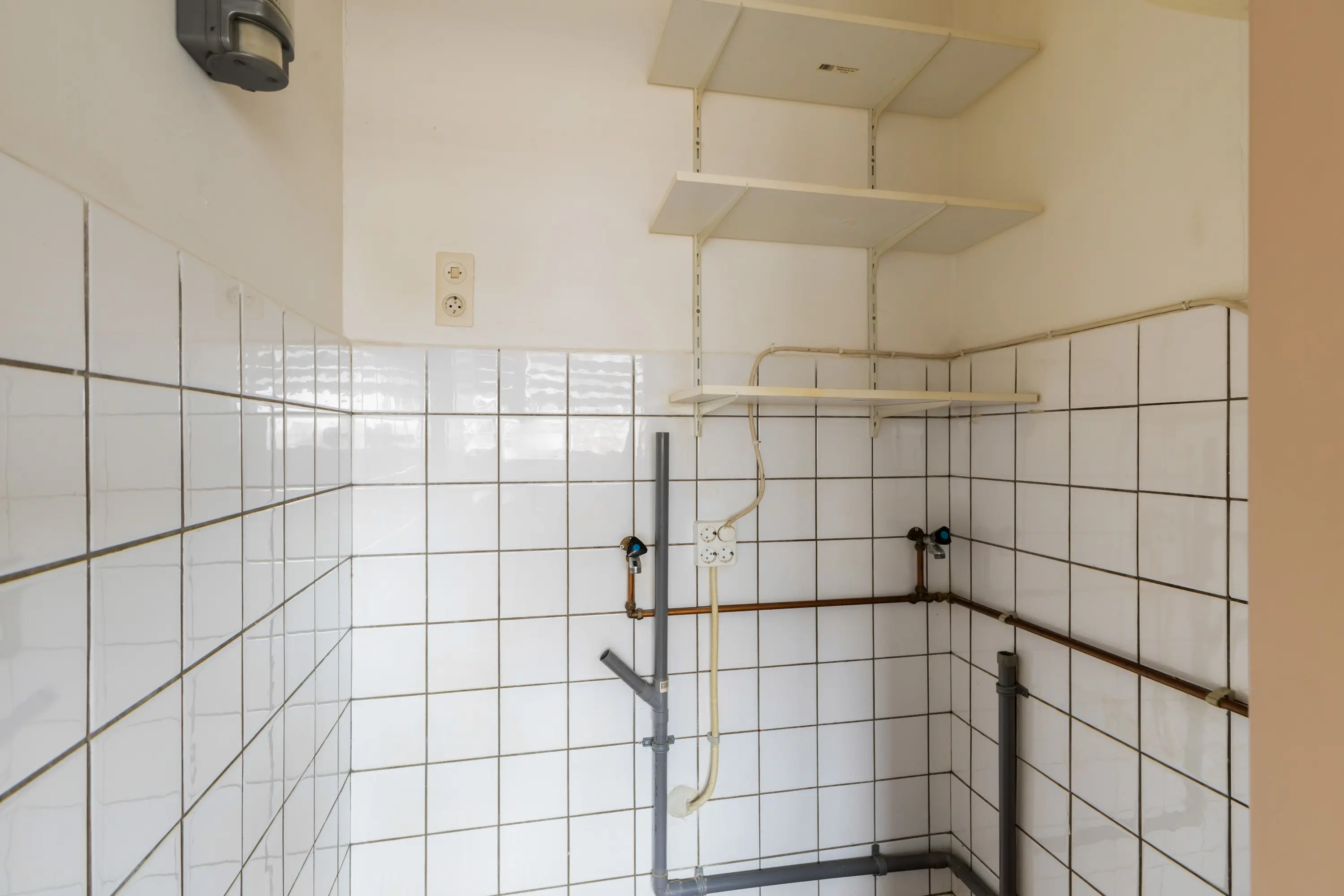 In de keuken is een voorraadkast aanwezig met daarin de aansluiting voor de wasmachine en een boiler voor het warme water in de keuken.
