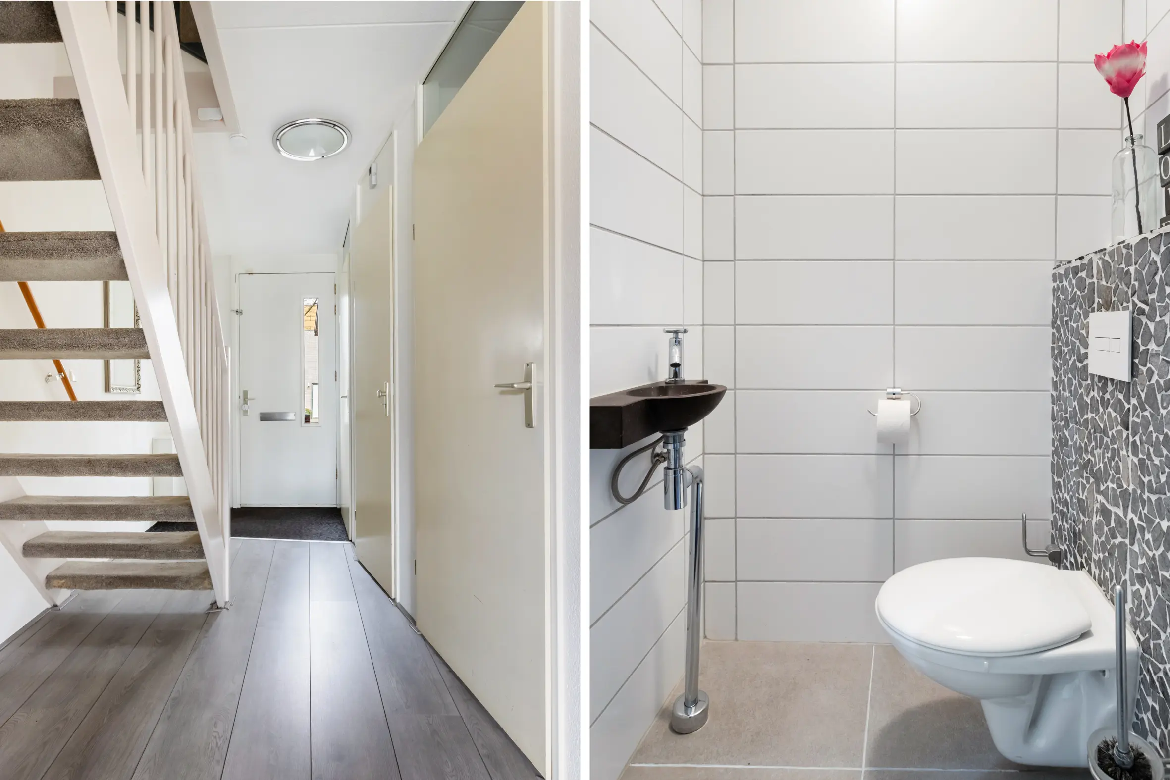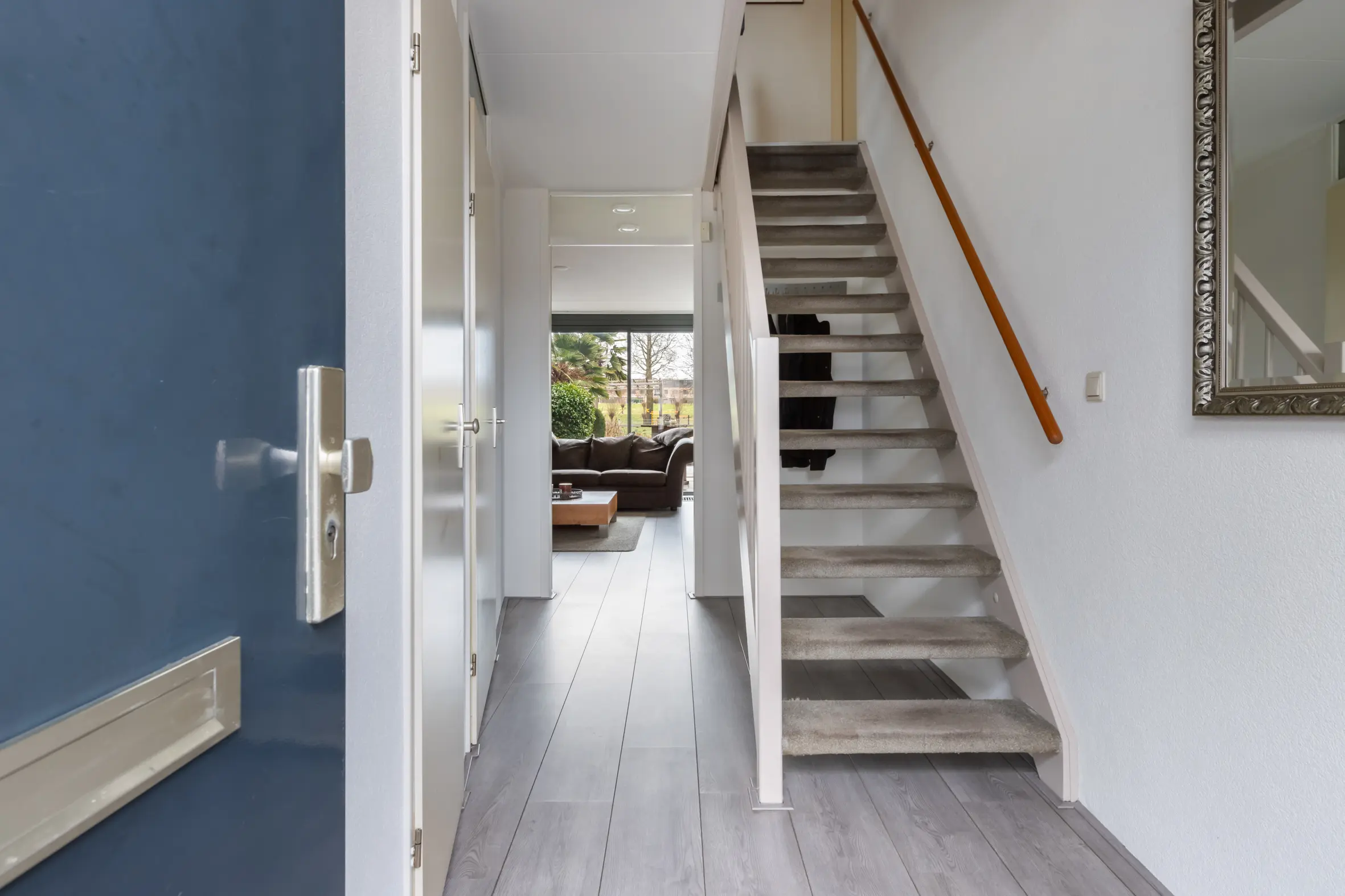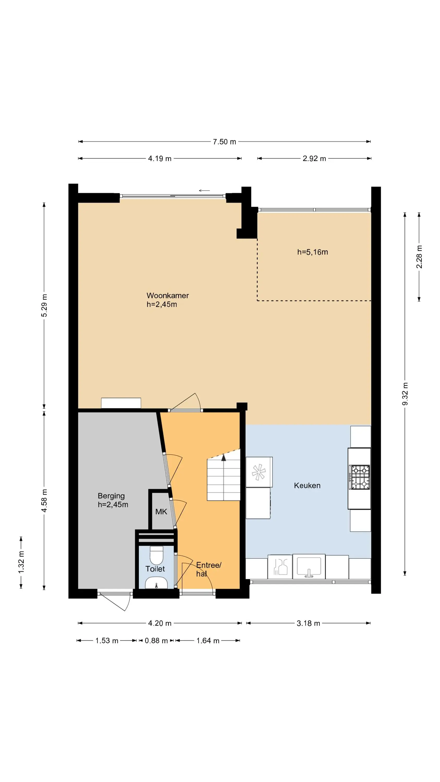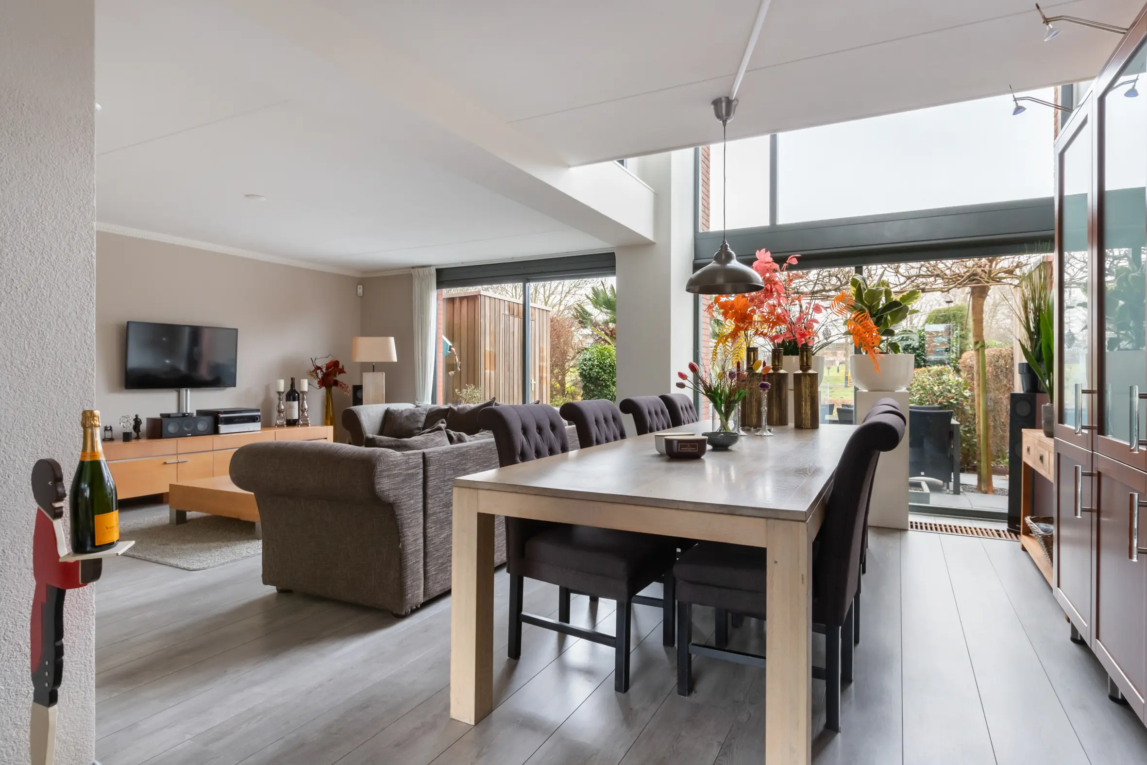 Entree in de hal met trapopgang naar de 1e verdieping, meterkast, toilet met fonteintje en deur naar de inpandige berging van ca. 8,6 m². Vanuit de hal stap je de ruime en sfeervolle woonkamer binnen aan de achterzijde van de woning. De woonkamer is ca. 7,50 meter breed en beschikt over een schuifpui naar de tuin en een vide (ca. 5 meter hoog) met een hoge raampartij waardoor er veel natuurlijk licht binnen valt én je ook nog eens vrij uitzicht hebt. Er is voldoende ruimte voor een heerlijke zithoek en een ruime eettafel.