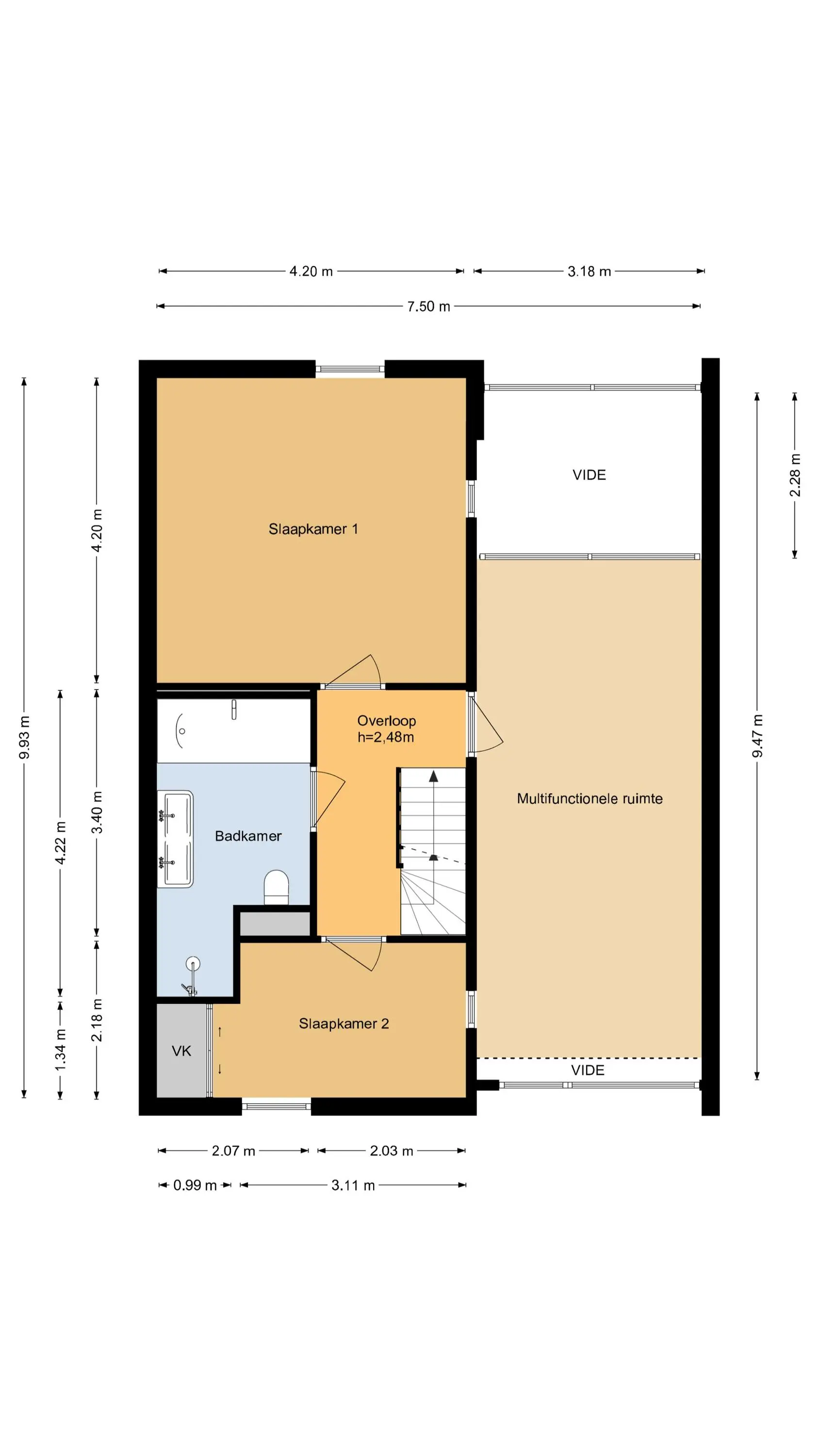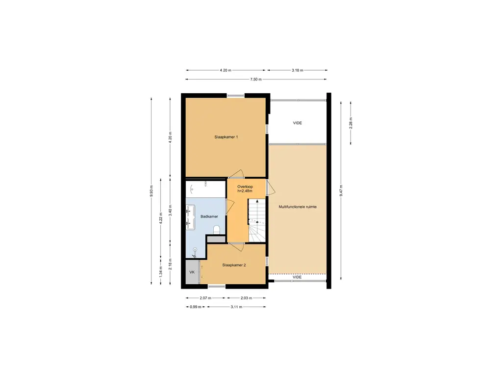 Vanaf de overloop is er toegang tot de vide, welke multi-inzetbaar is. De ideale plek voor een thuis-kantoor of speelkamer. In deze ruimte is een grote airco-unit geplaatst, welke ook de begane grond mee gekoeld krijgt. Aan de achterzijde van de woning is een grote slaapkamer van ca. 18 m². Aan de voorzijde ligt de 2e slaapkamer van ca. 8 m² voorzien van een schuifwandenkast. De inpandige badkamer is vergoot en voorzien van: