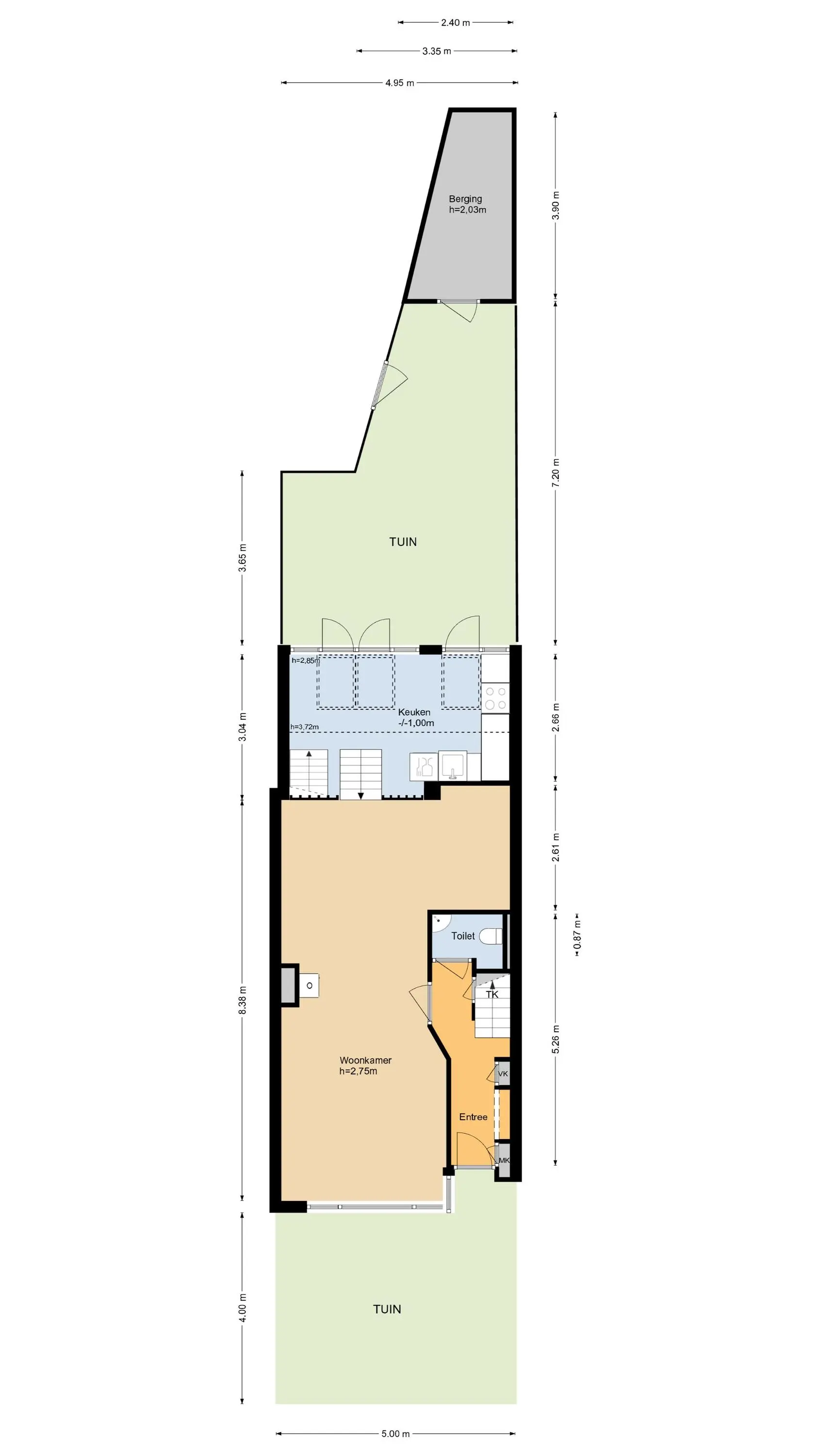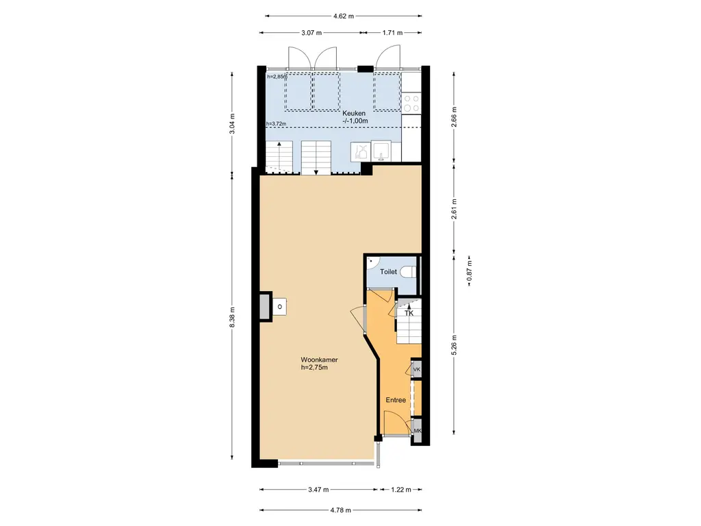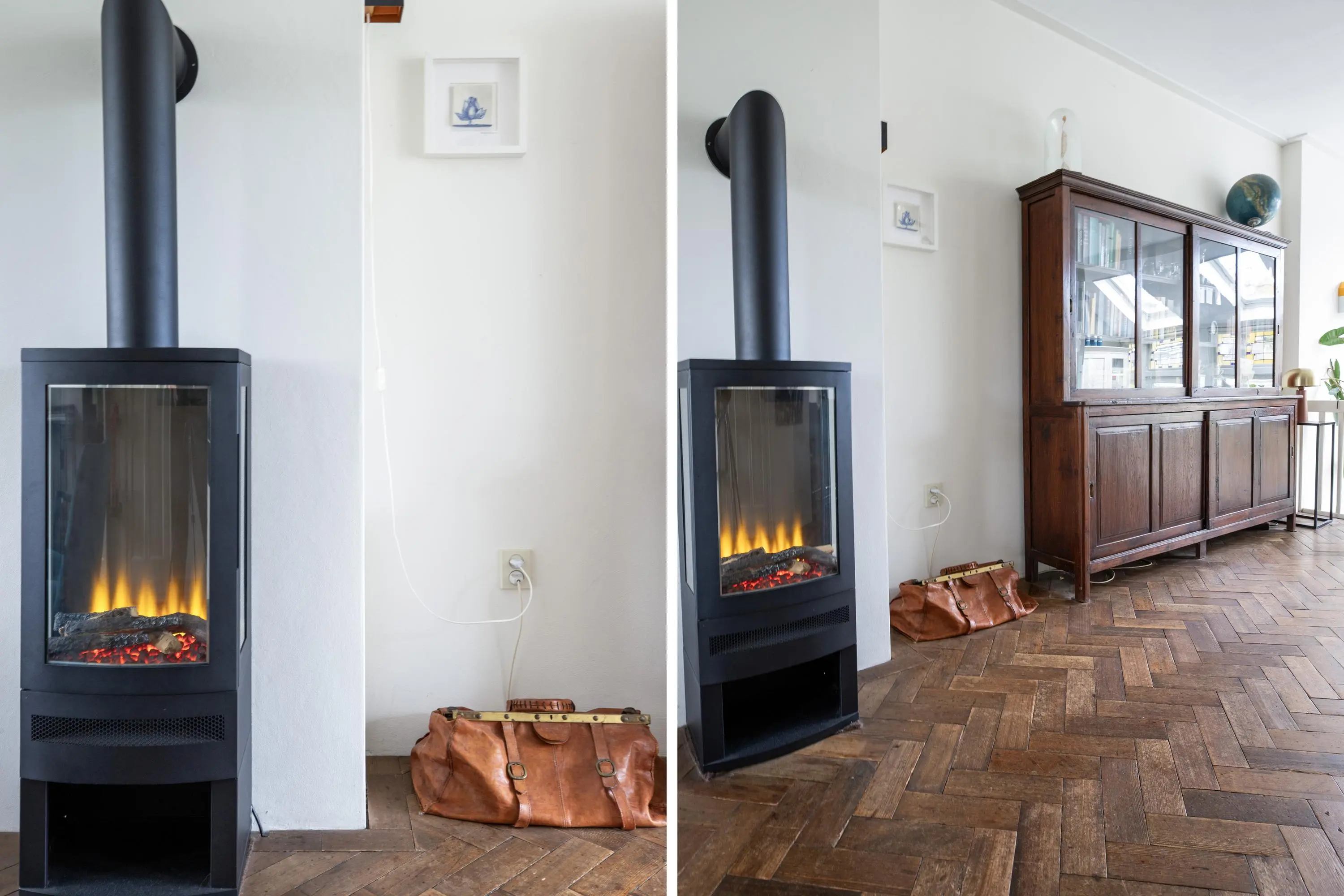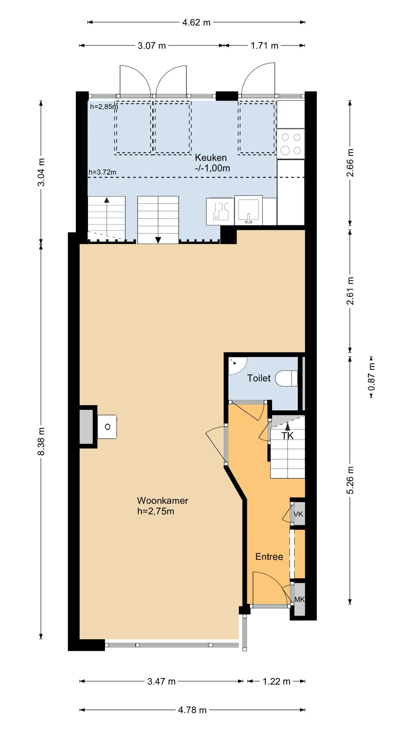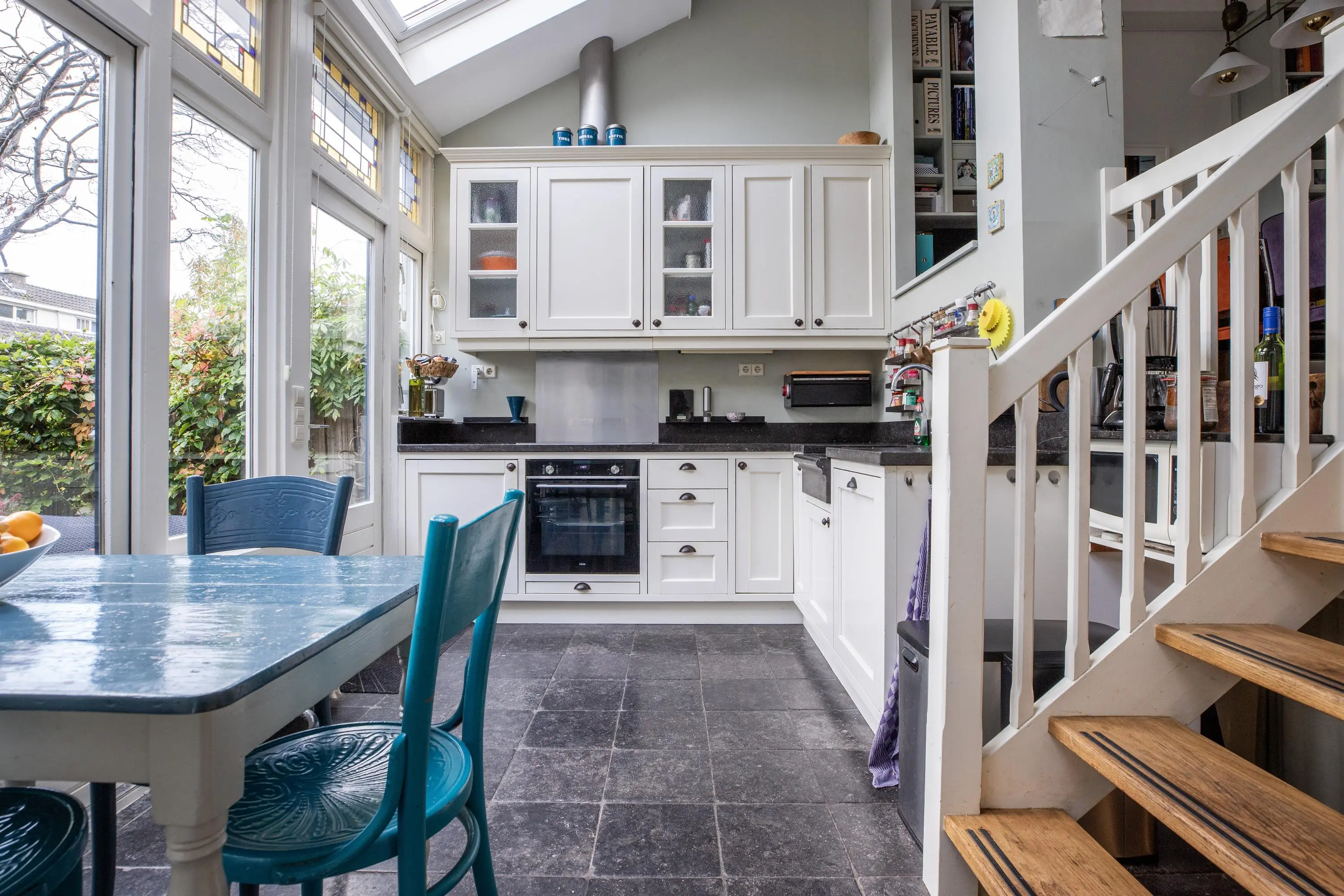 Binnenkomst in een nette entree met tegelvloer, garderobe, vernieuwde meterkast en een toiletruimte met fonteintje en mechanische ventilatie. De woonkamer is licht en sfeervol, met uitzicht op de Breevaart. Aan de achterzijde loopt de ruimte via een klein trapje over in de open keuken. De keuken bevindt zich in de aanbouw en heeft een prettig zitgedeelte. Dakramen zorgen voor extra lichtinval en zijn voorzien van elektrisch bedienbare rolluiken. De geïsoleerde betonvloer is voorzien van elektrische vloerverwarming. De keuken beschikt over de volgende apparatuur: