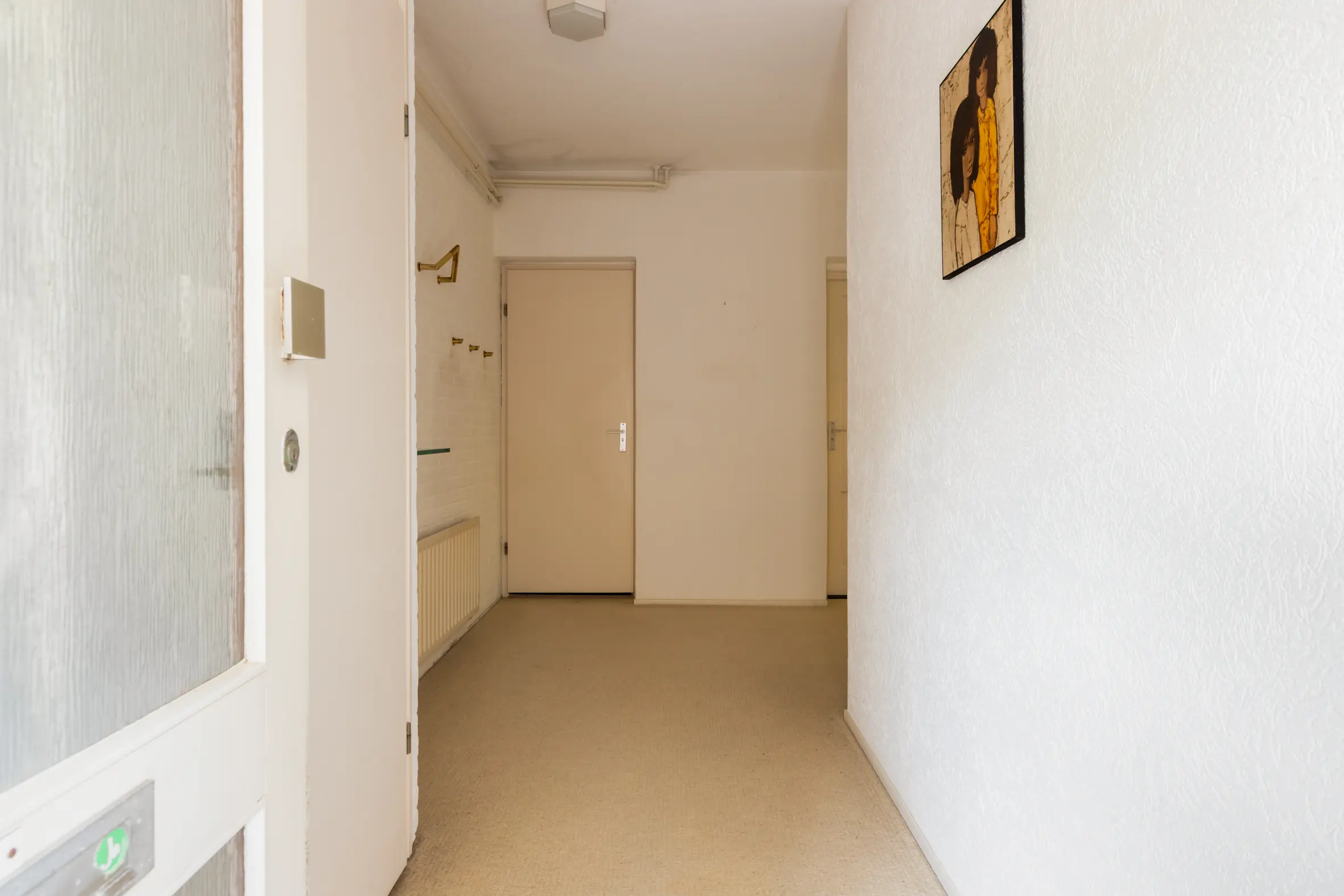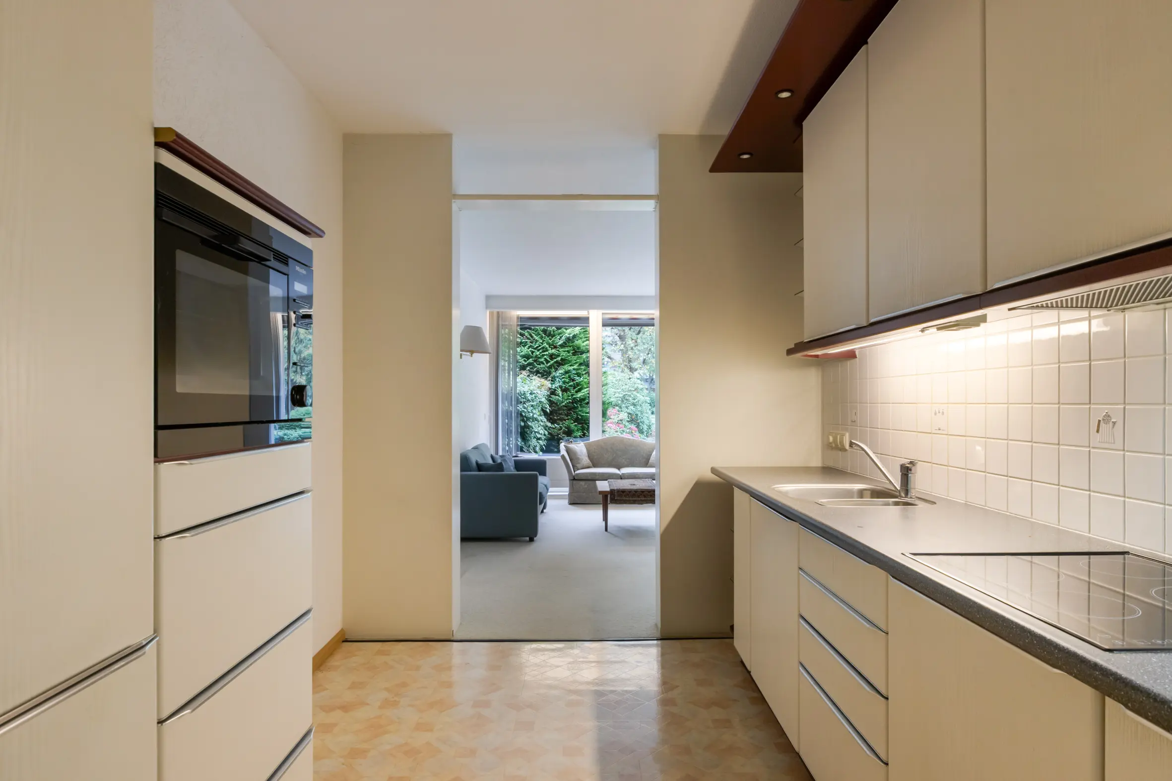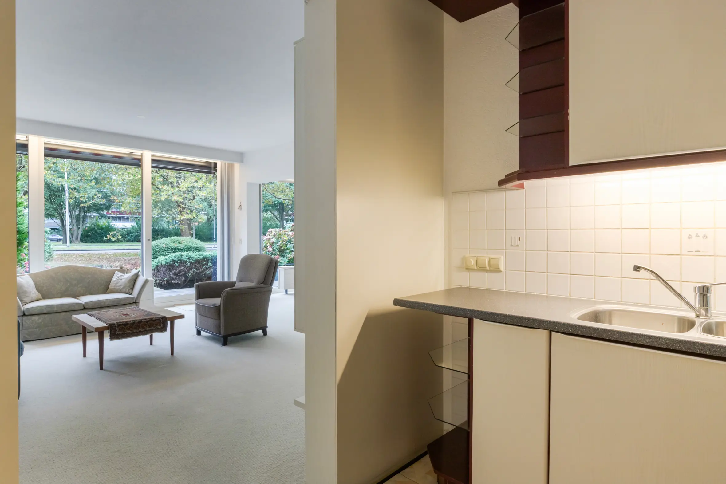 De woning heeft een eigen entree aan de zijkant van het appartementencomplex. Via de ruime hal zijn alle vertrekken bereikbaar. De woonkamer ligt aan de achterzijde van de woning, heeft uitzicht over de zeer riante tuin en is voorzien van vloerbedekking. Er ligt een onderhoudsvriendelijke vinyl vloer in de keuken. De keuken is voorzien van met inbouwapparatuur, zoals: