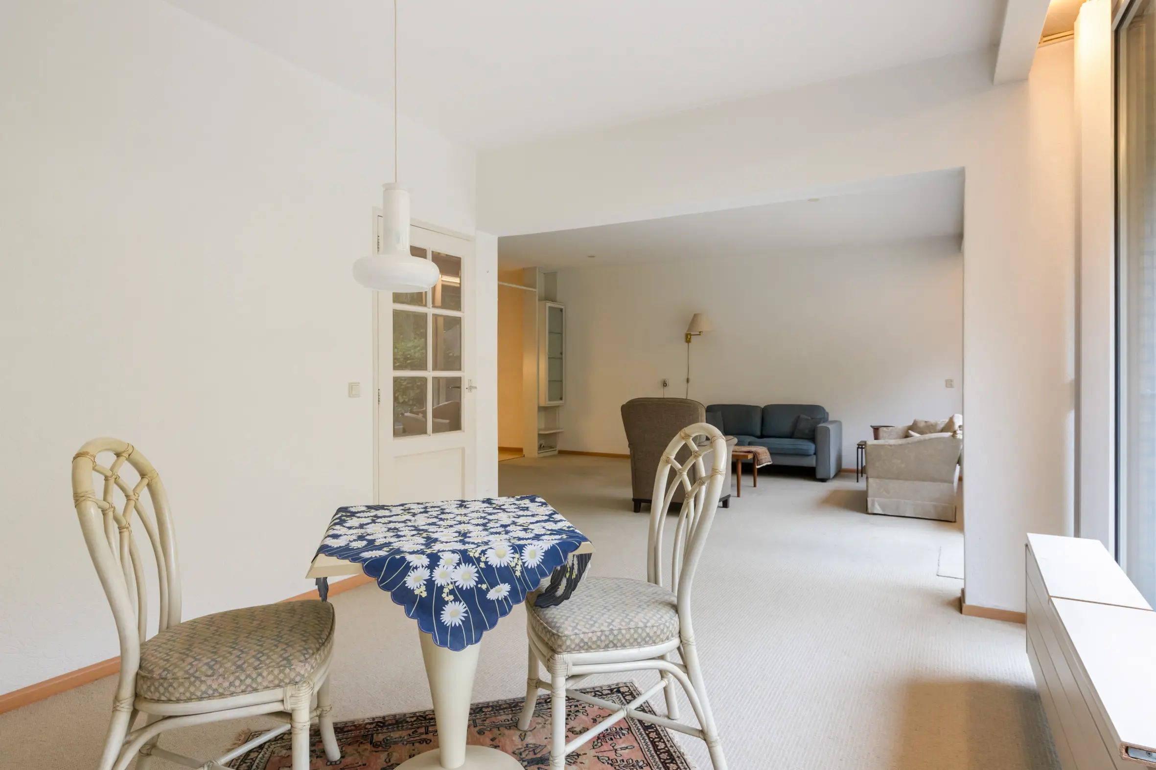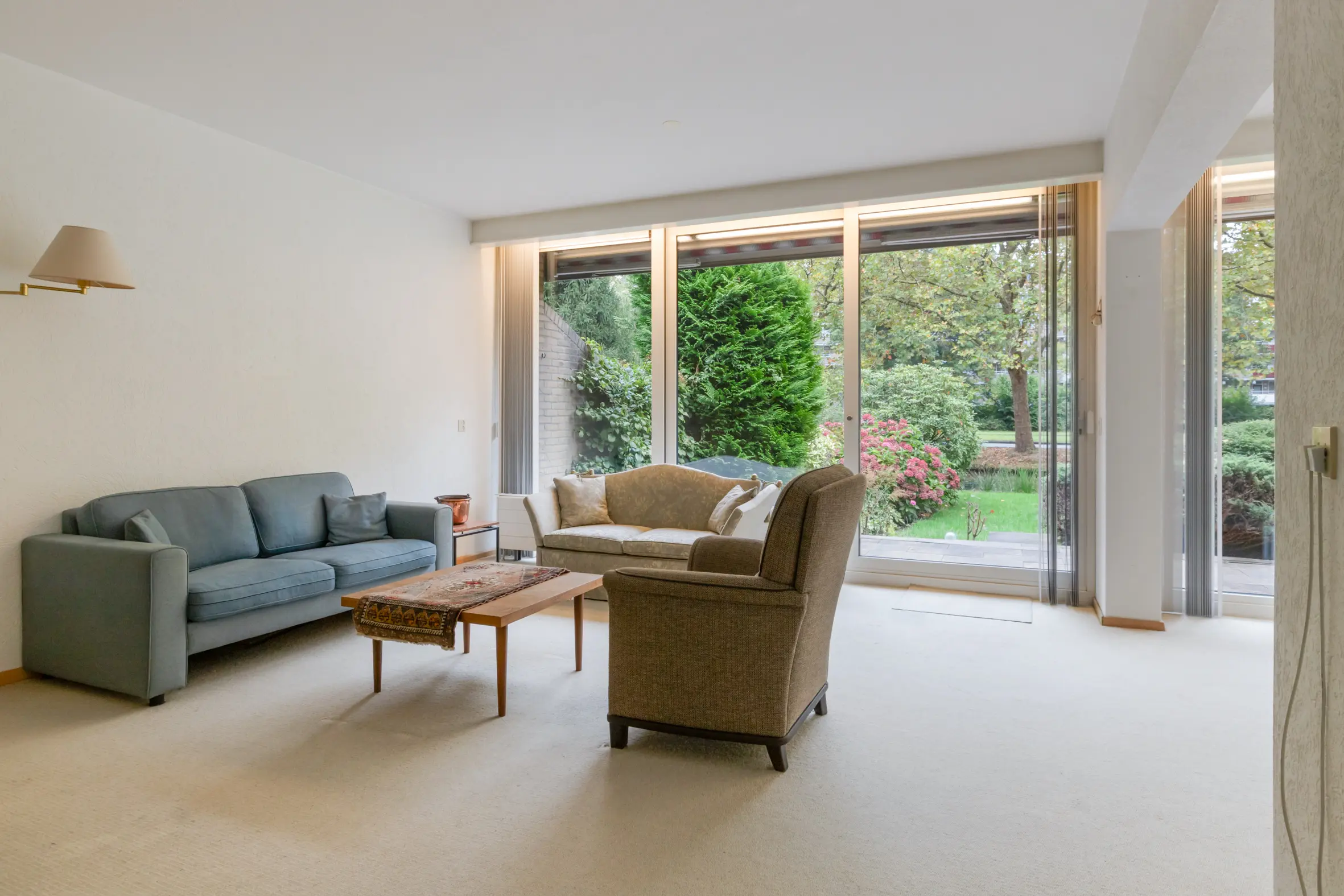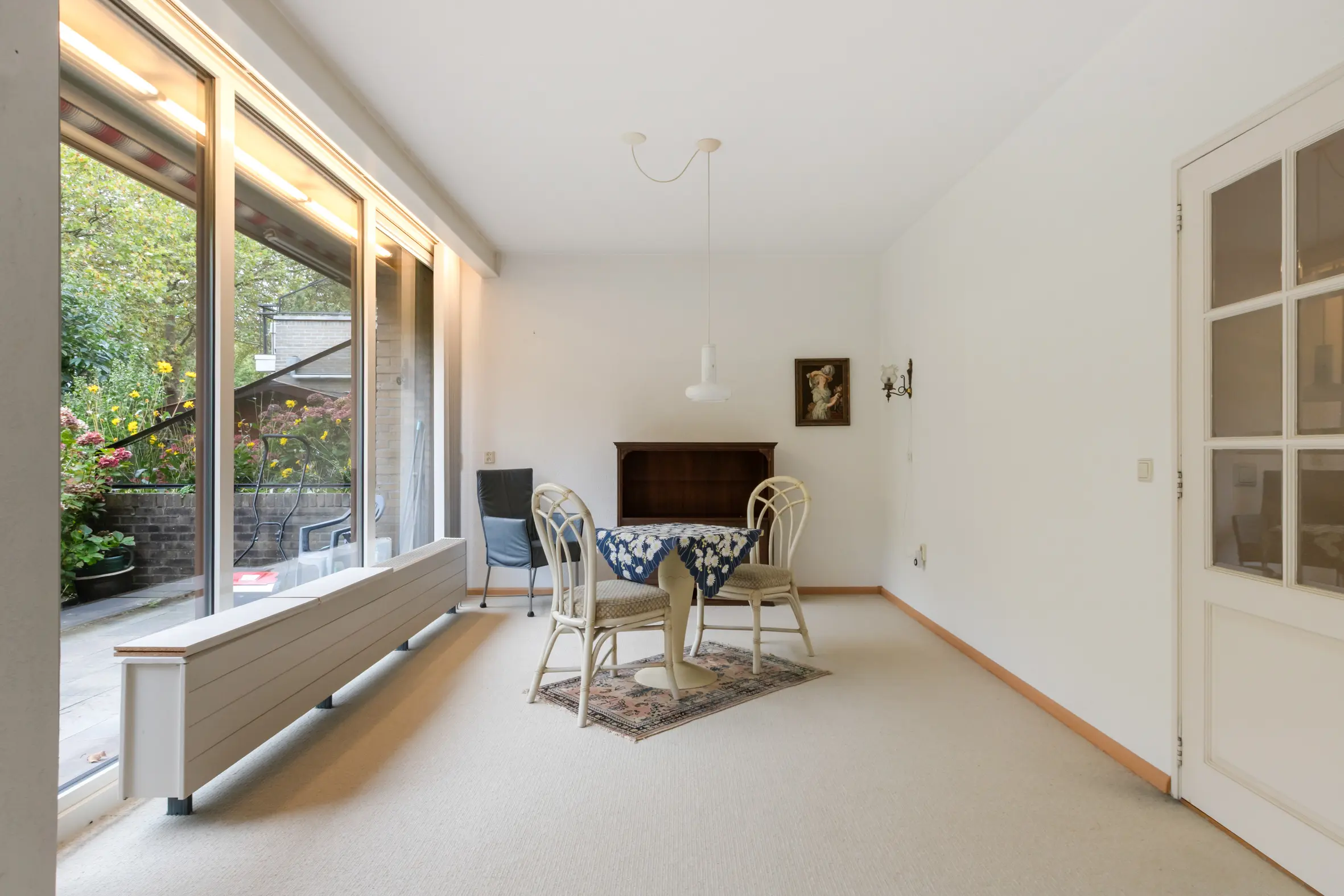De woning heeft een eigen entree aan de zijkant van het appartementencomplex. Via de ruime hal zijn alle vertrekken bereikbaar. De woonkamer ligt aan de achterzijde van de woning, heeft uitzicht over de zeer riante tuin en is voorzien van vloerbedekking. Er ligt een onderhoudsvriendelijke vinyl vloer in de keuken. De keuken is voorzien van met inbouwapparatuur, zoals: