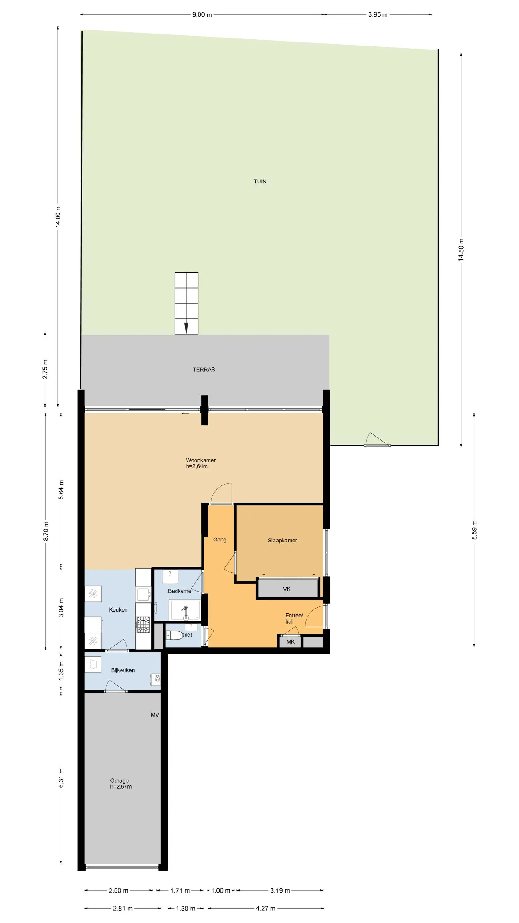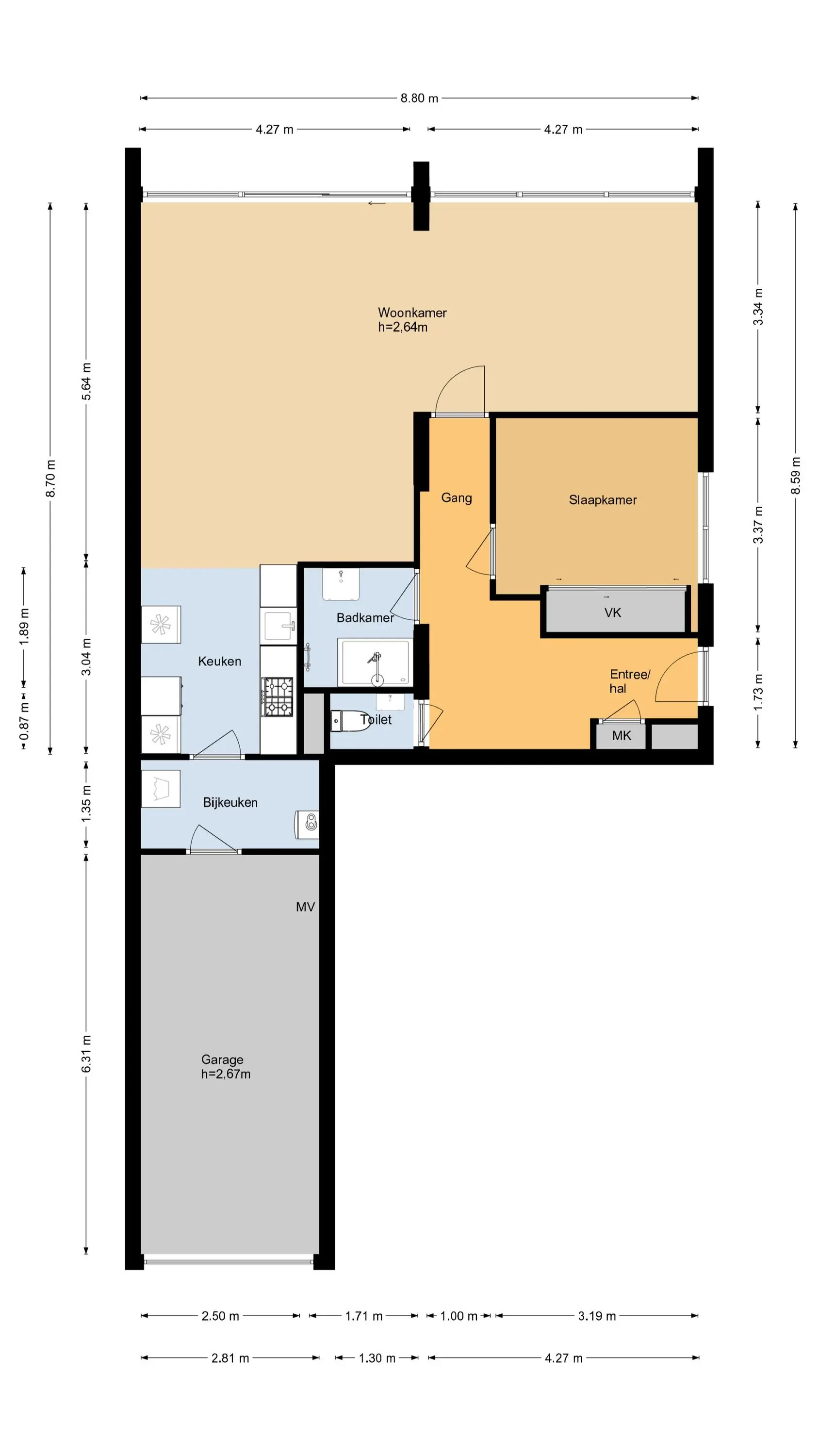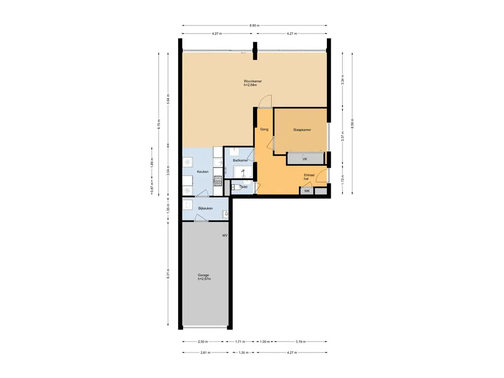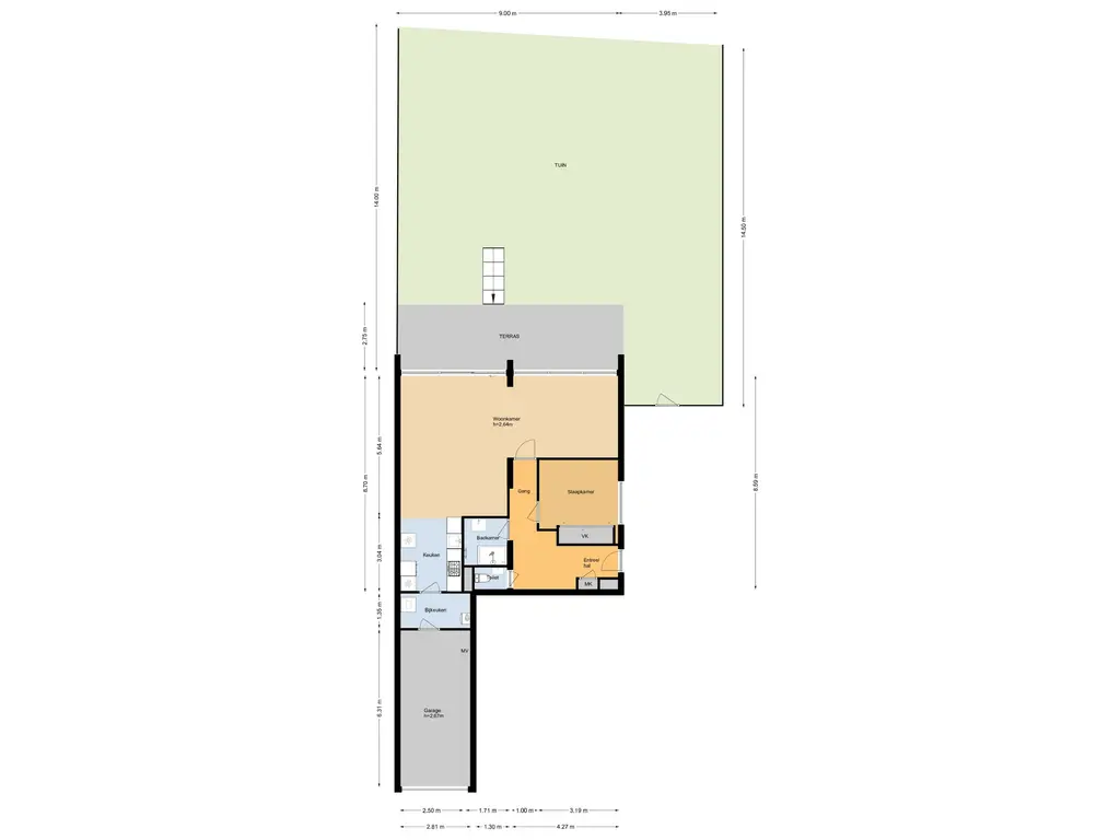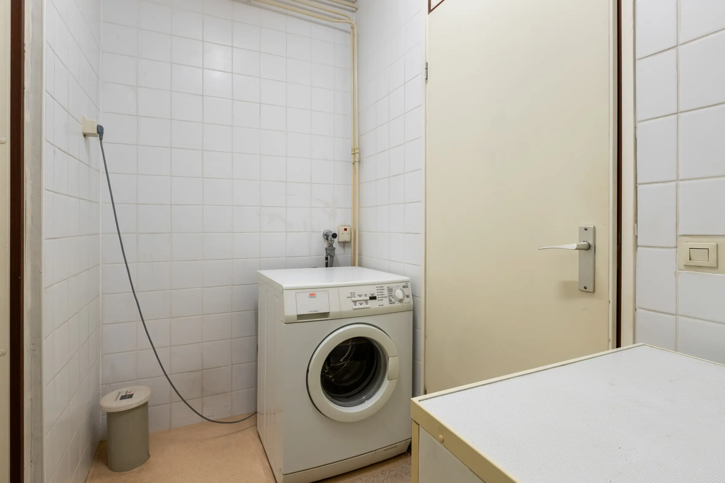 Aansluitend is er een bijkeuken met ruimte voor de wasmachine en opstelling van de cv-ketel (Intergas, 2016). Ook is hier de toegang tot de garage, die voorzien is van mechanische ventilatie en een handmatige roldeur.