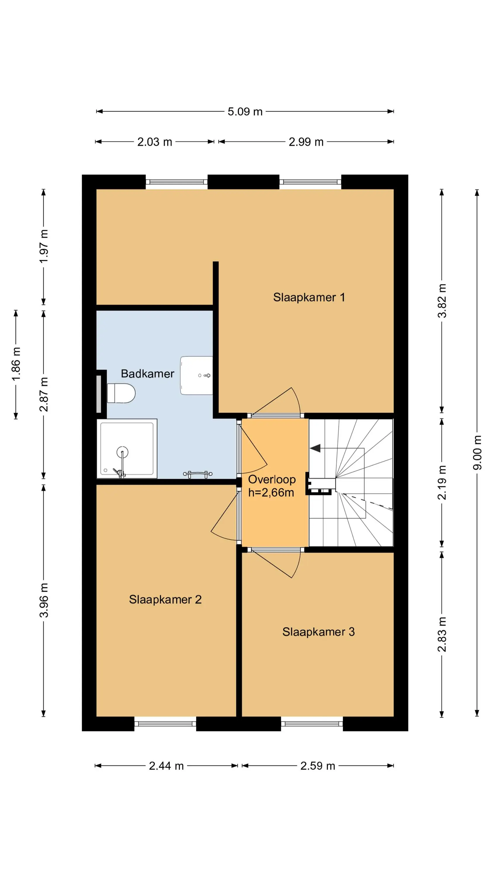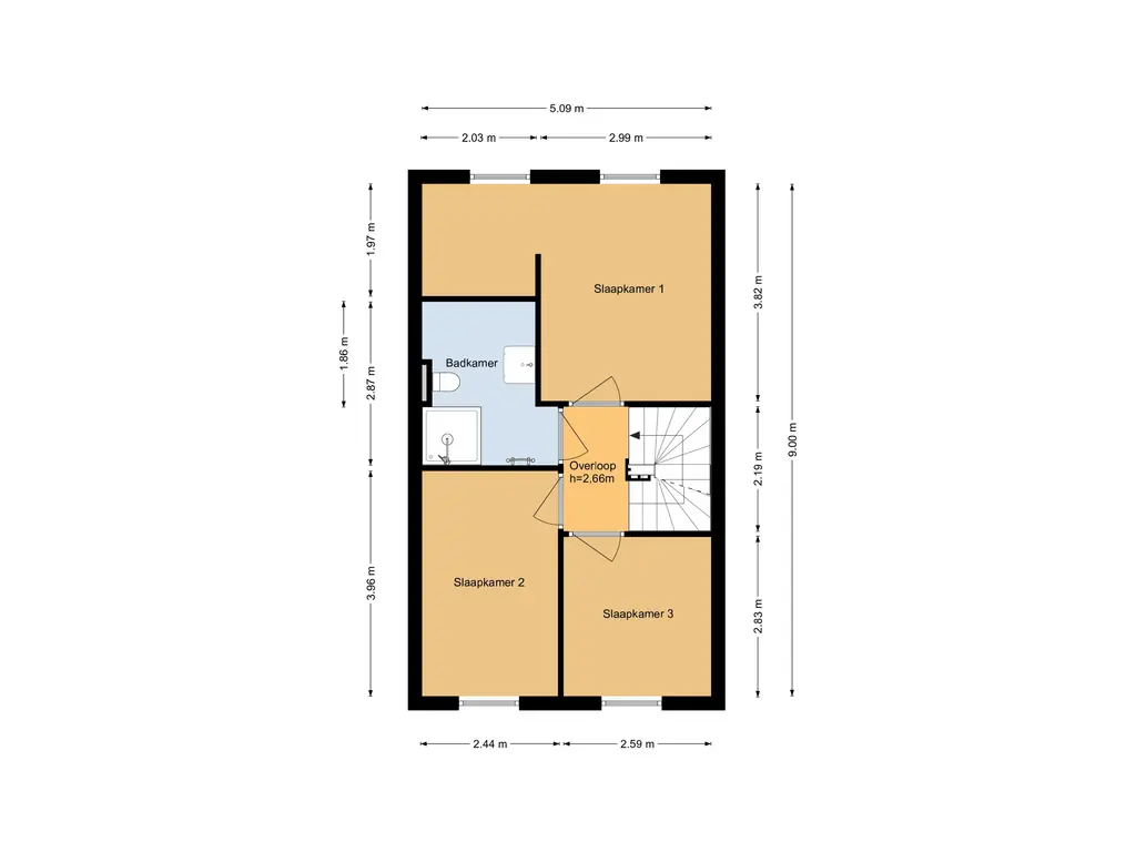 Overloop met toegang tot alle ruimtes. Twee slaapkamers aan de voorzijde van het huis, slaapkamer drie ligt aan de achterzijde en heeft een screen met elektrische bediening.