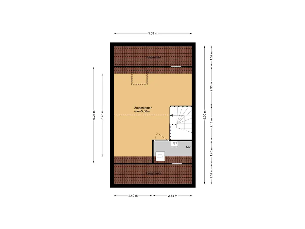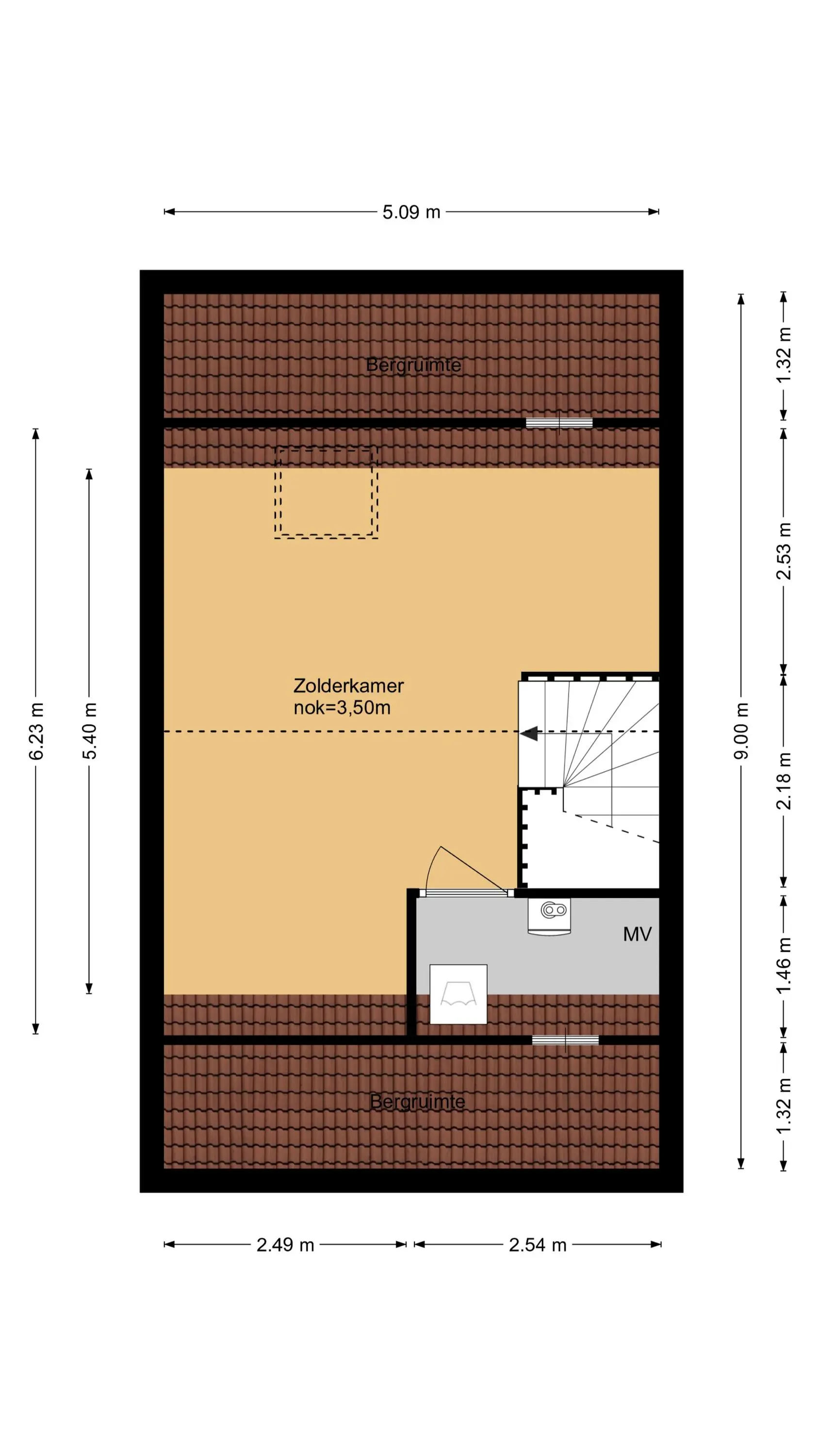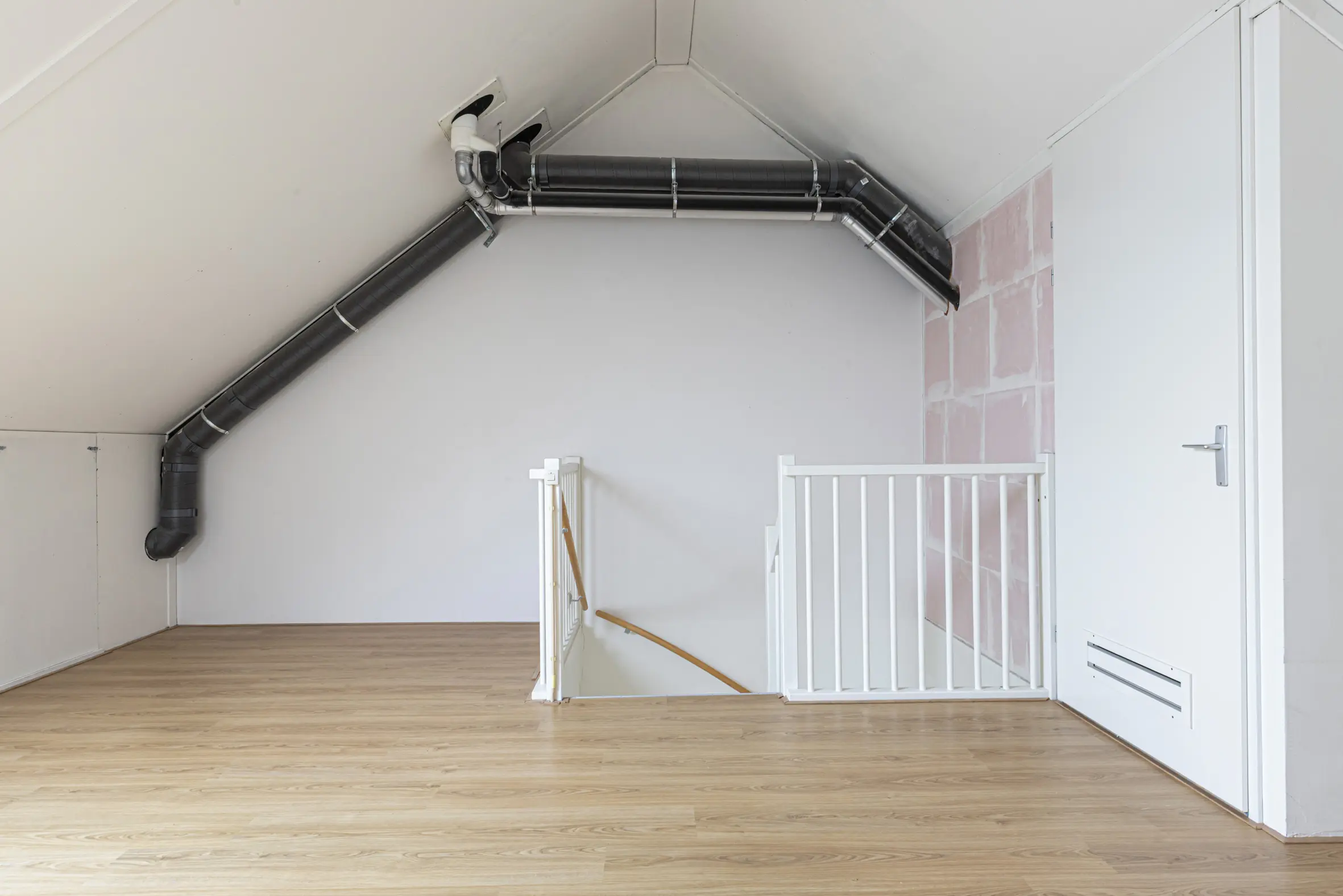Via een open trap bereik je de open zolderruimte met een kunststof dakraam aan de achterzijde. Achter het knieschot is praktische bergruimte aanwezig. Daarnaast is er een technische ruimte met WTW-installatie en de C.V.-combiketel Intergas HRE (2015).