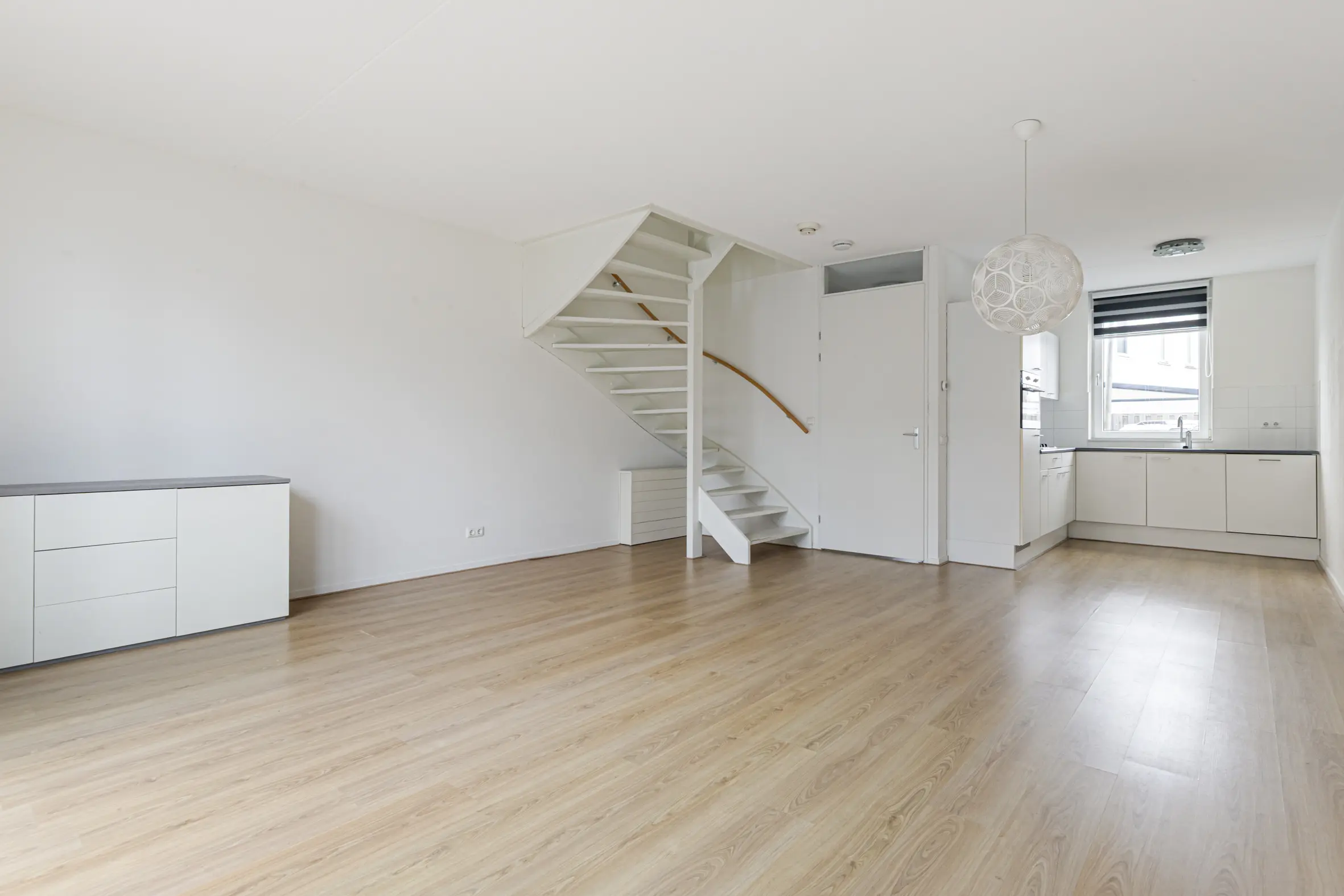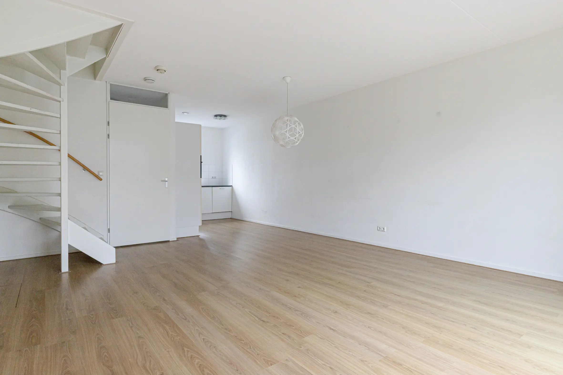 De woonkamer is licht en ruim en beschikt over een open trap naar de verdieping en een deur naar de tuin. Aan de buitenzijde is een elektrisch zonnescherm geplaatst welke de zon uit de woonkamer houdt.