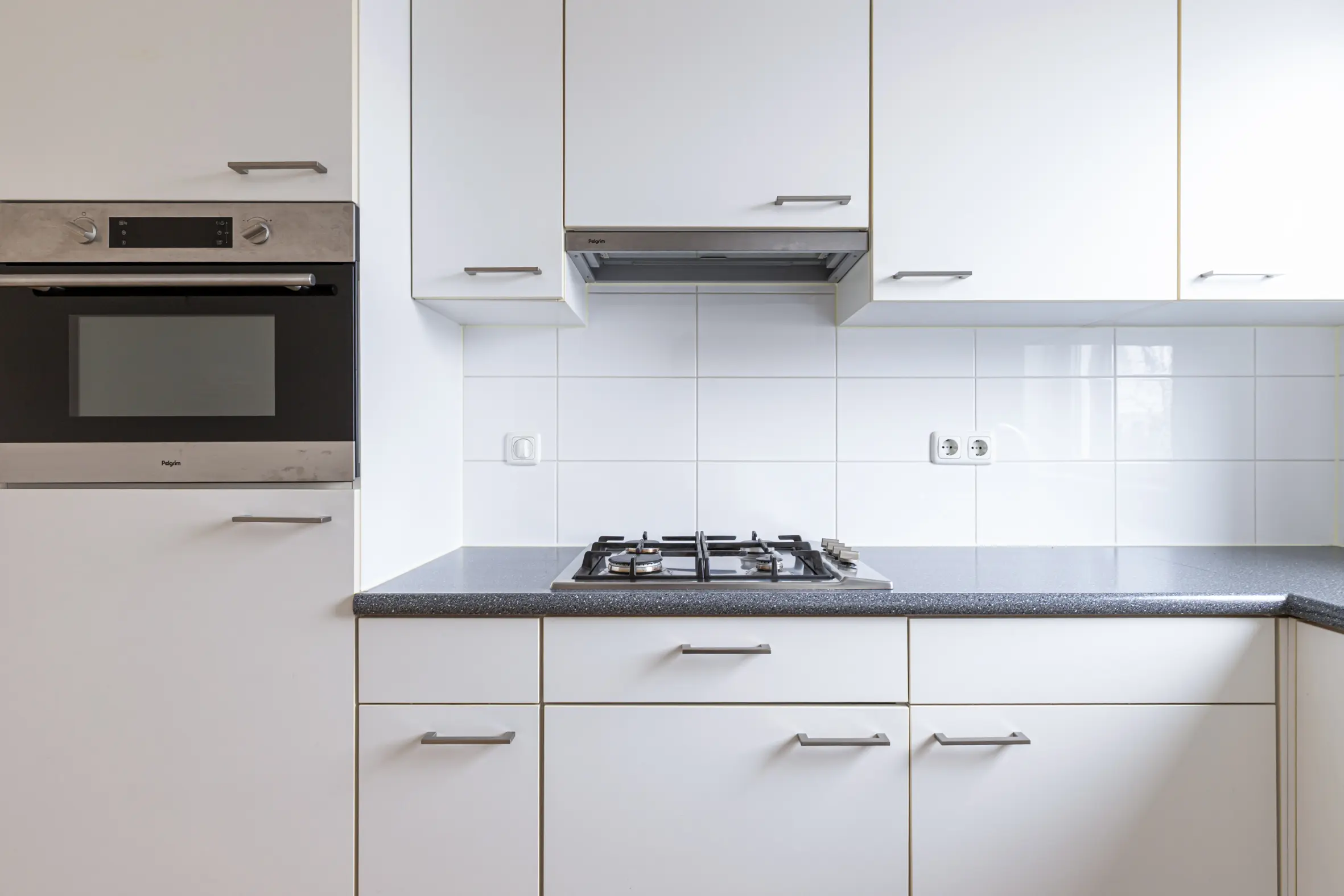 Je komt binnen in de ruime hal met meterkast en in lichte kleurstelling betegelde toiletruimte met wandcloset en fonteintje. De aan de voorzijde gelegen witte keuken met grijs kunststof aanrechtblad is geplaatst in L-opstelling en is uitgerust met een:
