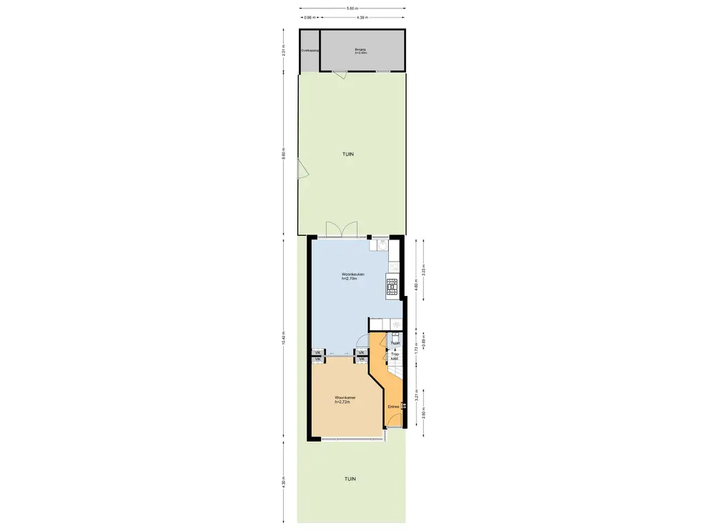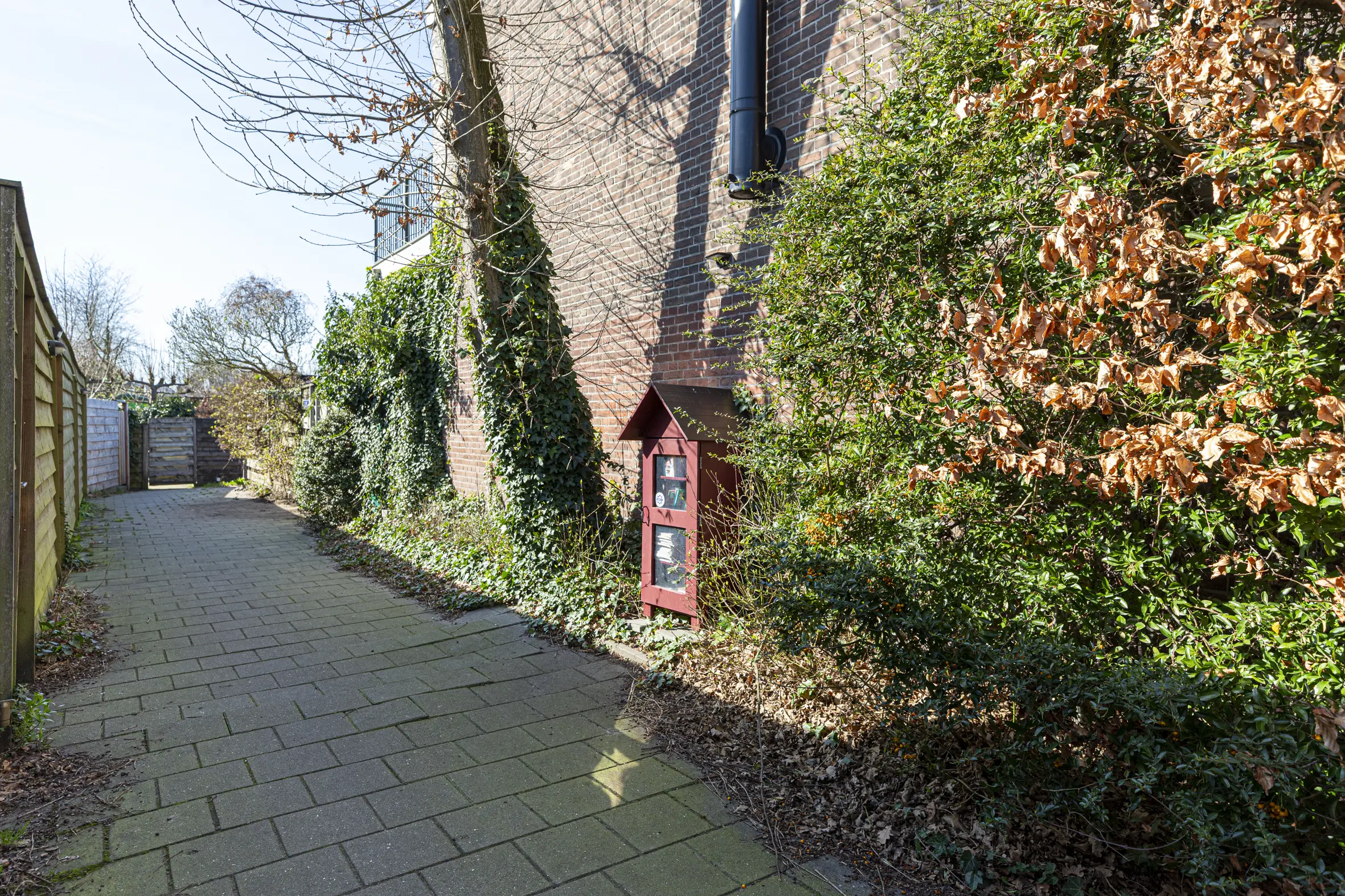 De woning heeft een ruime voortuin en smalle zijtuin met grote regenton. De achtertuin ligt op het zuidwesten met vrij uitzicht, wat ervoor zorgt dat er tot laat in de avond van de zon genoten kan worden.