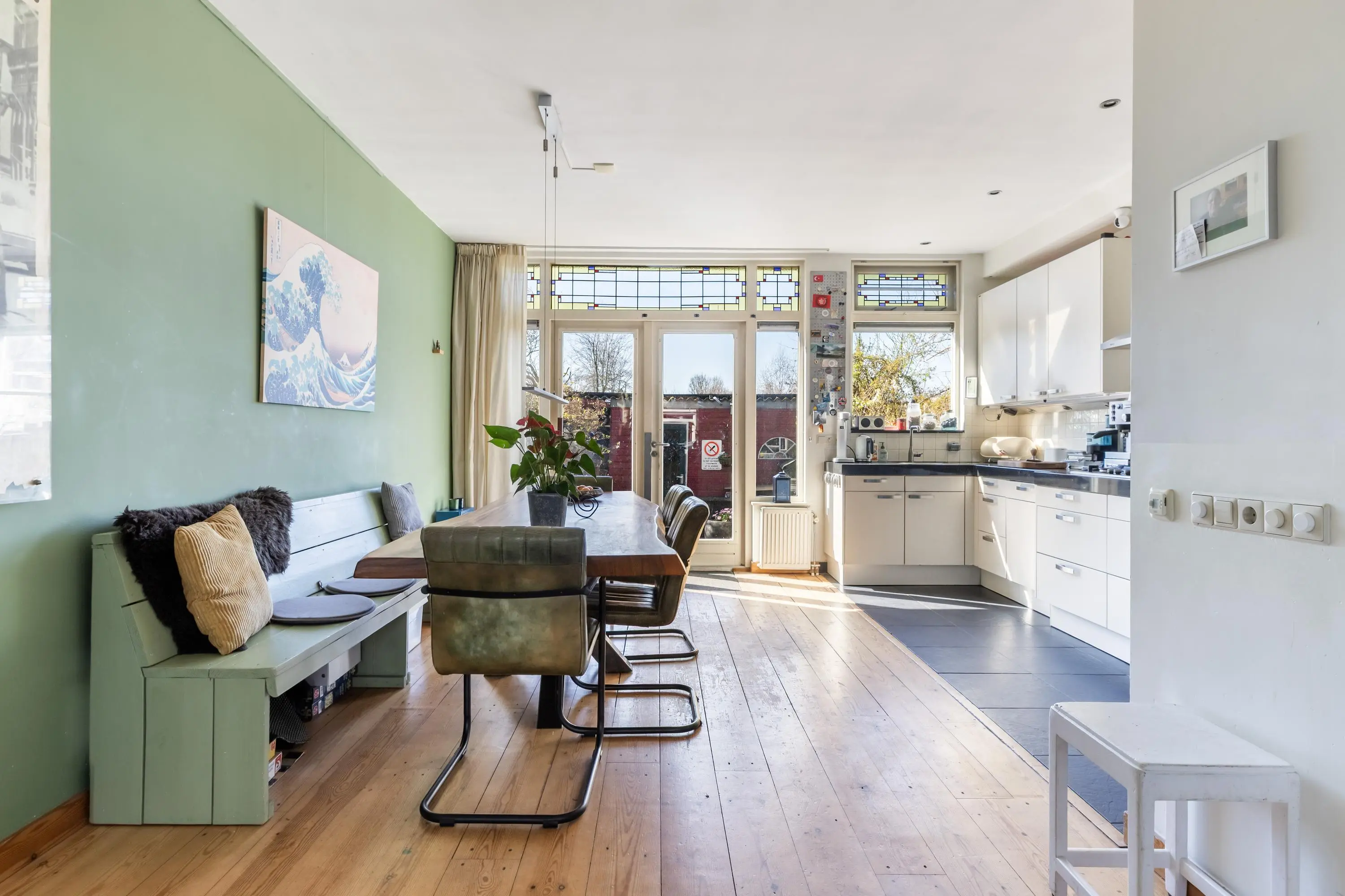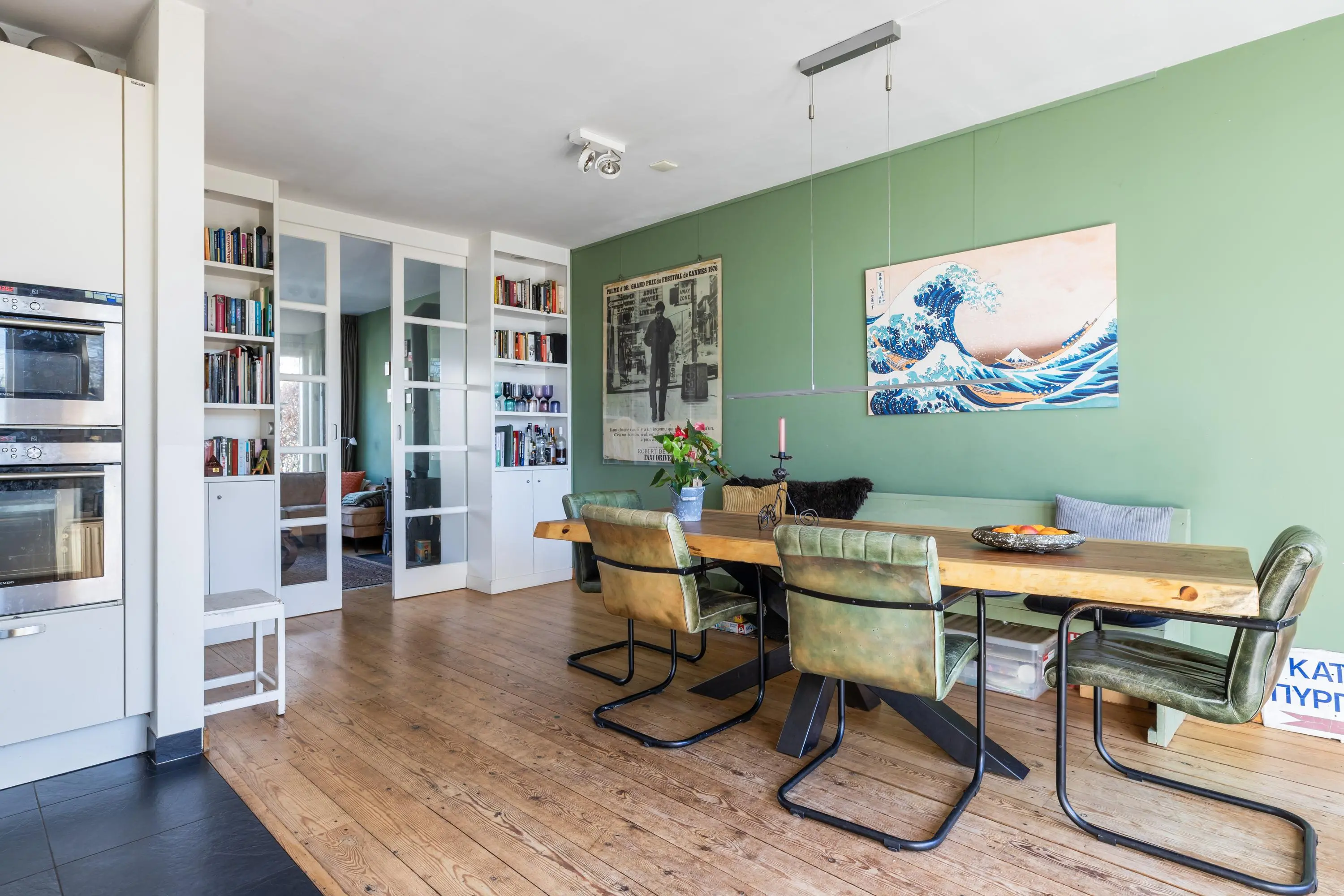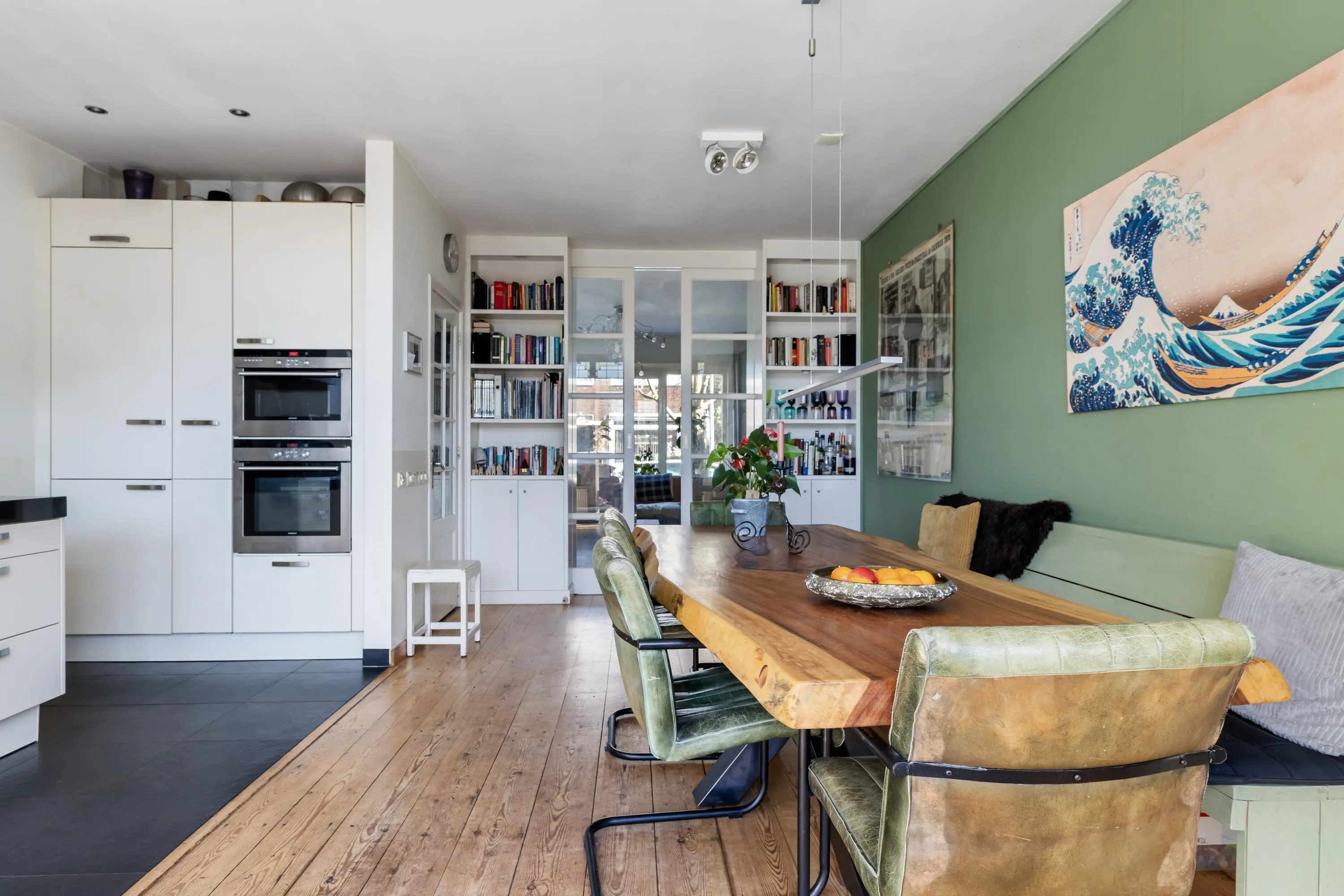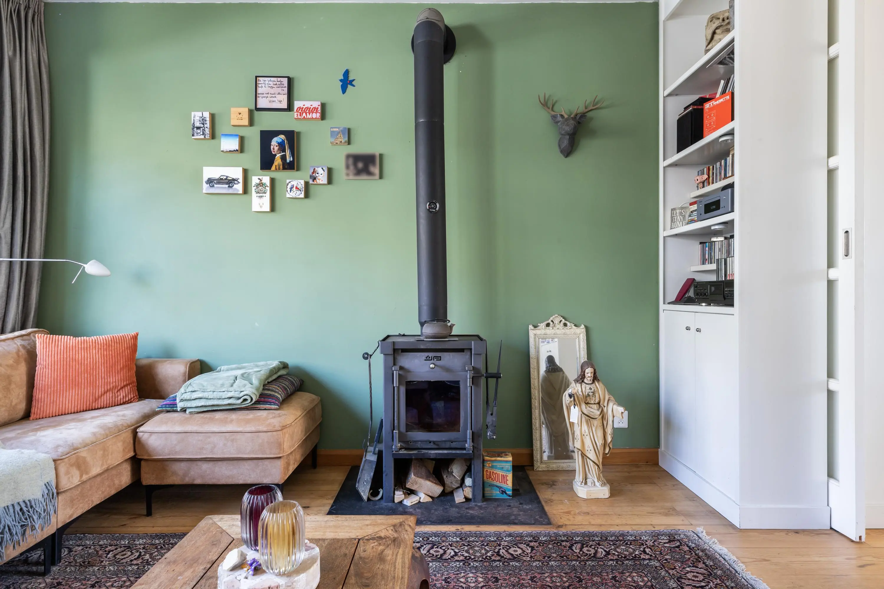 Aan de voorzijde van de woning ligt de woonkamer. Deze ruimte heeft een prettige lichtinval dankzij de erker en krijgt extra sfeer door de houtkachel (welke in overleg achter kan blijven) en de houten vloer. De en-suite deuren verbinden de woonkamer met de keuken, wat zorgt voor een mooie, karaktervolle overgang tussen beide ruimtes.