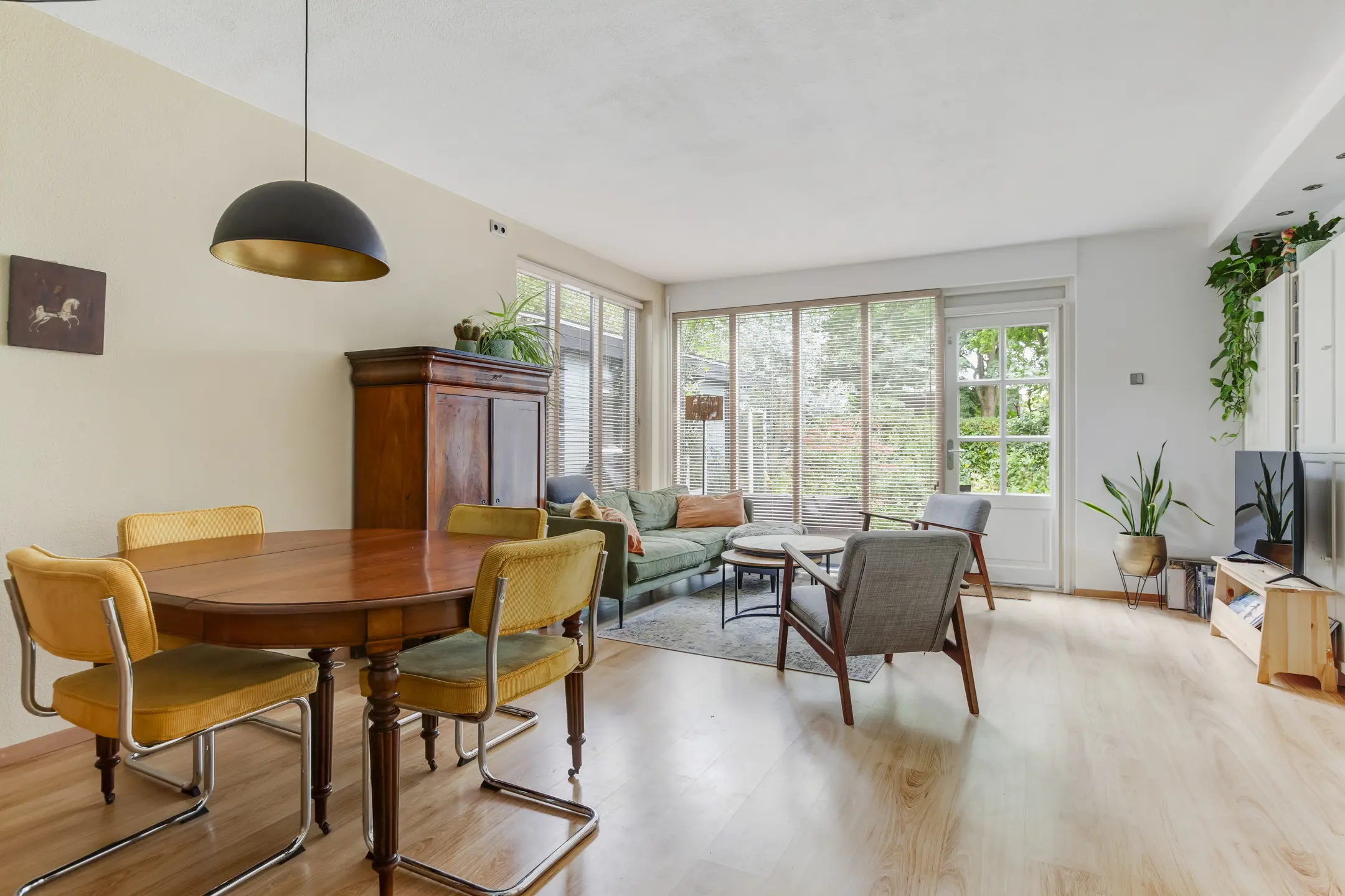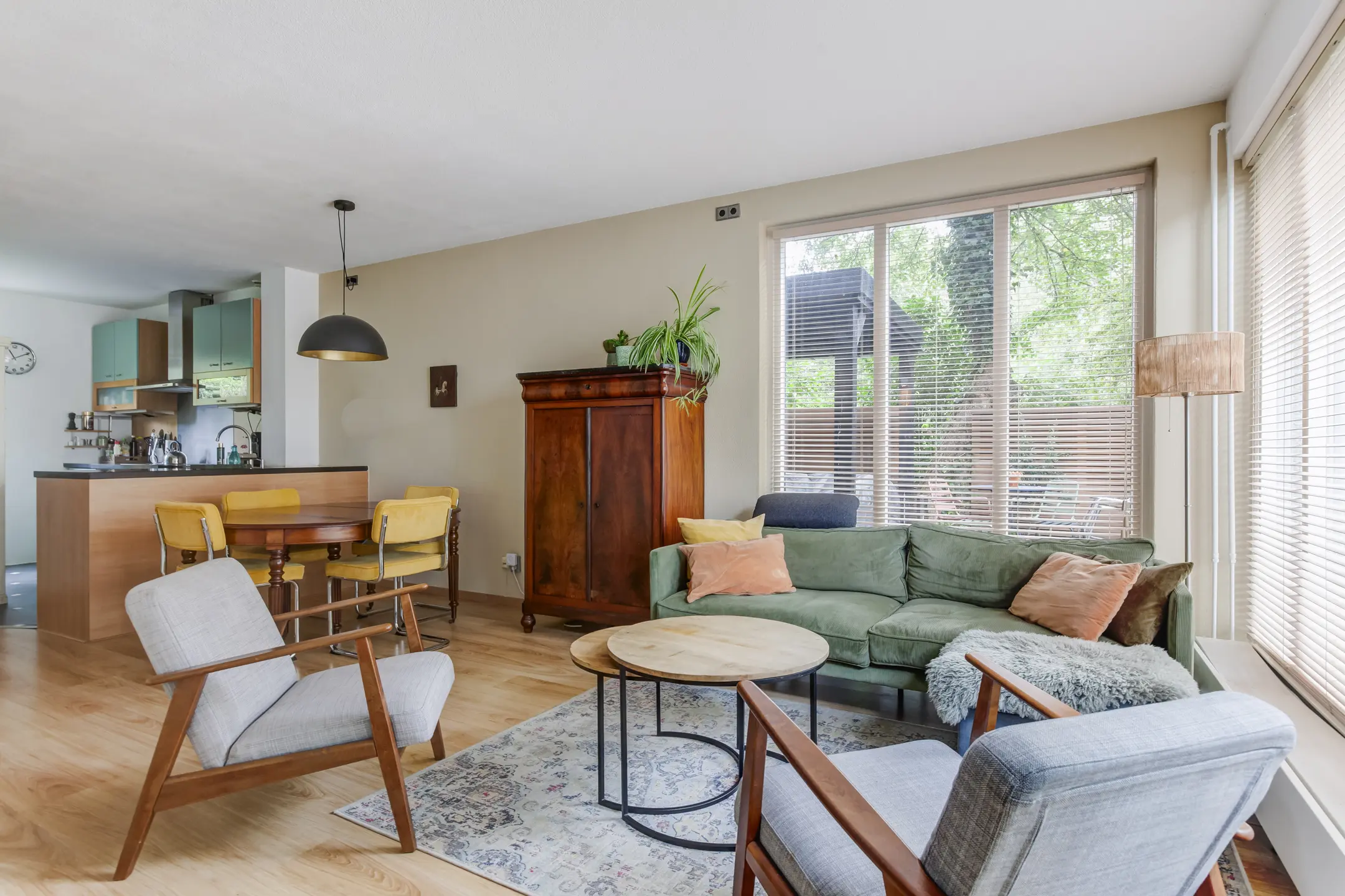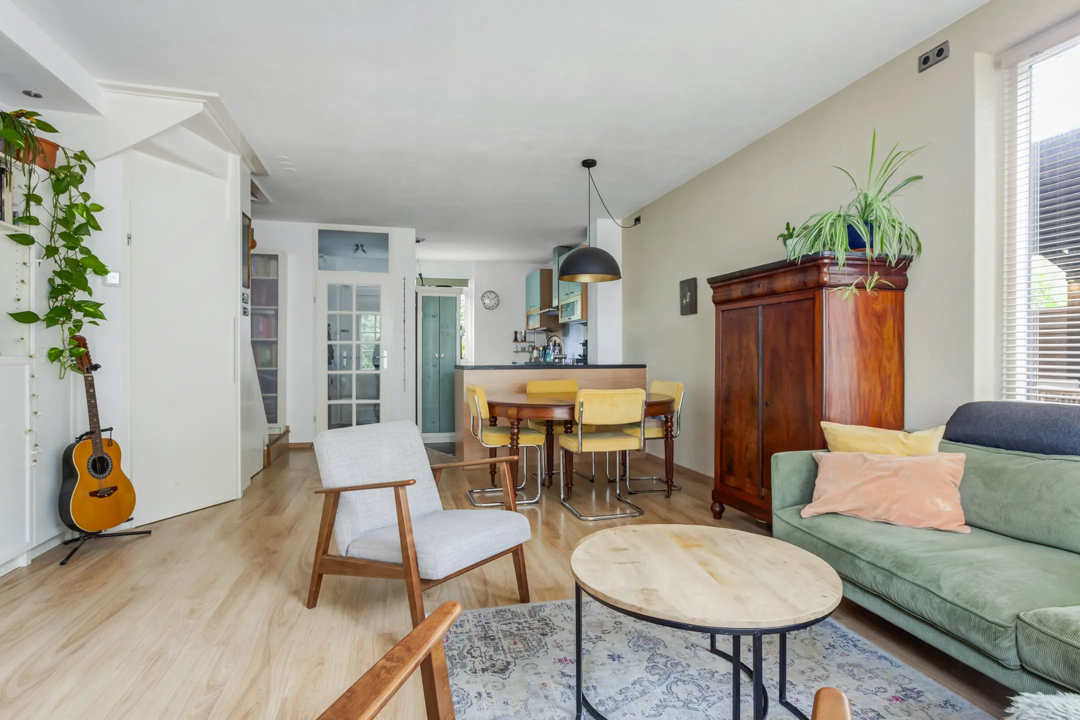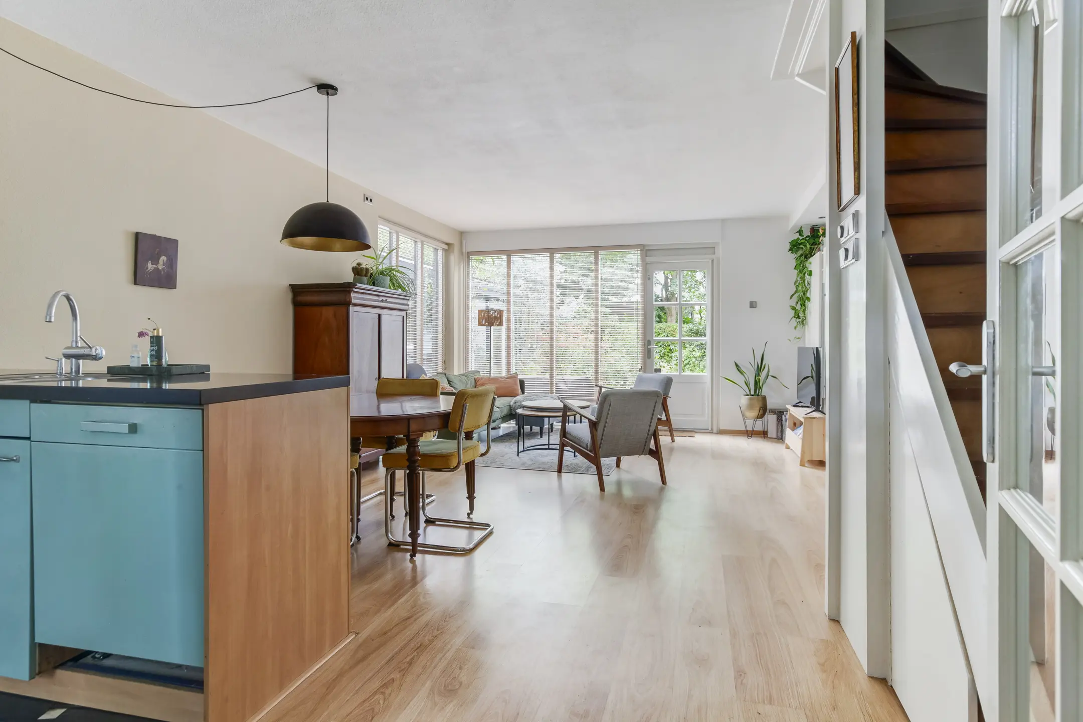 De woonkamer is licht dankzij ramen in zowel de achter- als zijgevel. De vloer is afgewerkt met laminaat, er zijn inbouwspots aanwezig en onder de trap bevindt zich een handige trapkast. Vanuit de woonkamer loop je zo de zeer ruime achter- en zijtuin in.