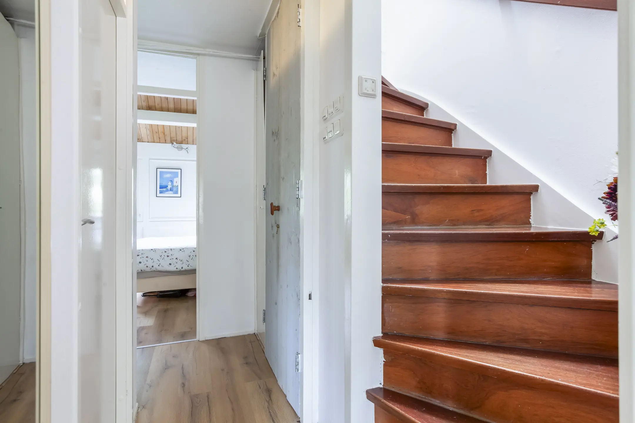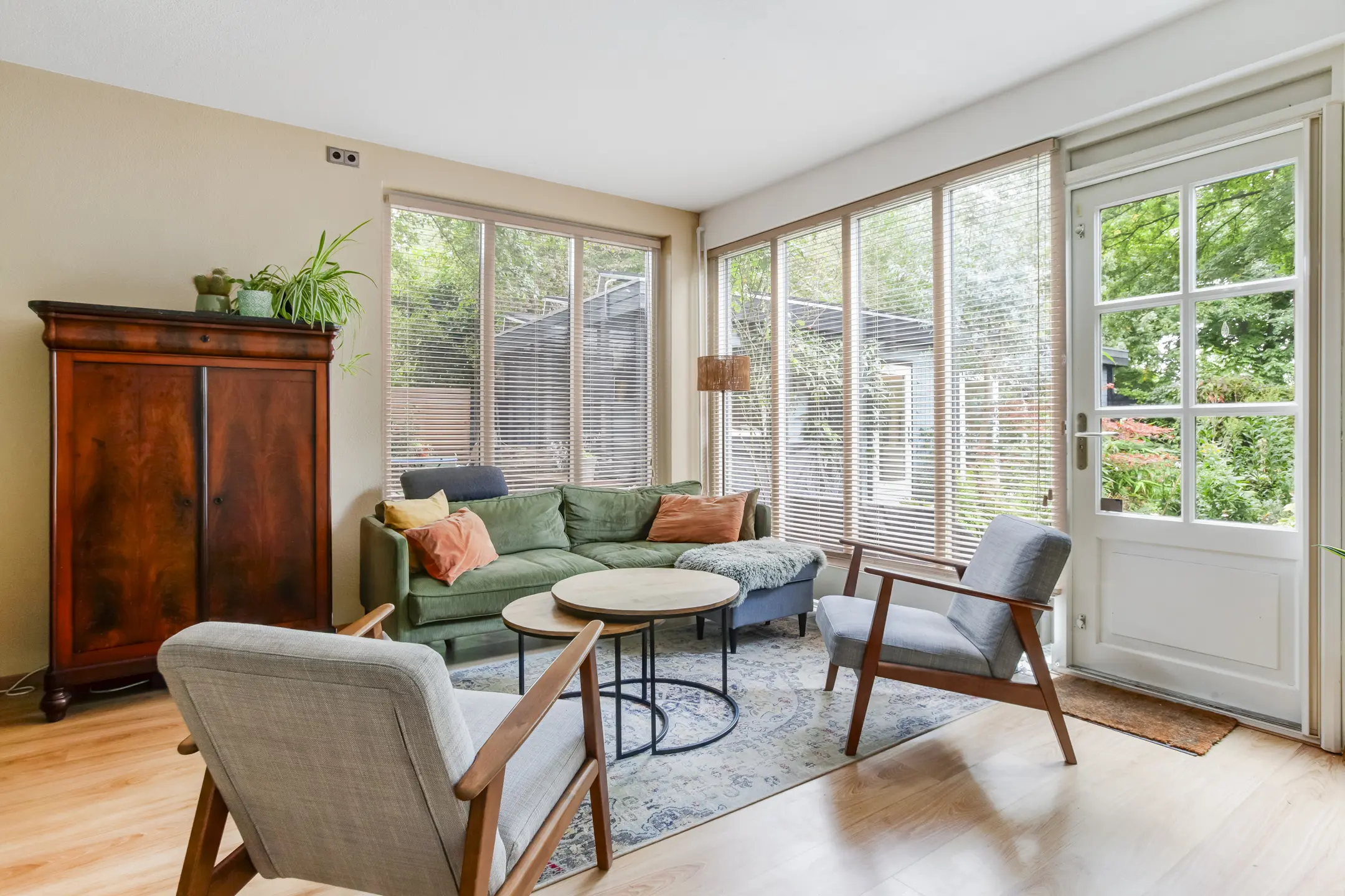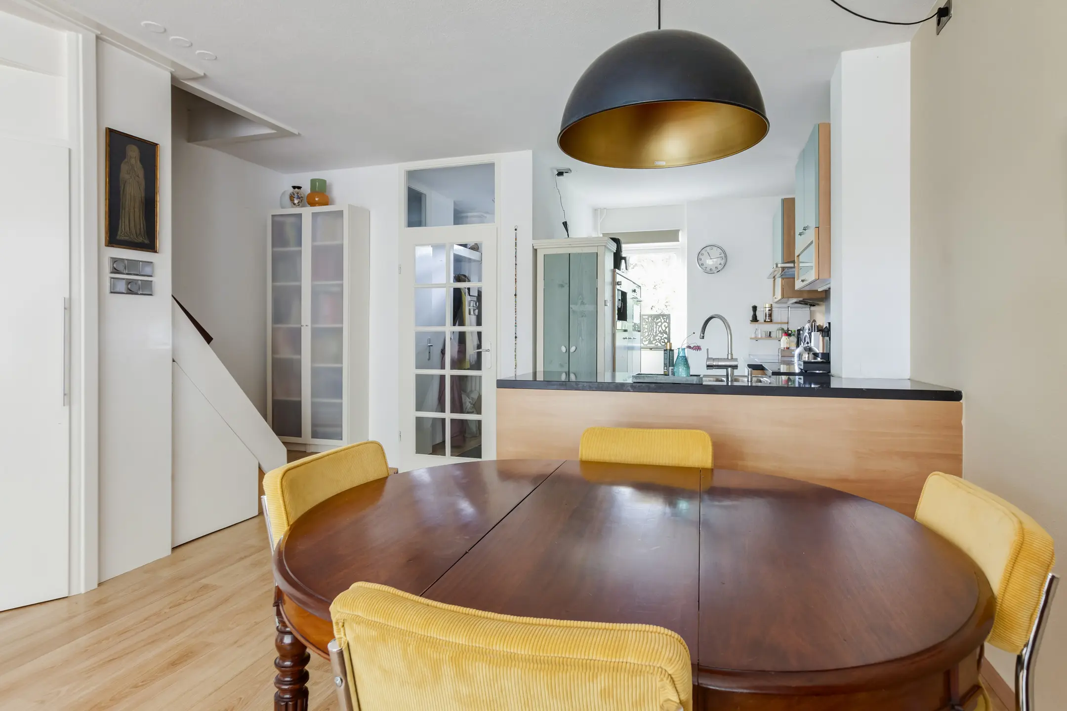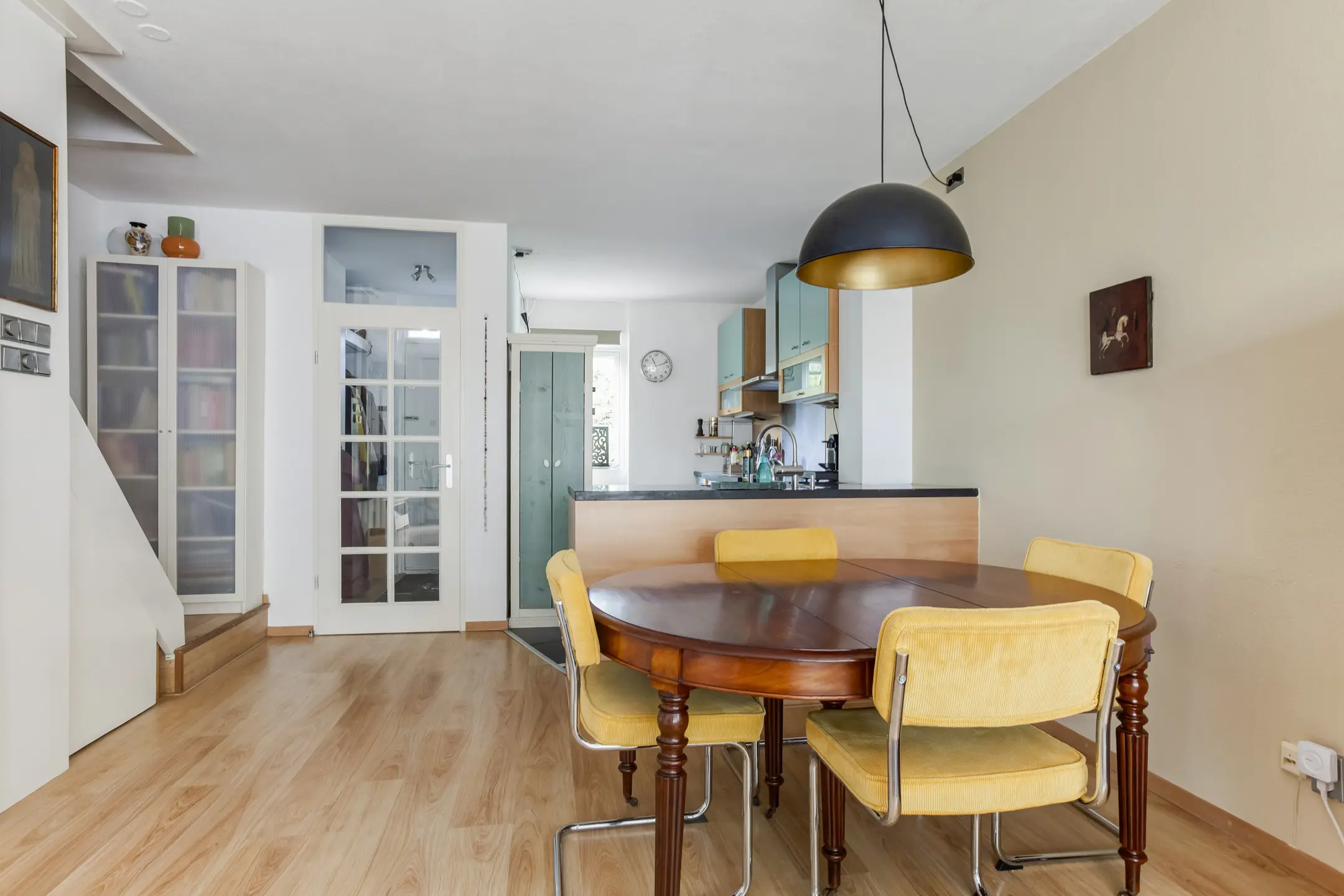 De woonkamer is licht dankzij ramen in zowel de achter- als zijgevel. De vloer is afgewerkt met laminaat, er zijn inbouwspots aanwezig en onder de trap bevindt zich een handige trapkast. Vanuit de woonkamer loop je zo de zeer ruime achter- en zijtuin in.