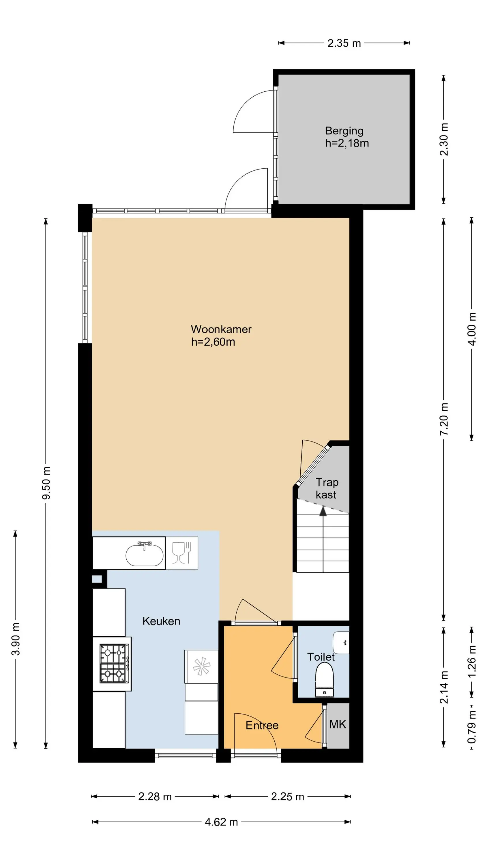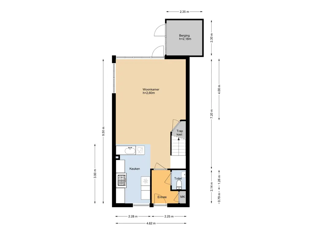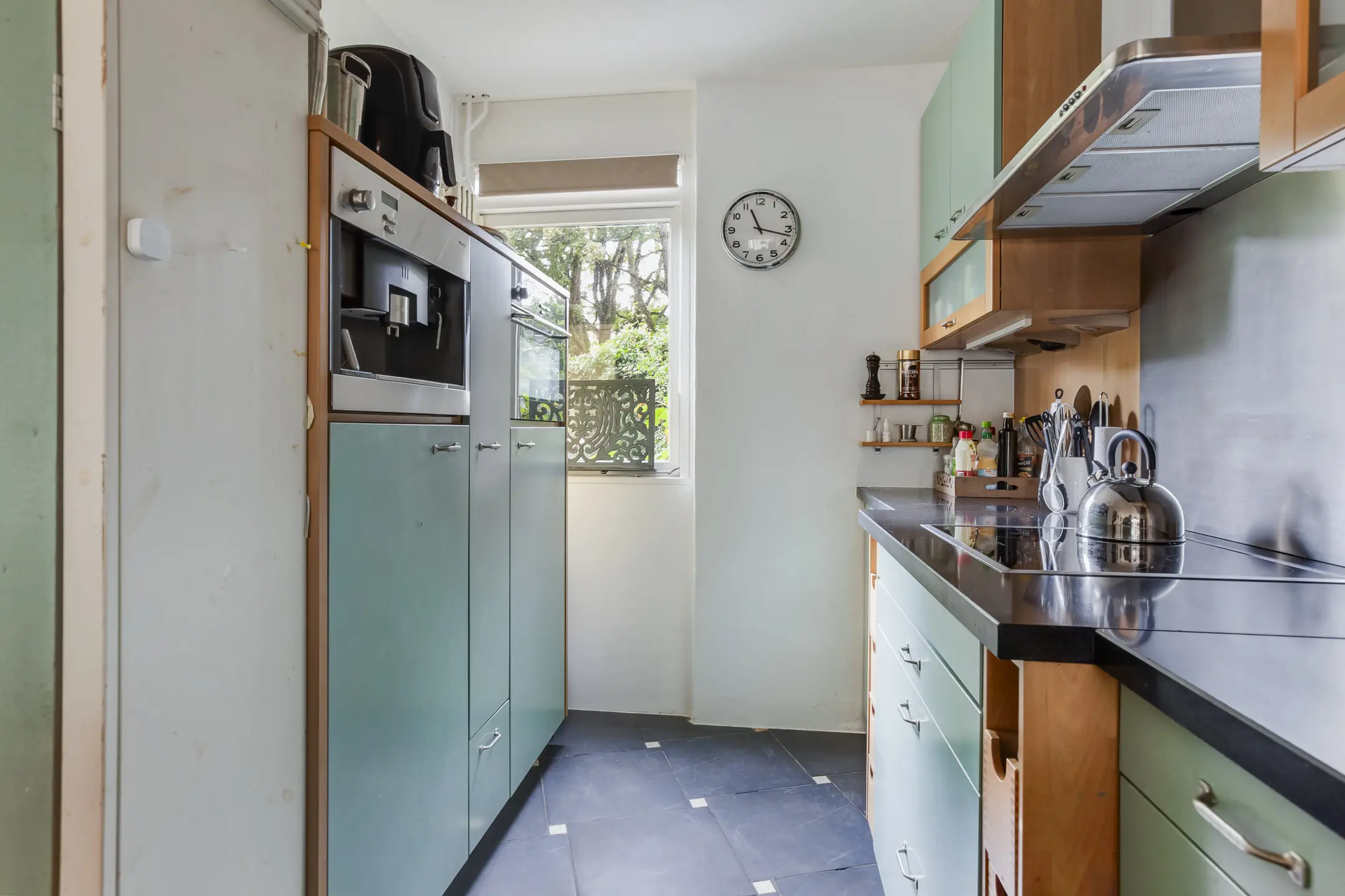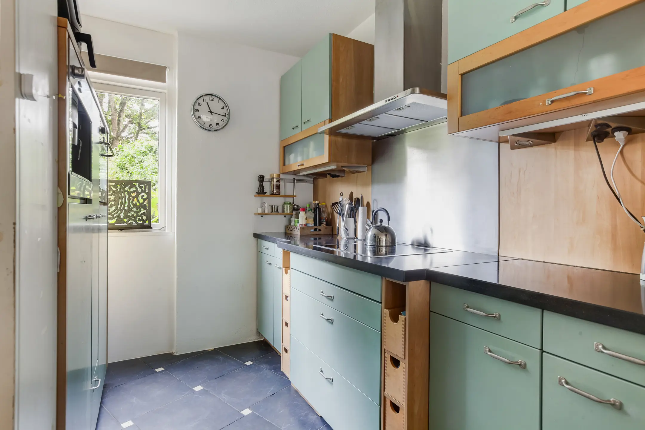 De woonkamer is licht dankzij ramen in zowel de achter- als zijgevel. De vloer is afgewerkt met laminaat, er zijn inbouwspots aanwezig en onder de trap bevindt zich een handige trapkast. Vanuit de woonkamer loop je zo de zeer ruime achter- en zijtuin in.