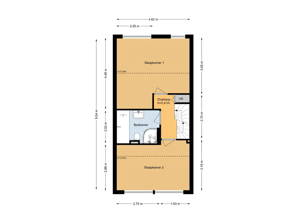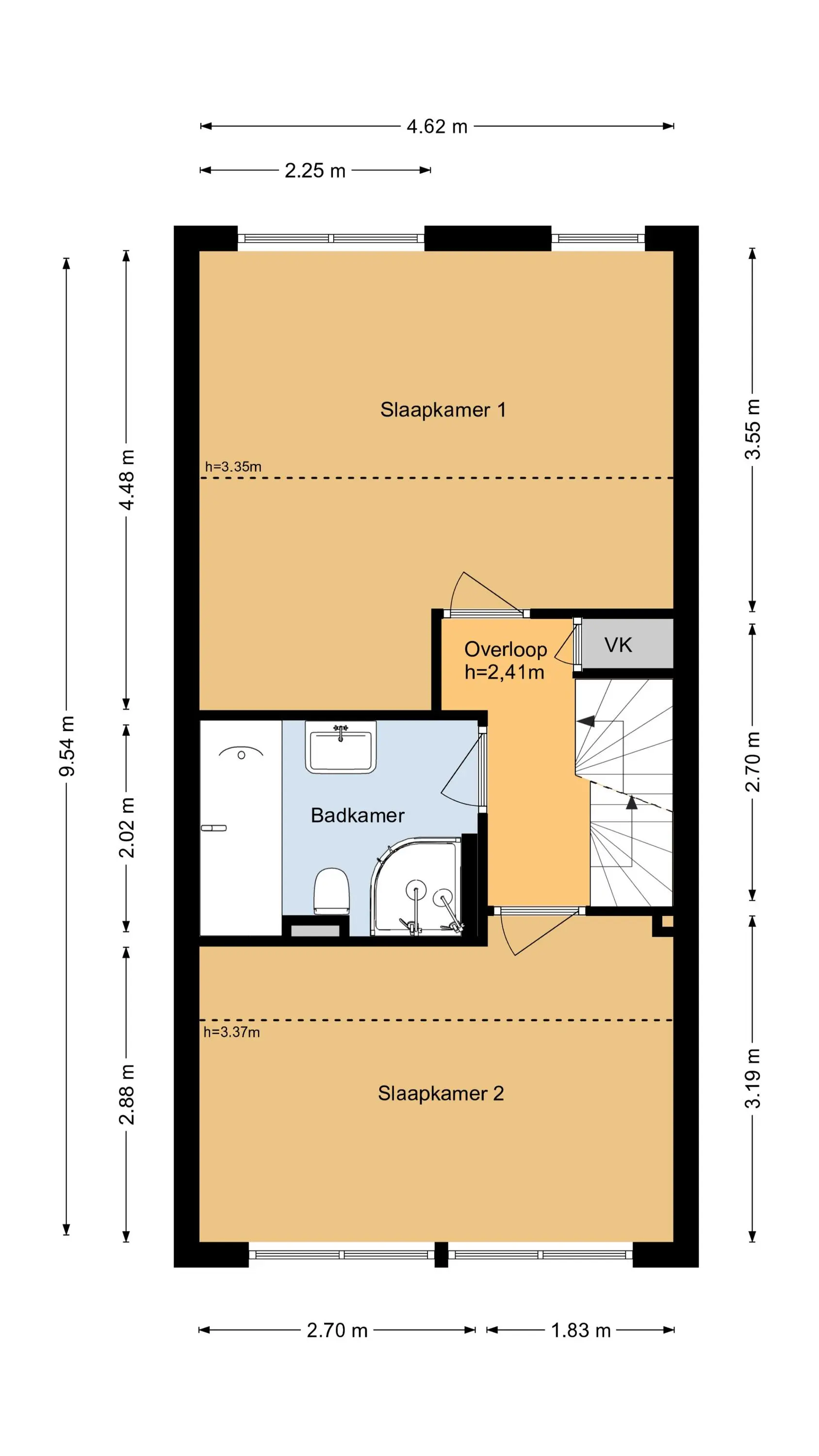 Op deze verdieping zijn twee ruime slaapkamers te vinden. De kamer aan de achterzijde is ontstaan uit twee samengevoegde kamers en biedt daardoor veel ruimte. Beide slaapkamers zijn voorzien van laminaat en een wand met behang. De badkamer is royaal en uitgerust met: