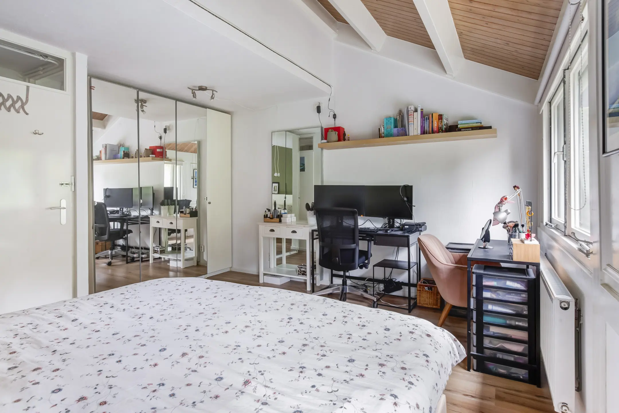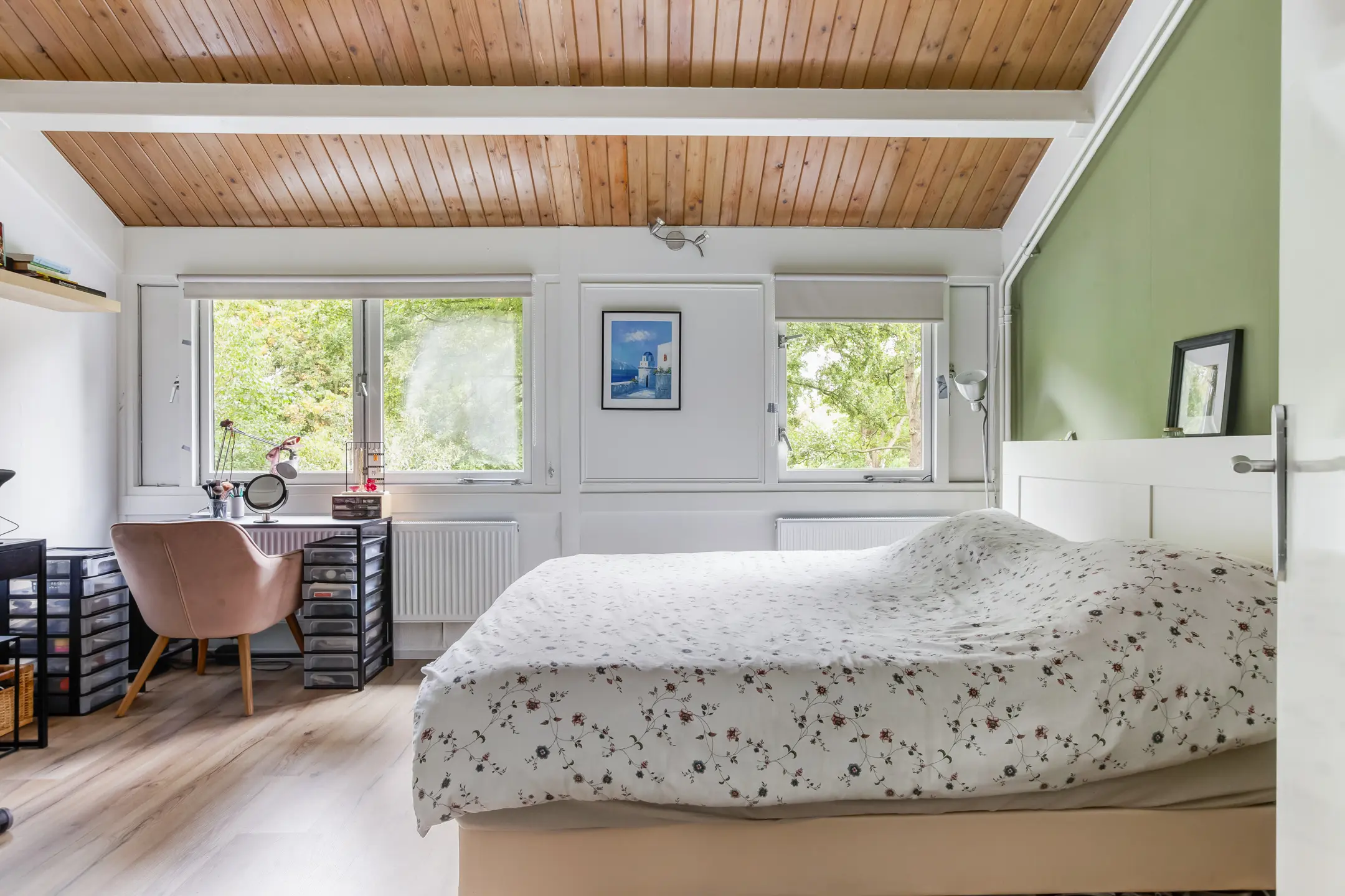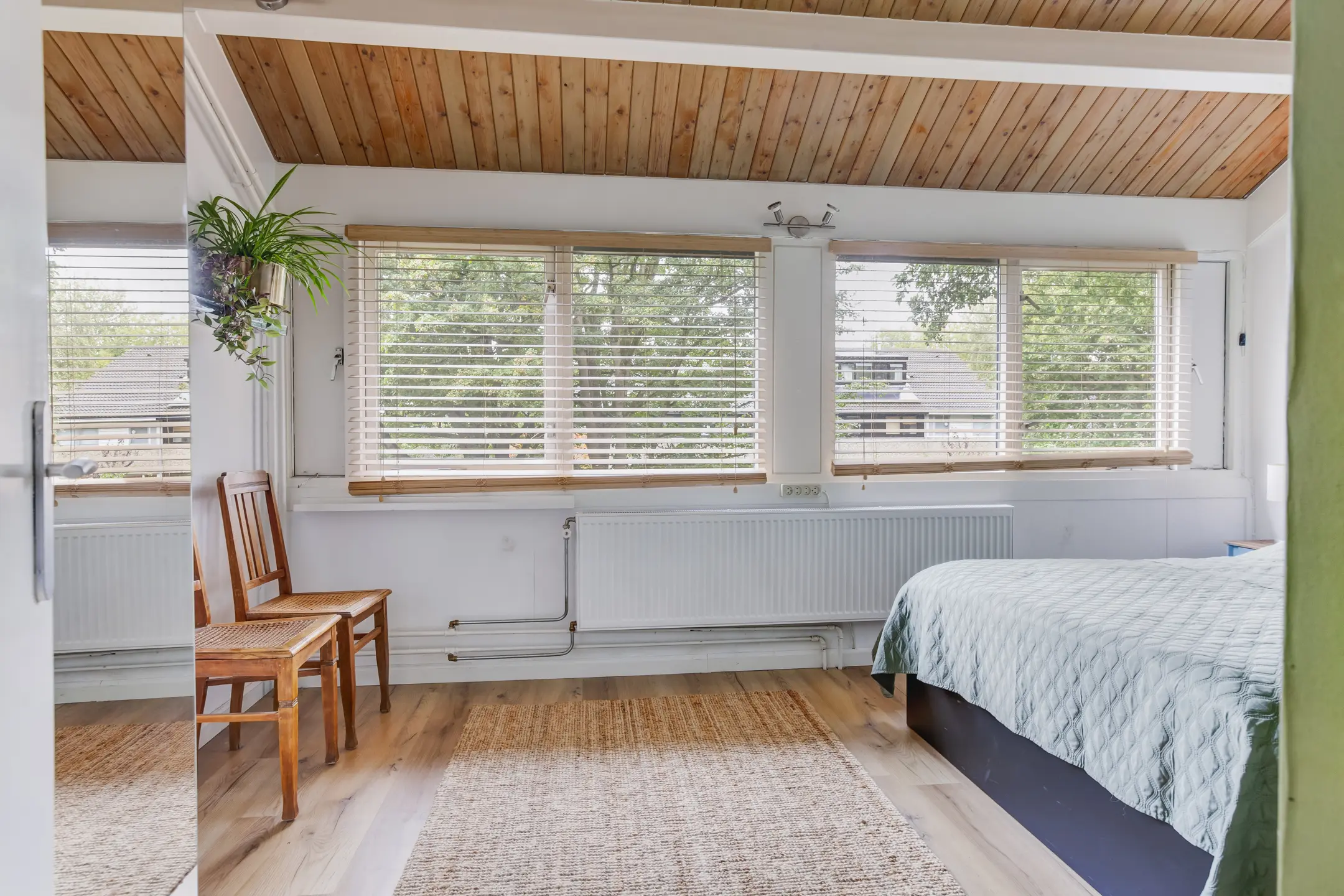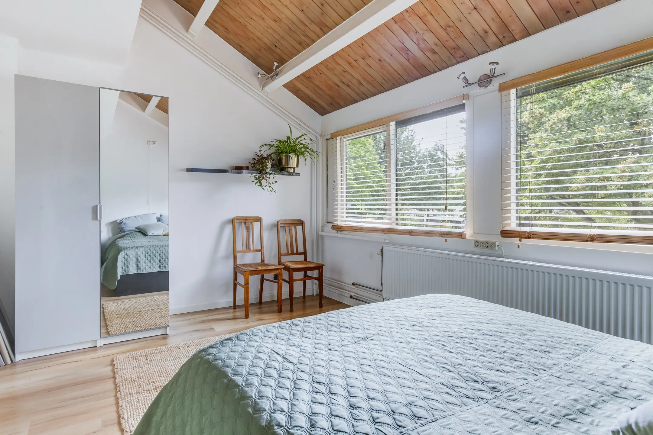 De zolderkamer is royaal en heeft een dakkapel waardoor er volop daglicht binnenkomt. In de aparte technische ruimte vind je de aansluitingen voor wasmachine en droger en de opstelling van de cv-ketel.