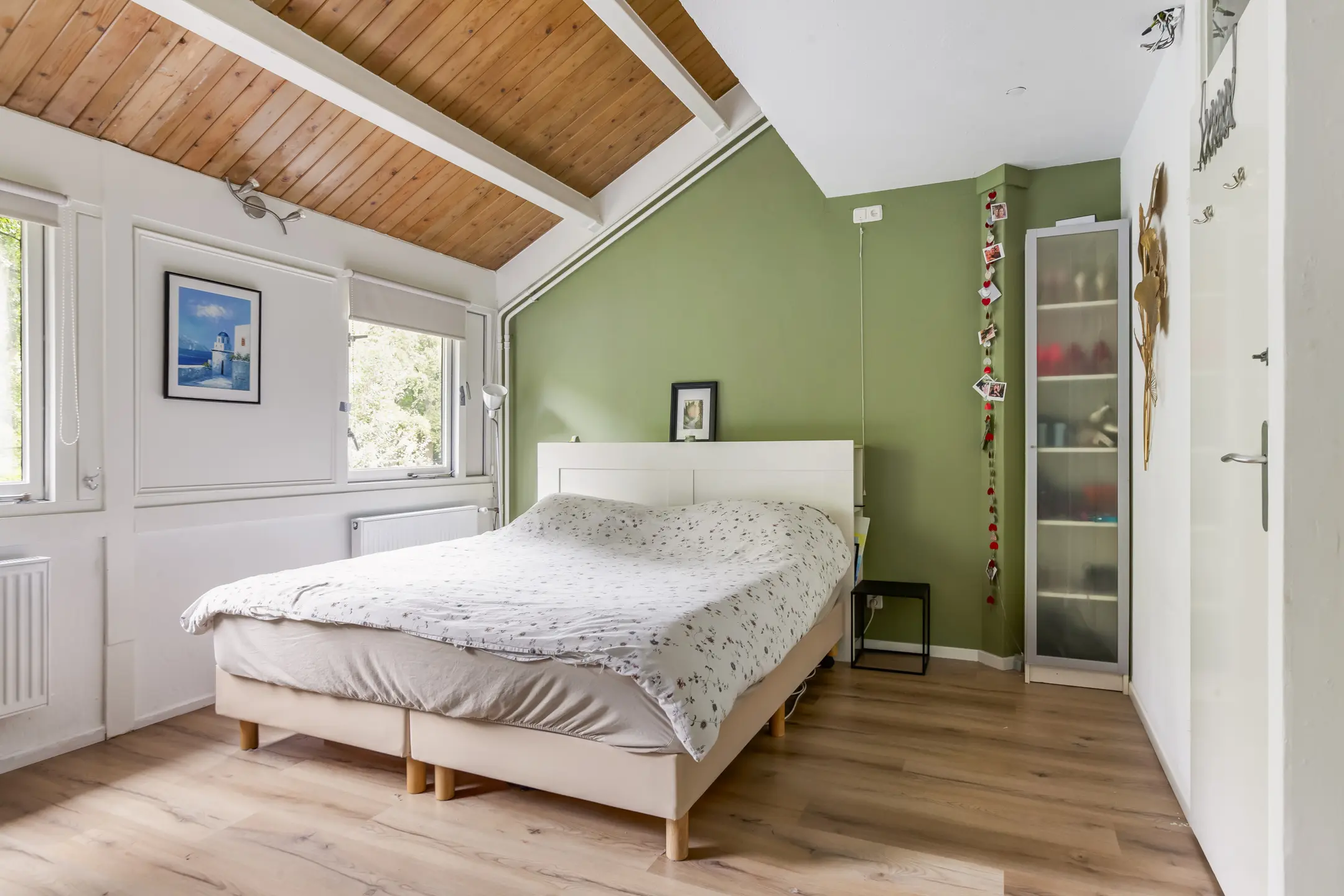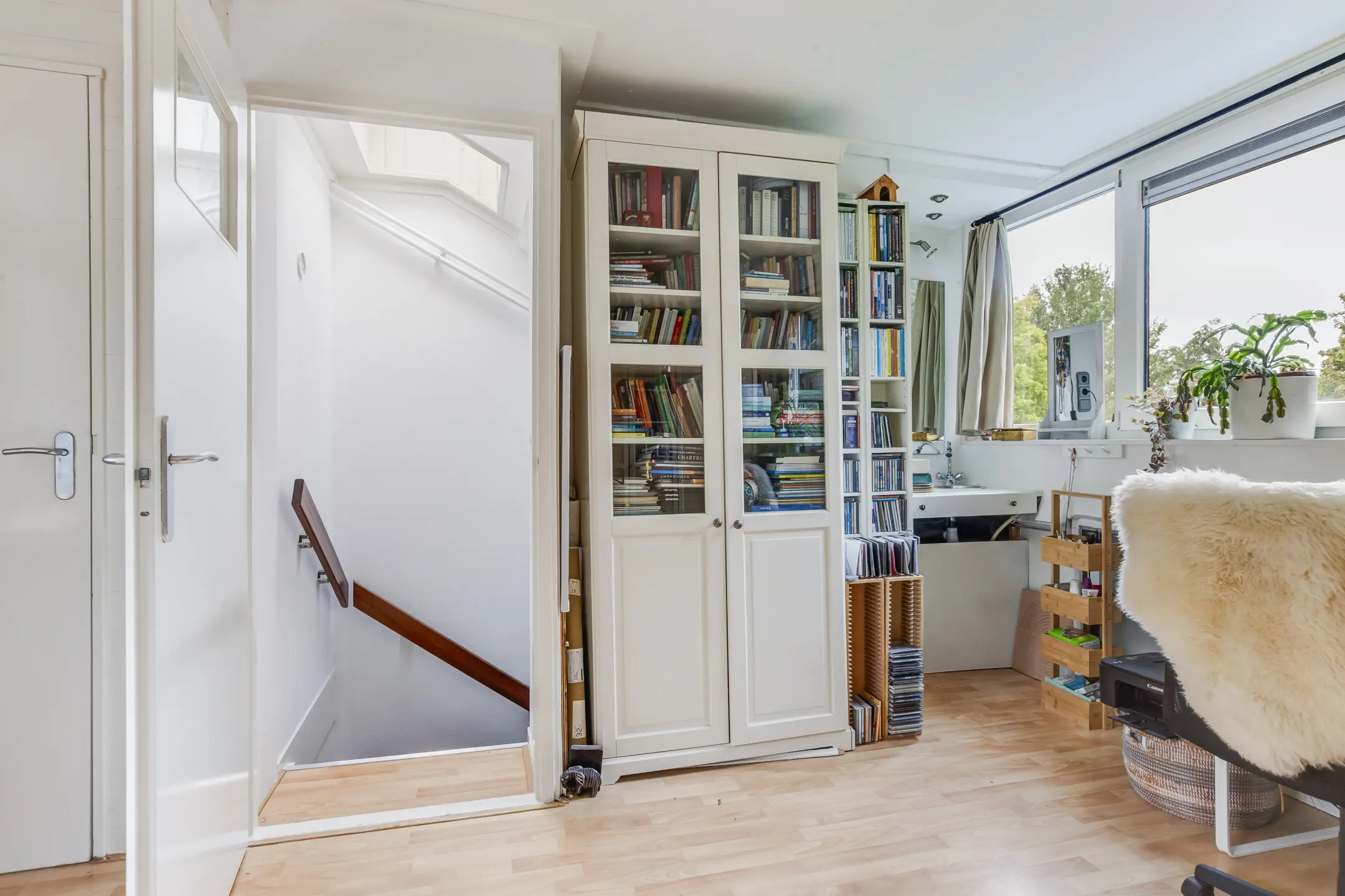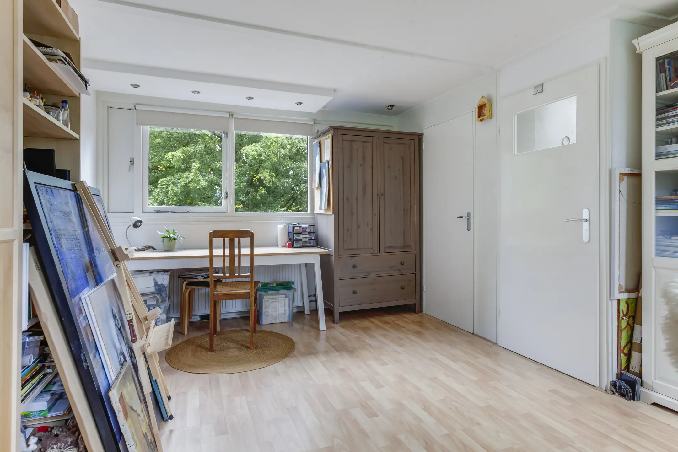 De zolderkamer is royaal en heeft een dakkapel waardoor er volop daglicht binnenkomt. In de aparte technische ruimte vind je de aansluitingen voor wasmachine en droger en de opstelling van de cv-ketel.