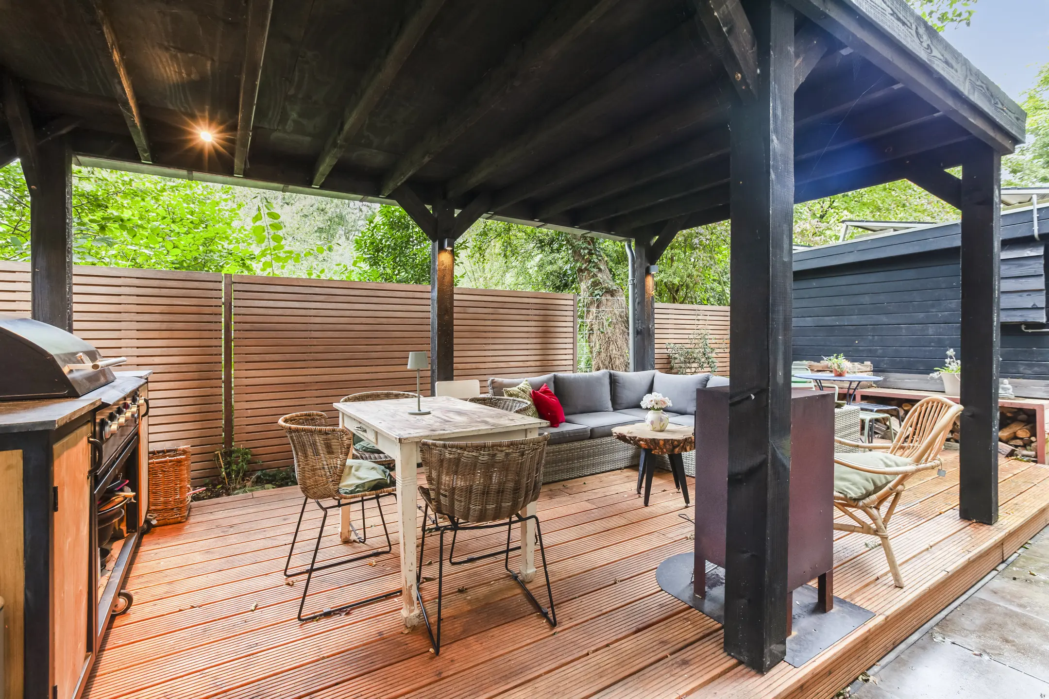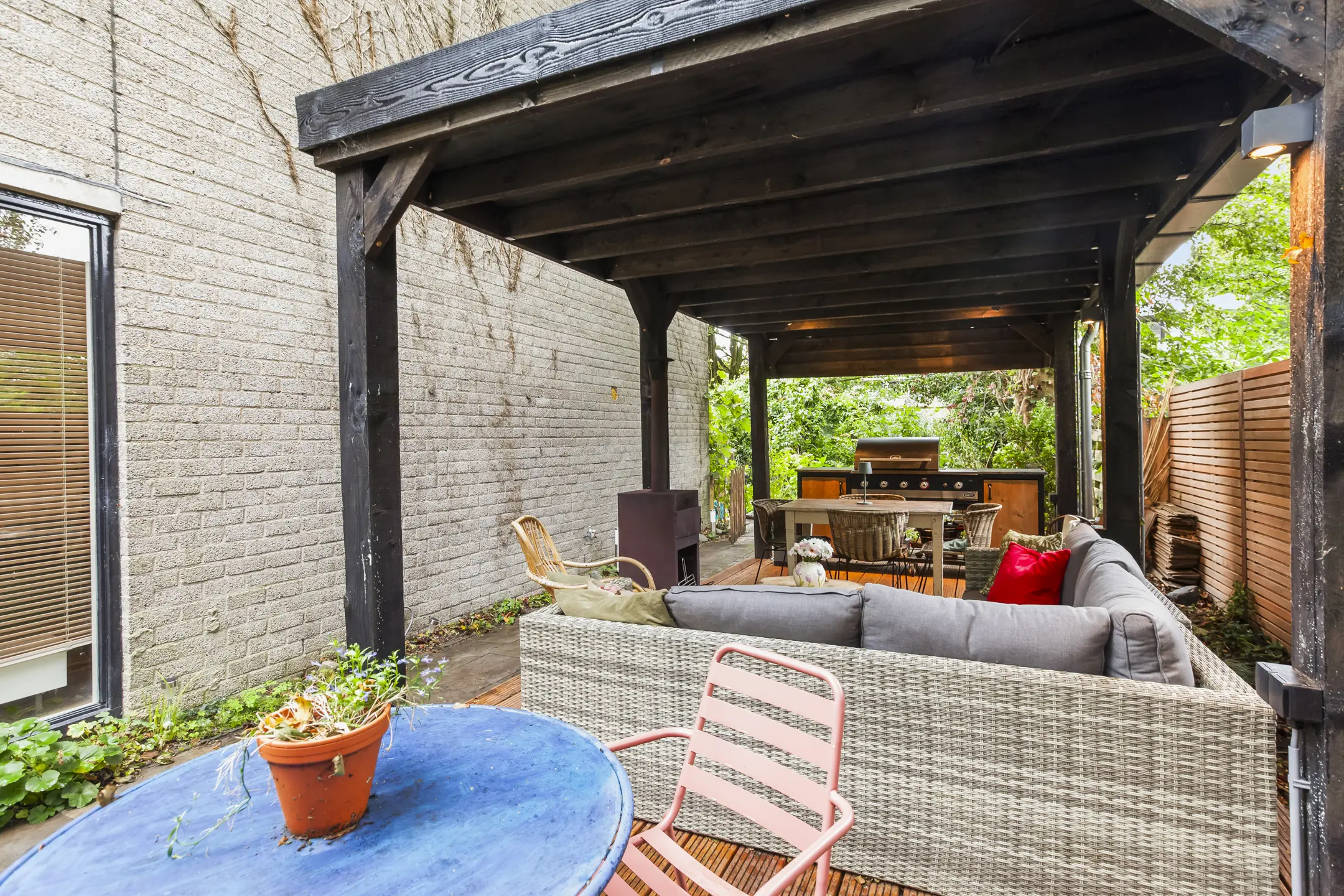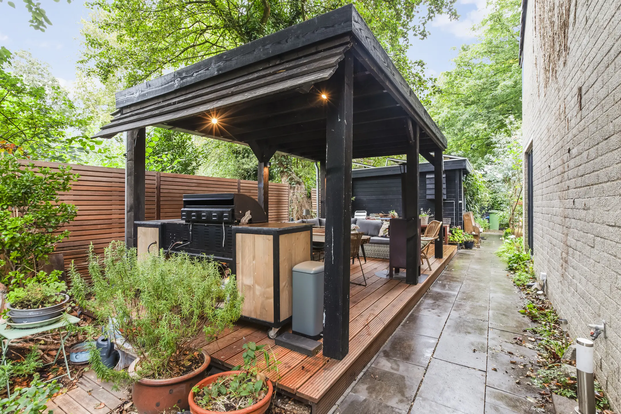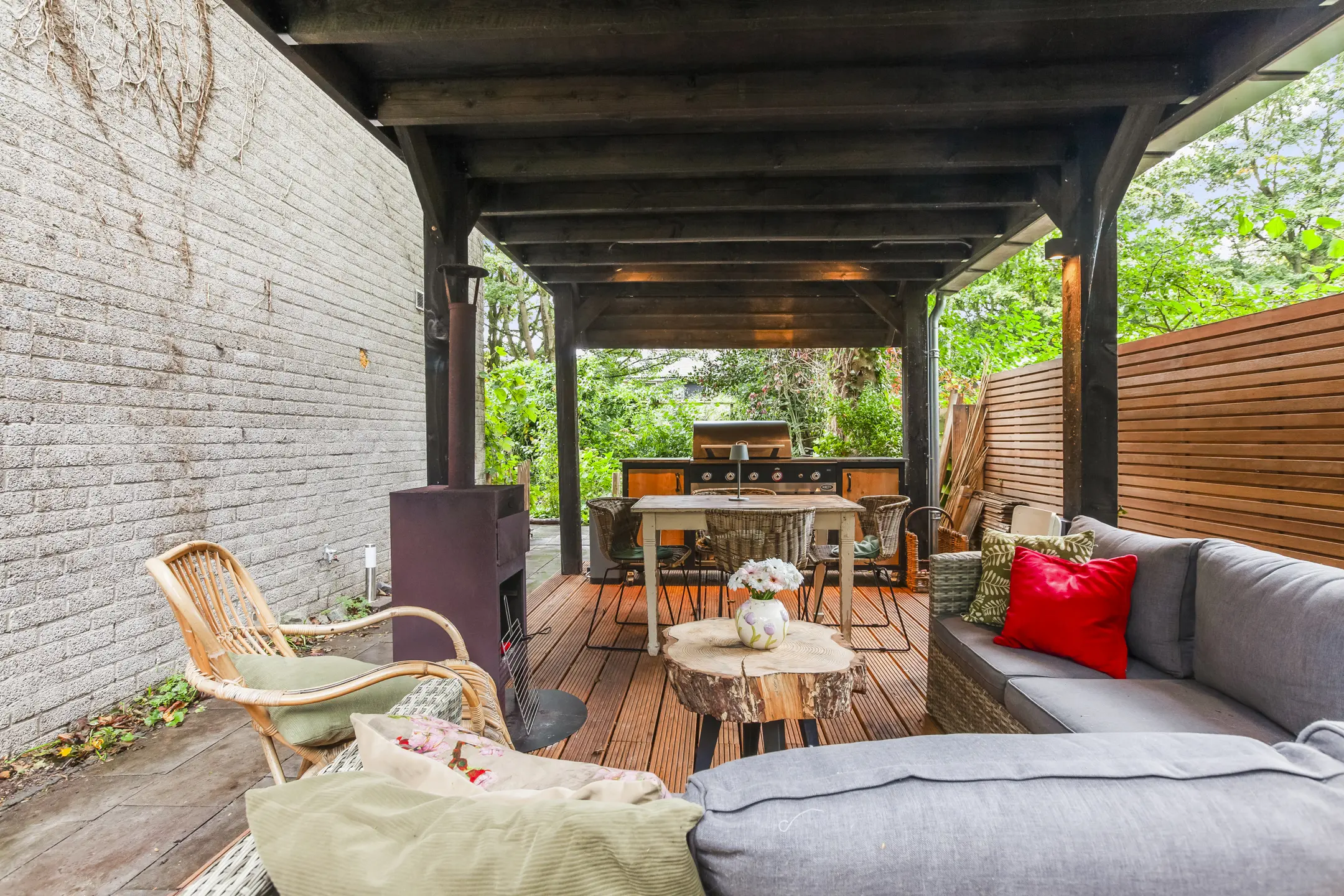 De achtertuin is verrassend ruim en biedt veel mogelijkheden. Achterin de tuin staat een bijgebouw/kantoor dat in 2020 is gerealiseerd en is voorzien van een schuifpui, houtkachel en zonnepanelen. Dit is een fijne plek om te werken of te ontspannen. In 2025 is het buitenschilderwerk van de woning nog professioneel uitgevoerd inclusief de kozijnen van het bijgebouw. Verder vind je in de tuin een houten berging en een royale overkapping met buitenkeuken, geplaatst begin 2025 en voorzien van elektra. Ideaal voor lange zomeravonden.
