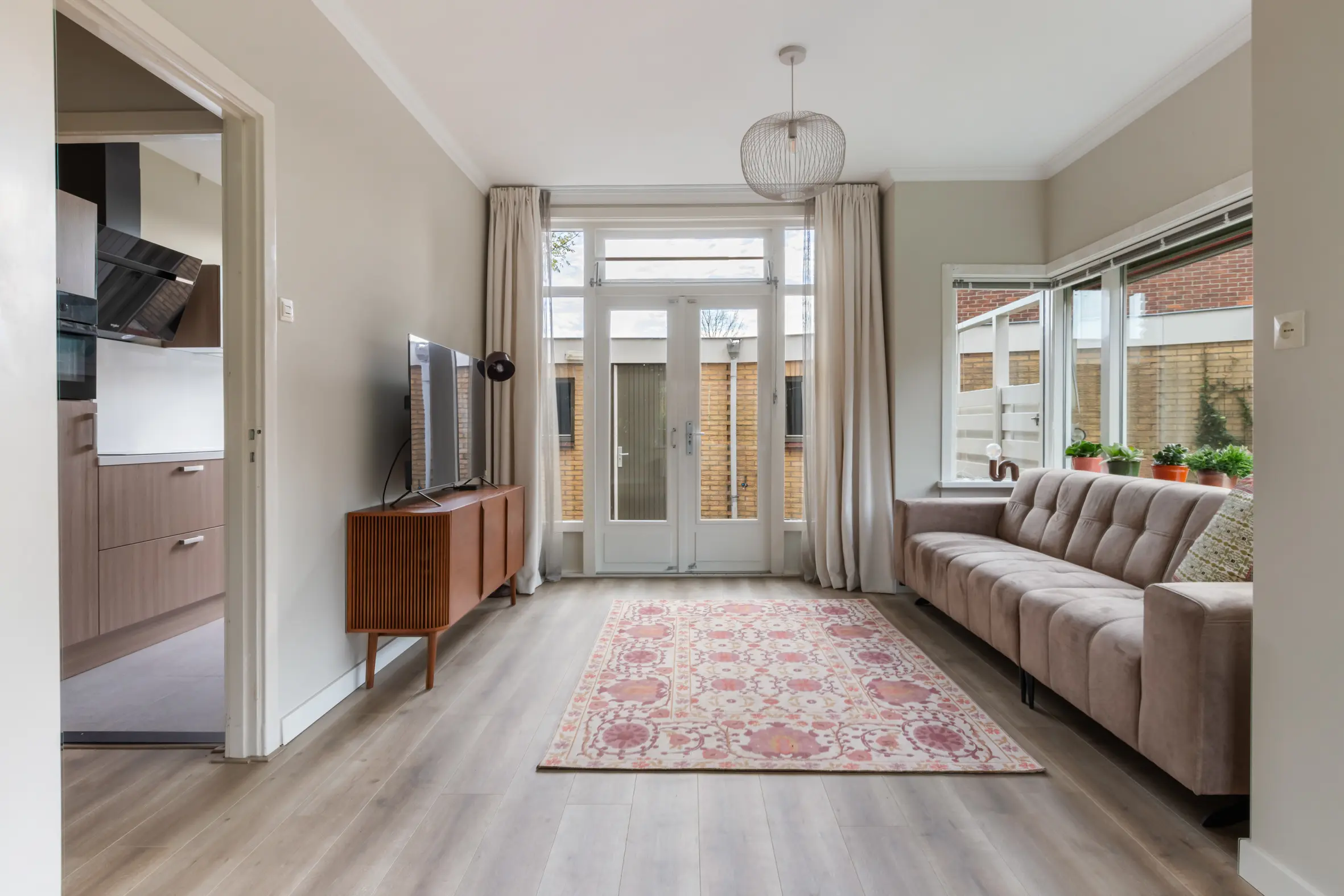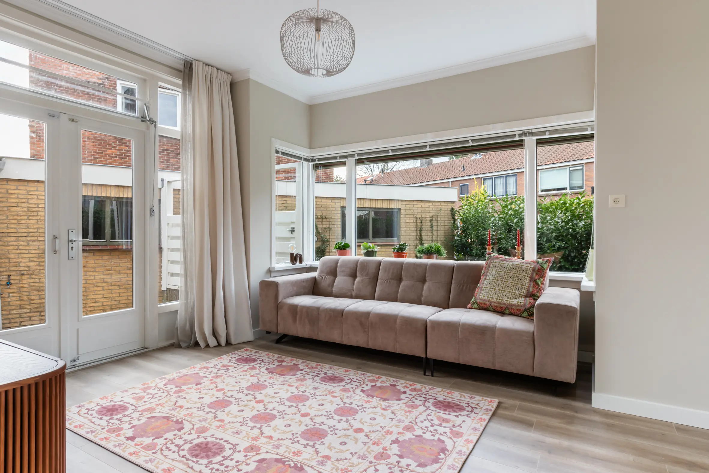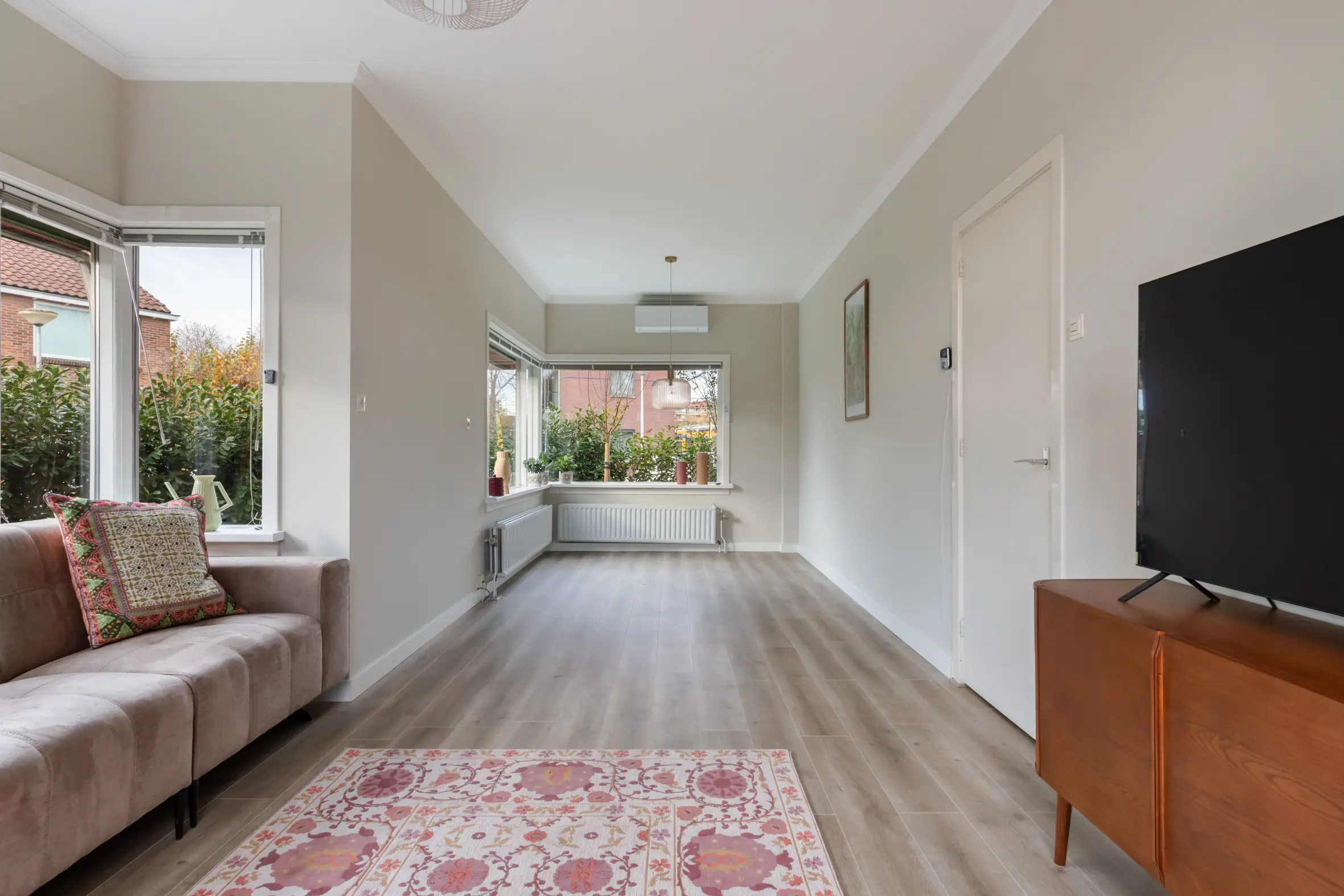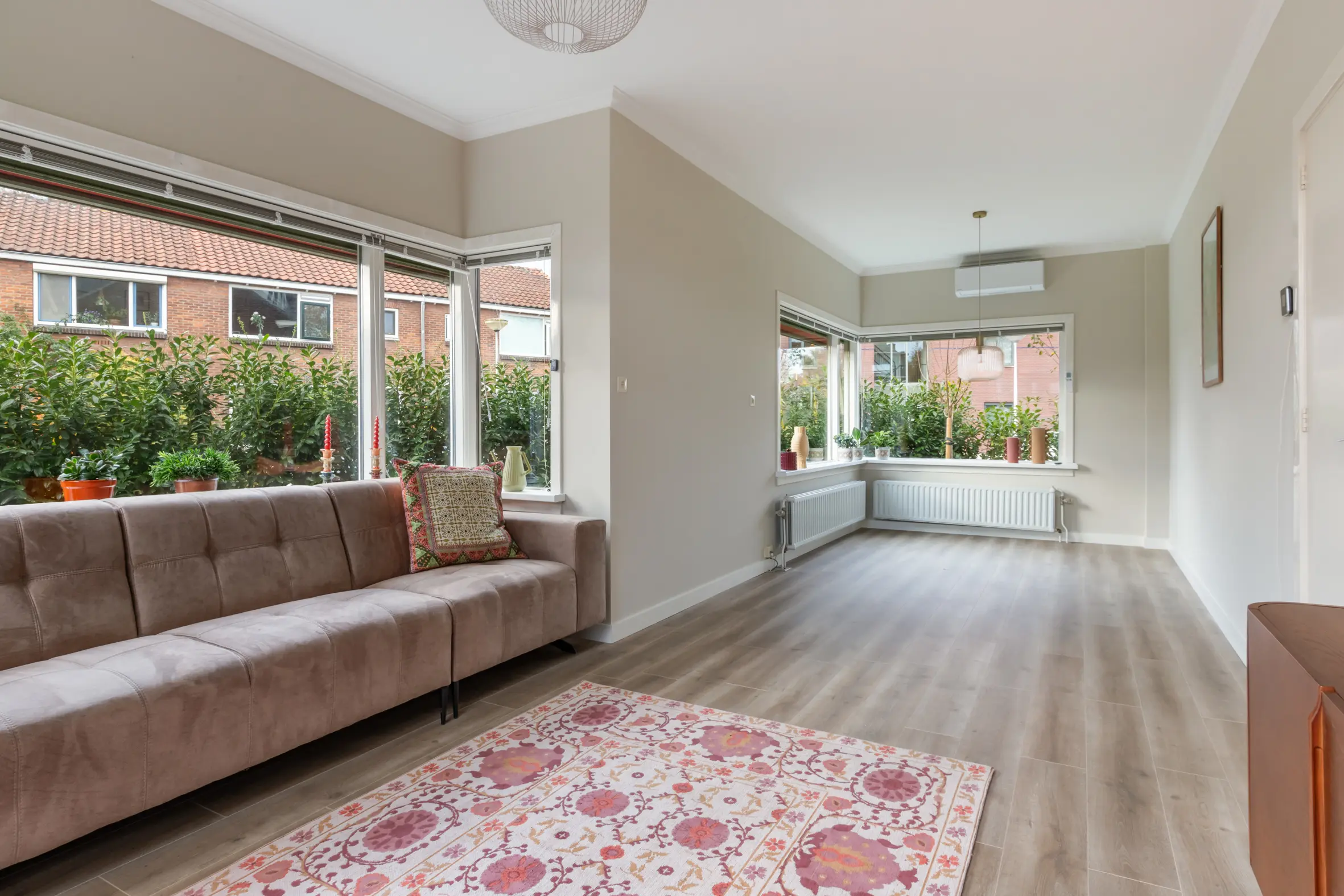 Binnenkomst in een ruime hal met vernieuwde meterkast, trapkast en toiletruimte. De lichte woonkamer heeft een erker aan de zijkant en openslaande deuren naar de achtertuin. Tevens is de woonkamer voorzien van een airco unit die zowel verkoeling als verwarming biedt.