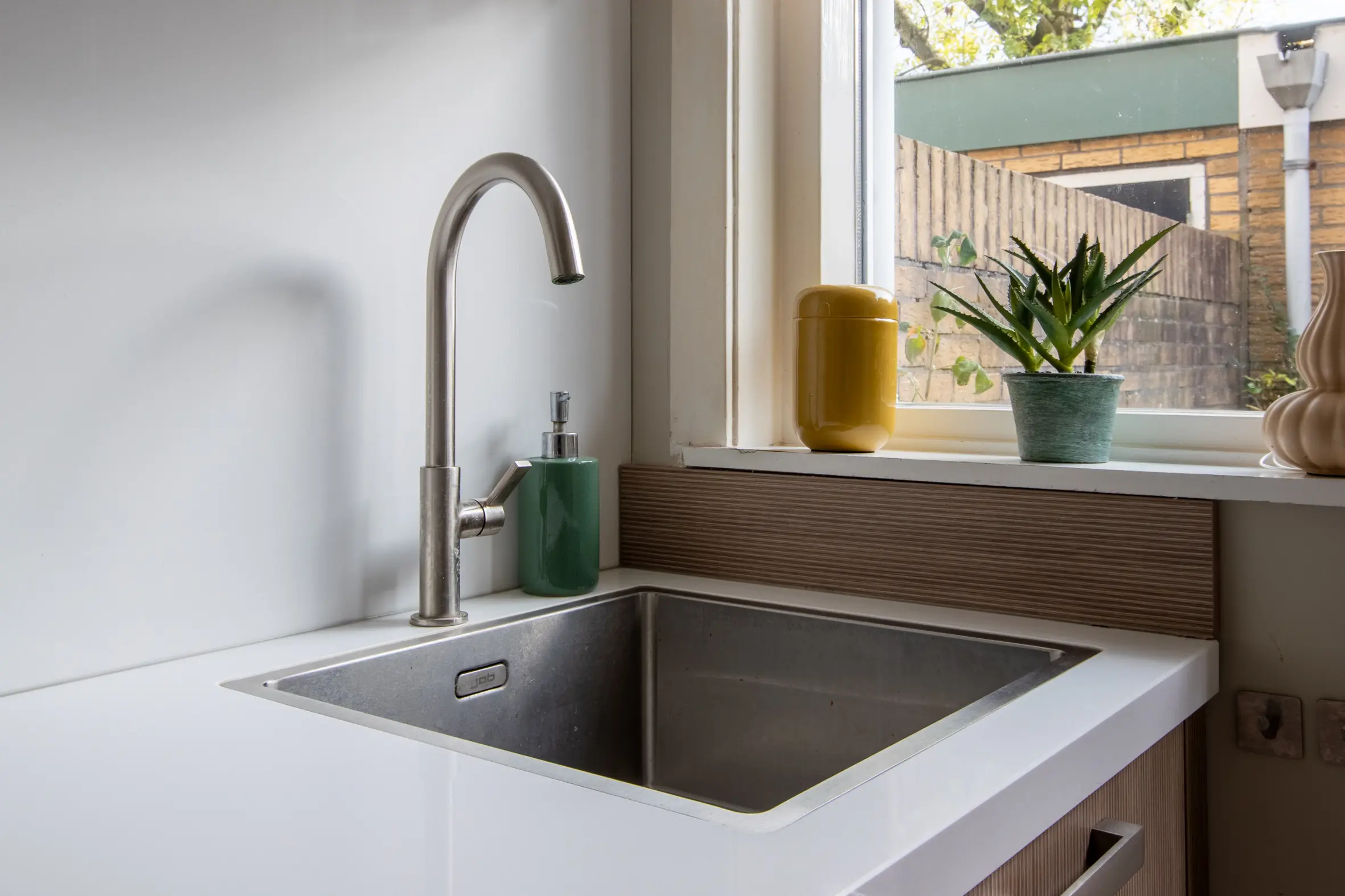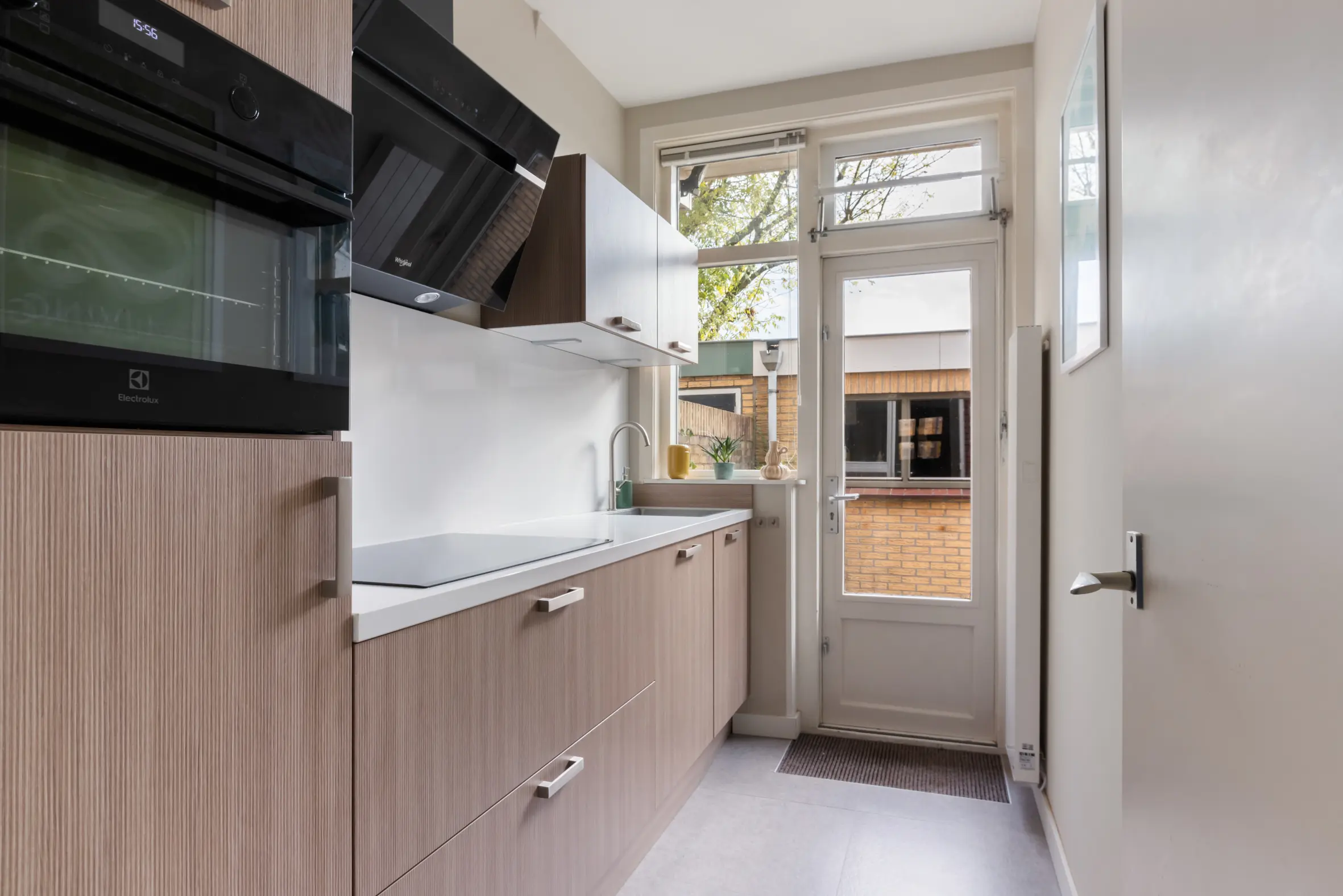 De moderne dichte keuken aan de achterzijde is uitgevoerd in Japandi-stijl (Brugman, 2024) en voorzien van diverse inbouwapparatuur, zoals: