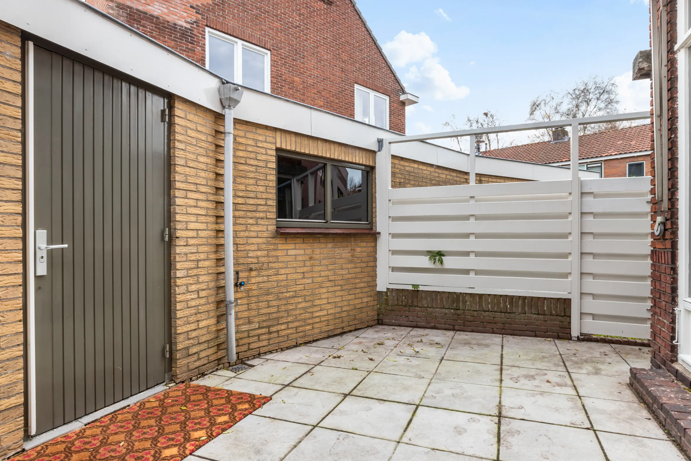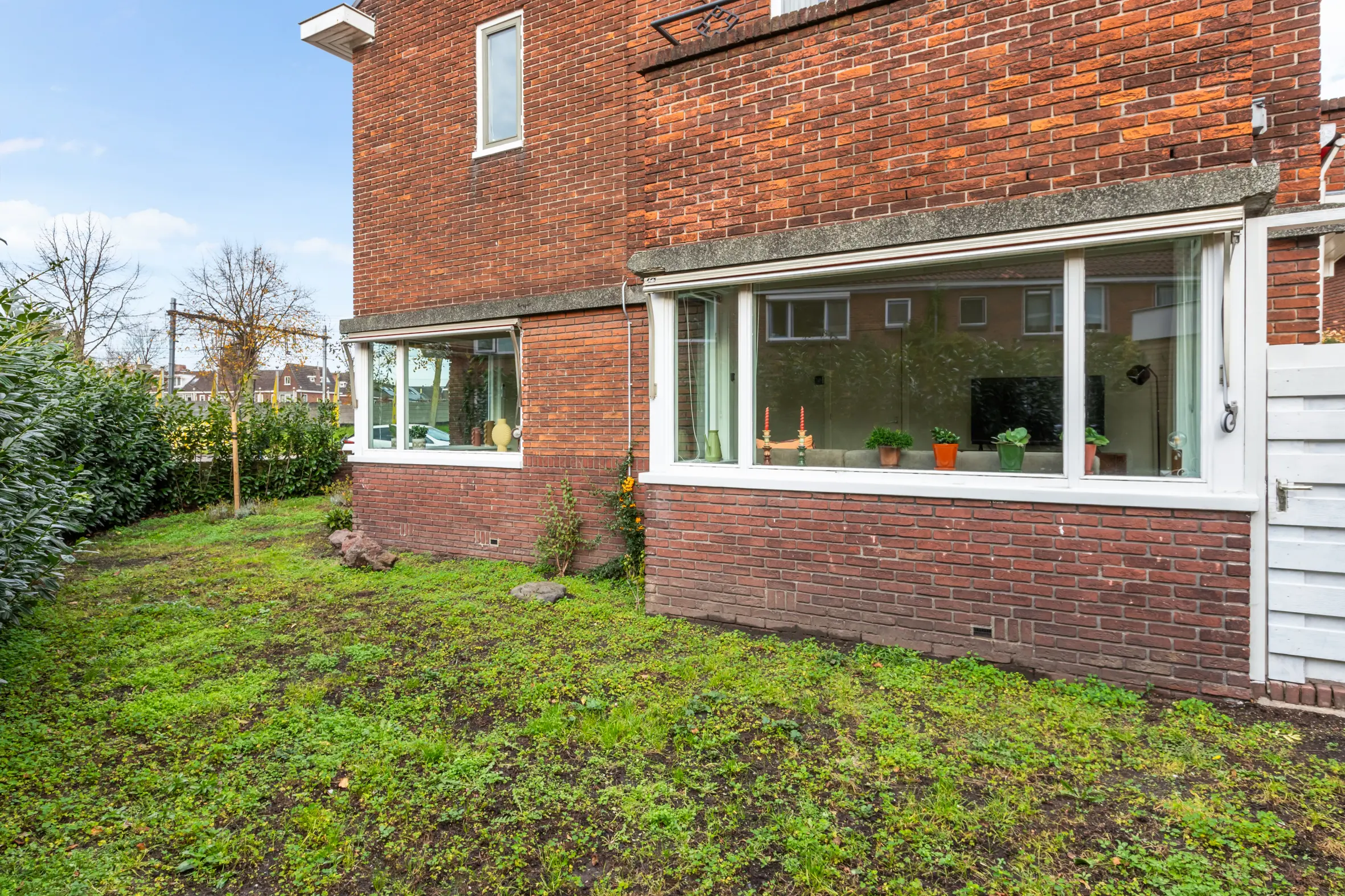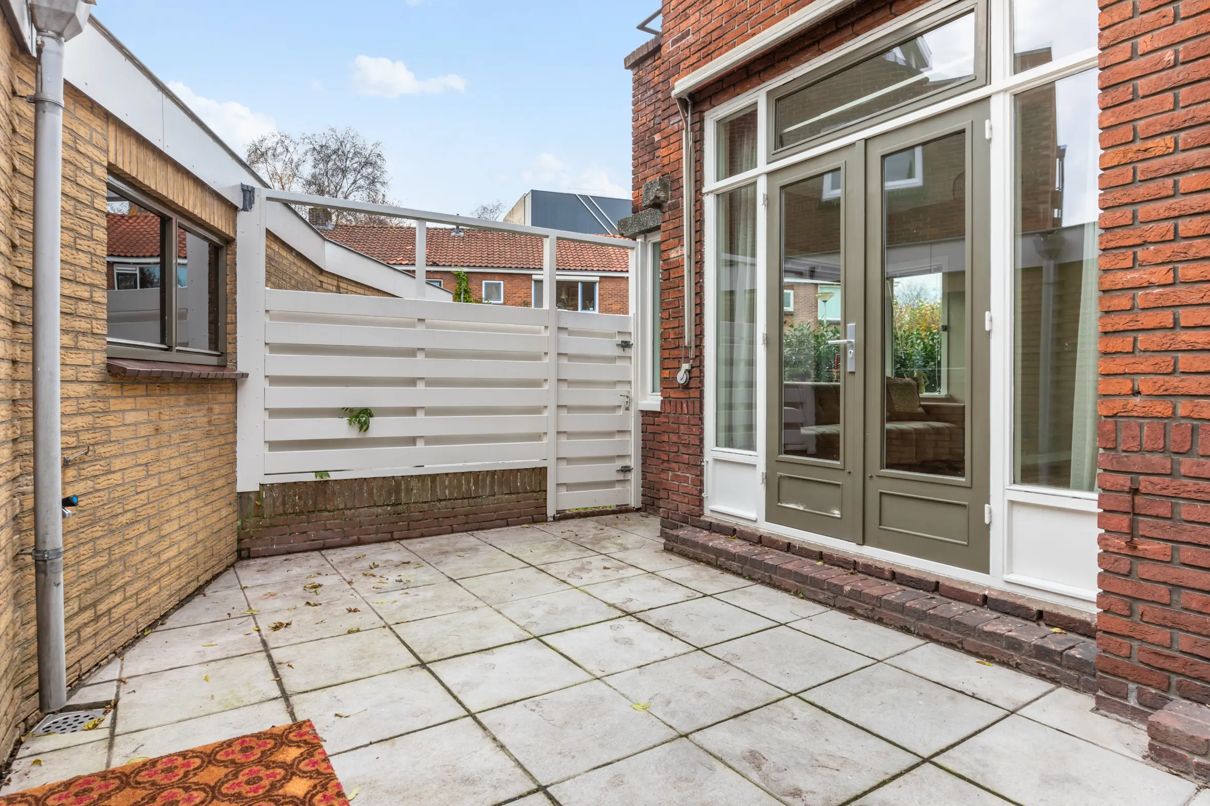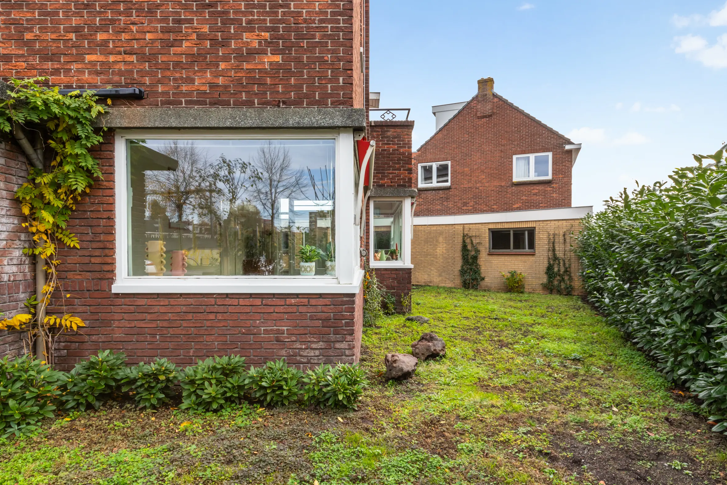 De woning beschikt over een ruime voortuin en zij-tuin op het zuiden. De jonge laurierhaag zorgt voor een groene afscheiding en privacy. Via een afsluitbare poort is de betegelde achtertuin bereikbaar. Hier is ook toegang tot de garage. De tuin is voorzien van een buitenkraan en een plantenborder.