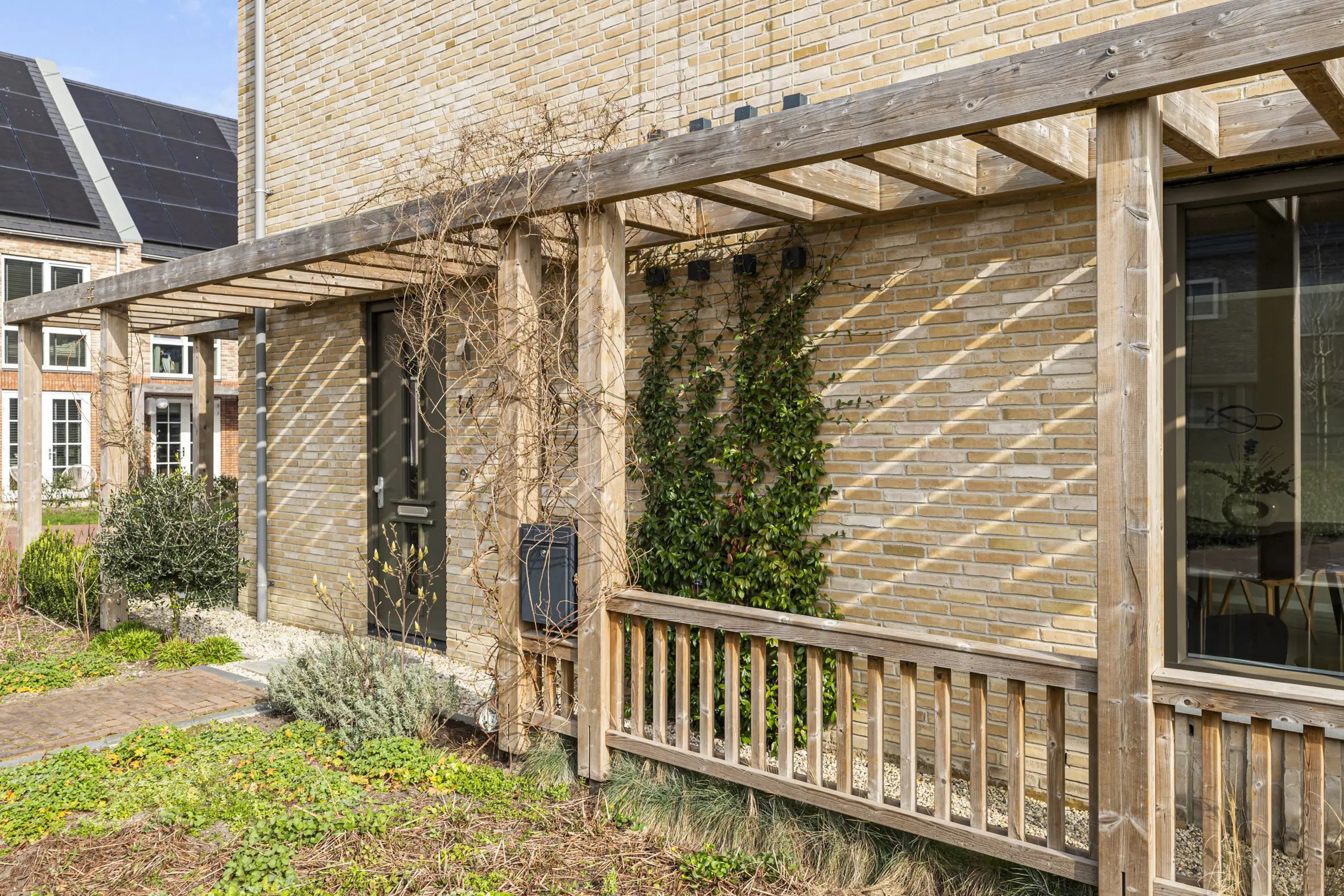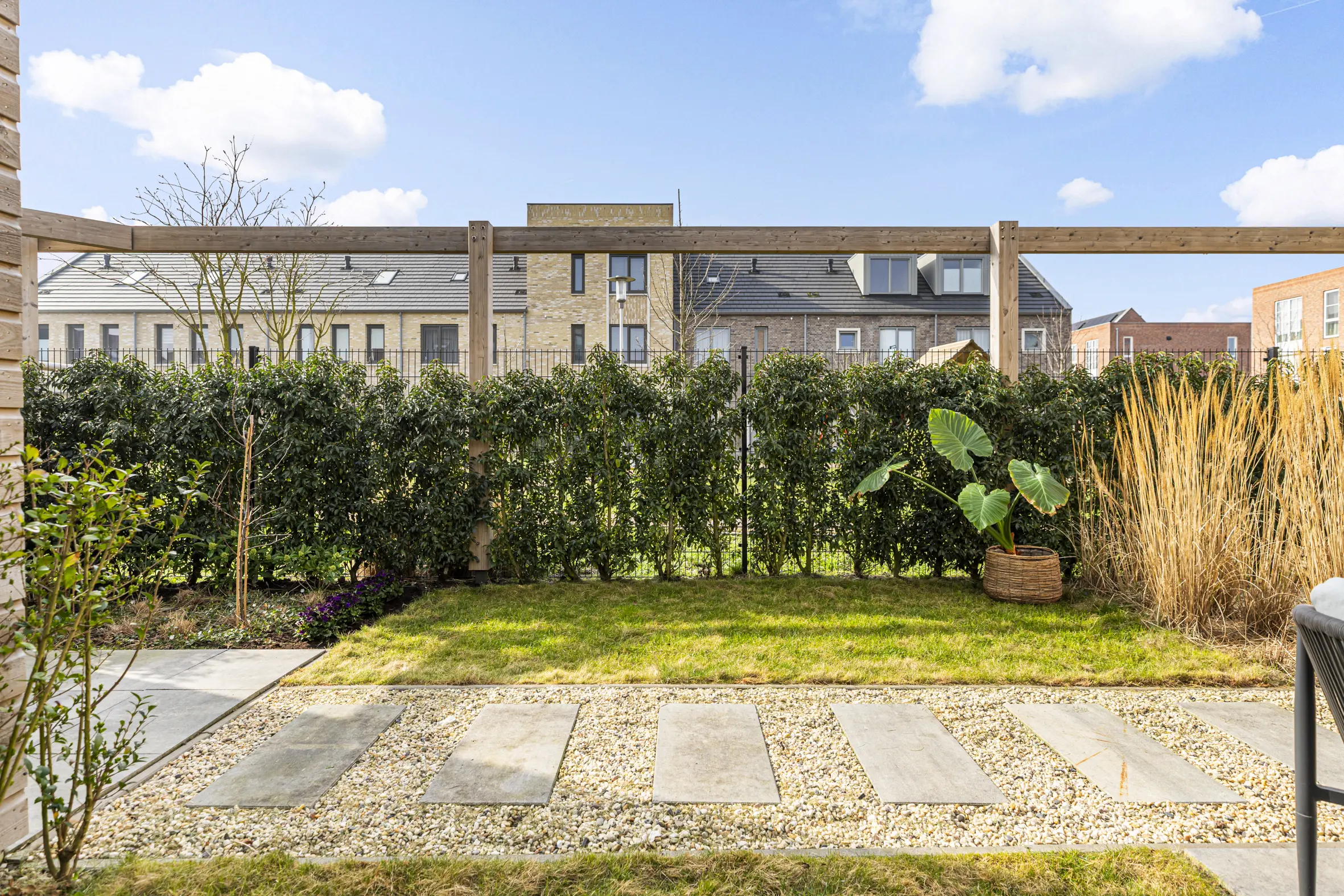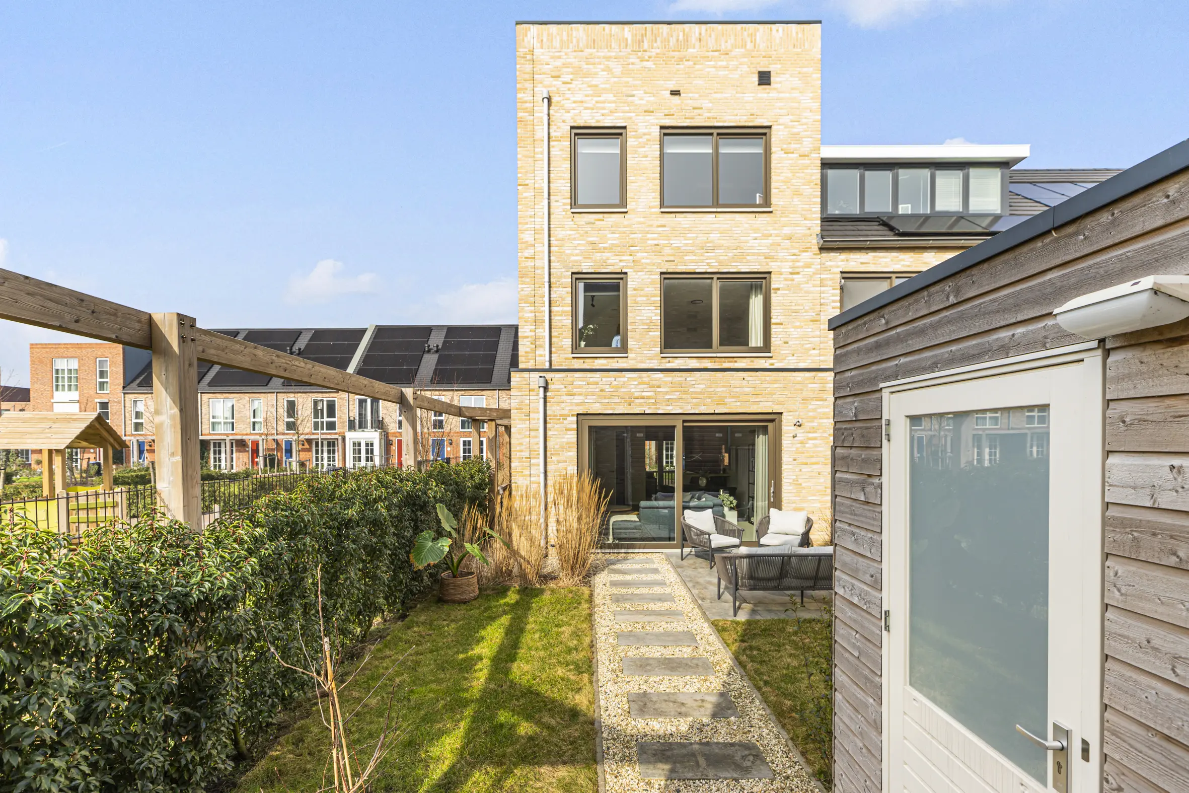 De achtertuin is fraai aangelegd en gelegen op het zuidoosten. Het is een heerlijke plek om buiten te zitten, te eten of kinderen te laten spelen. De tuin is rondom voorzien van een hardhouten pergola, voor een extra groene 'feeling' en meer privacy kun je deze met groen laten begroeien. Ook is de tuin vanaf de zijkant bereikbaar en via een achterom. Achterin de tuin staat een vrijstaande houten berging waar fietsen en tuinspullen gemakkelijk kunnen worden opgeborgen.
