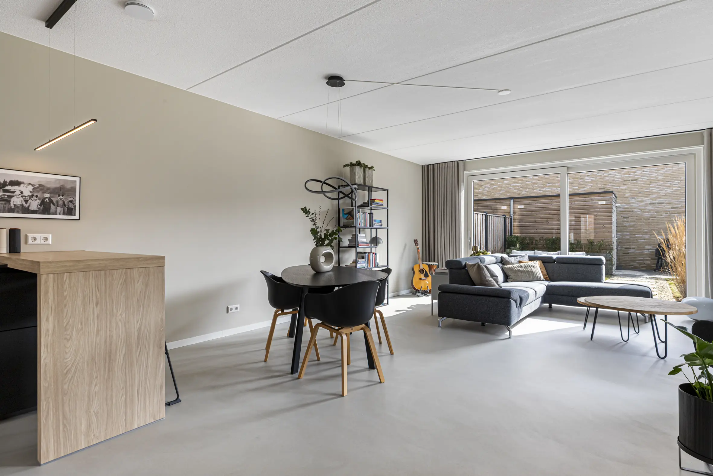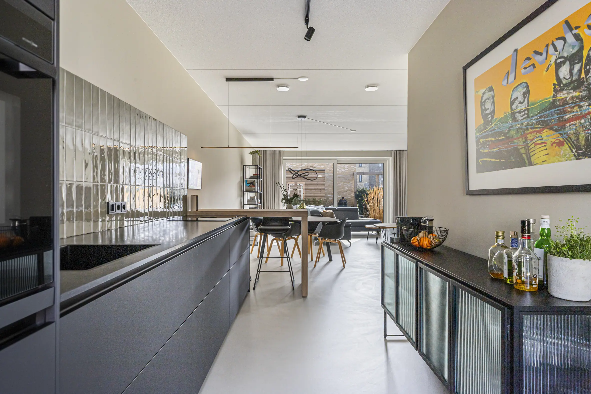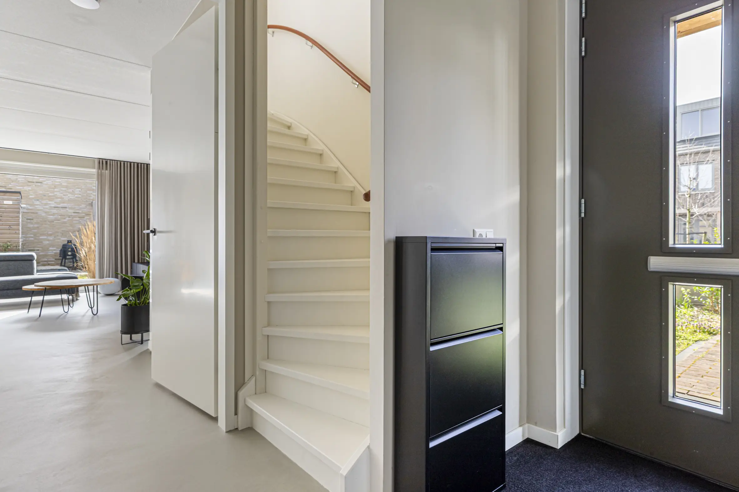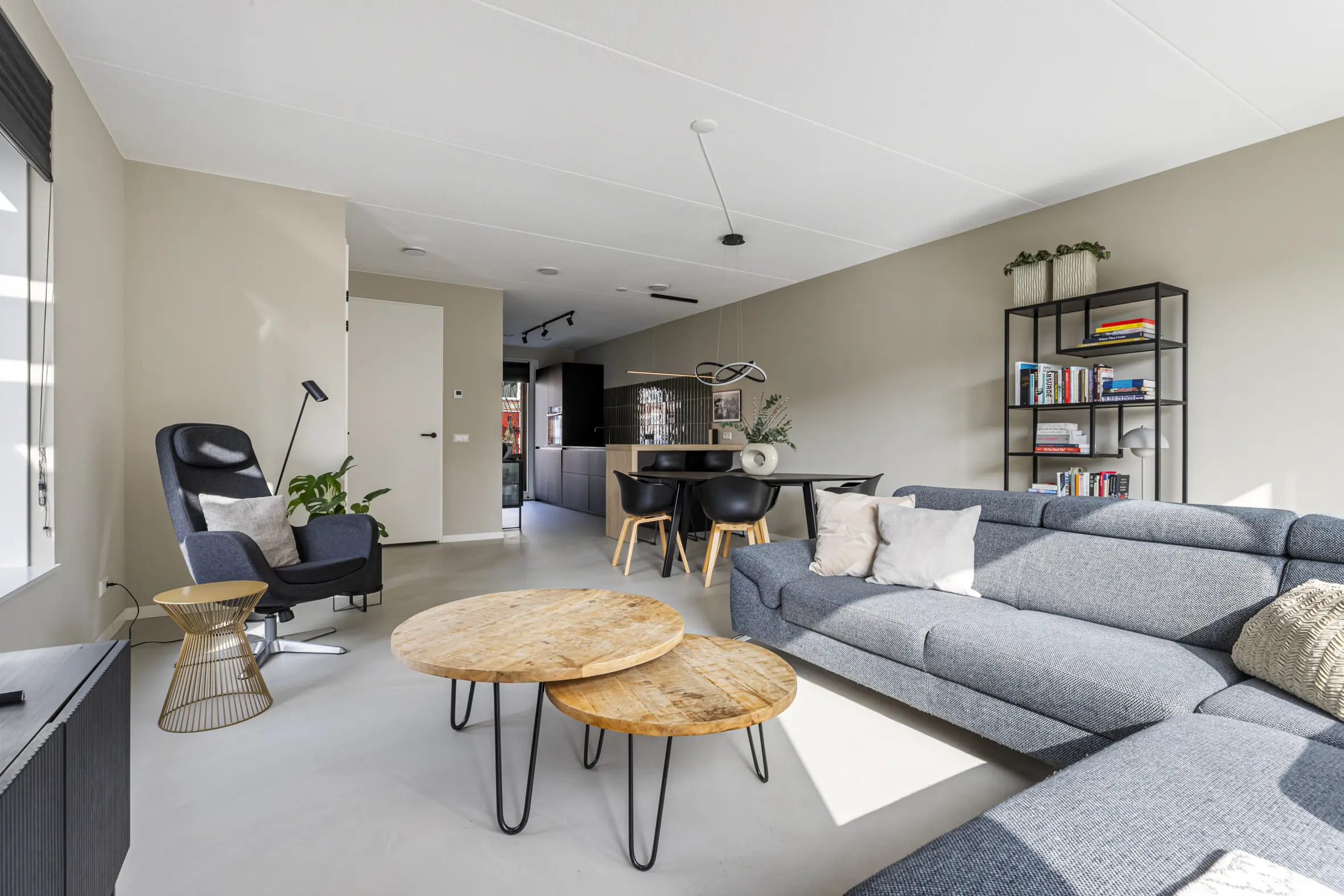 Entree met garderobe, meterkast, toilet, technische ruimte met o.a. bodemwarmtepomp en trapopgang naar de eerste verdieping. Via een stijlvolle deur kom je in de leefruimte. De gehele begane grond is voorzien van een hoogwaardige cementgebonden gietvloer.