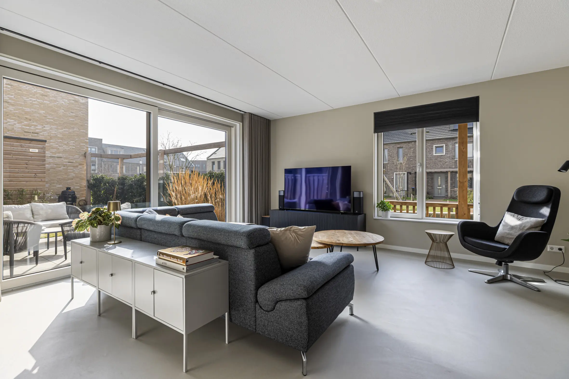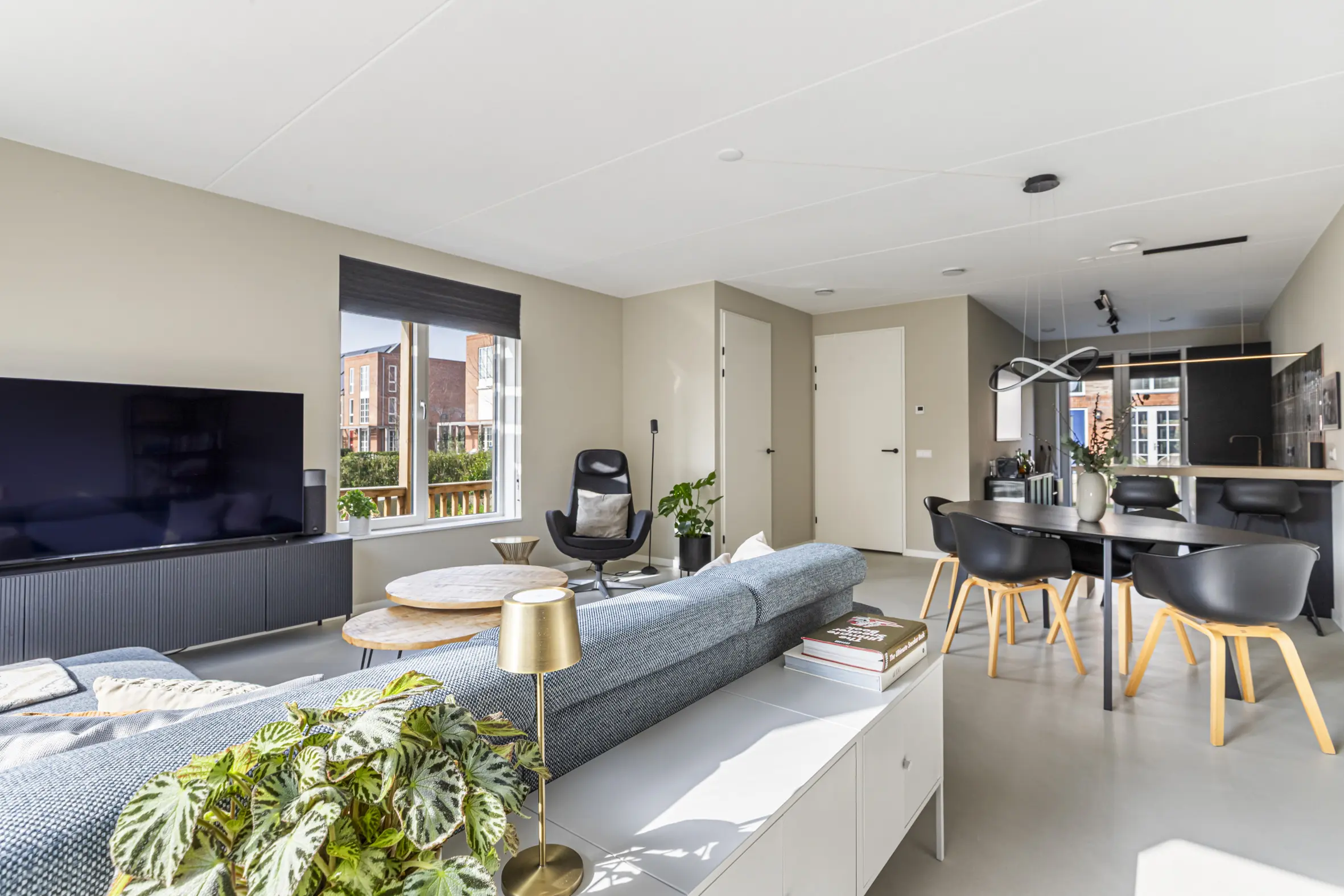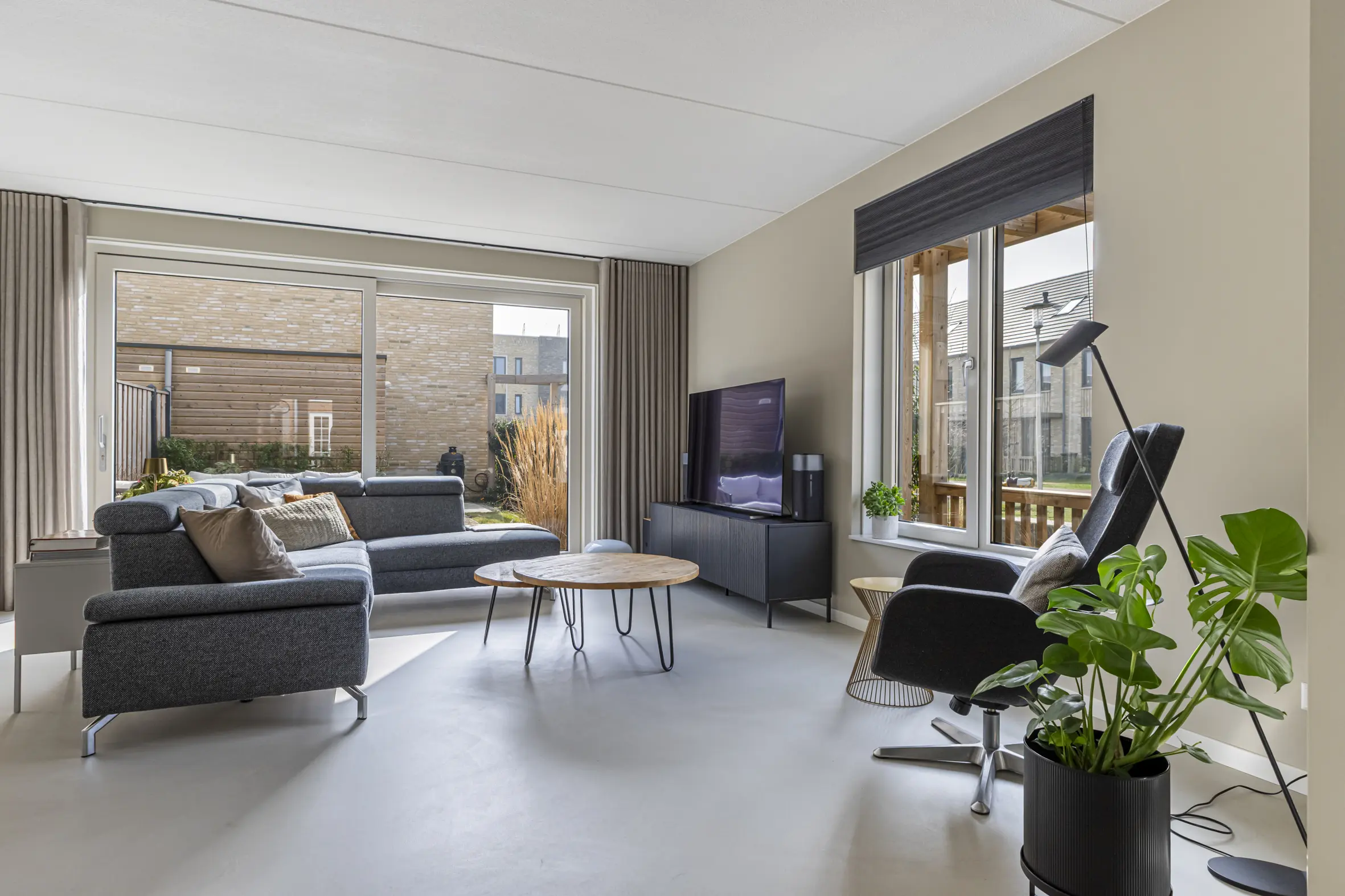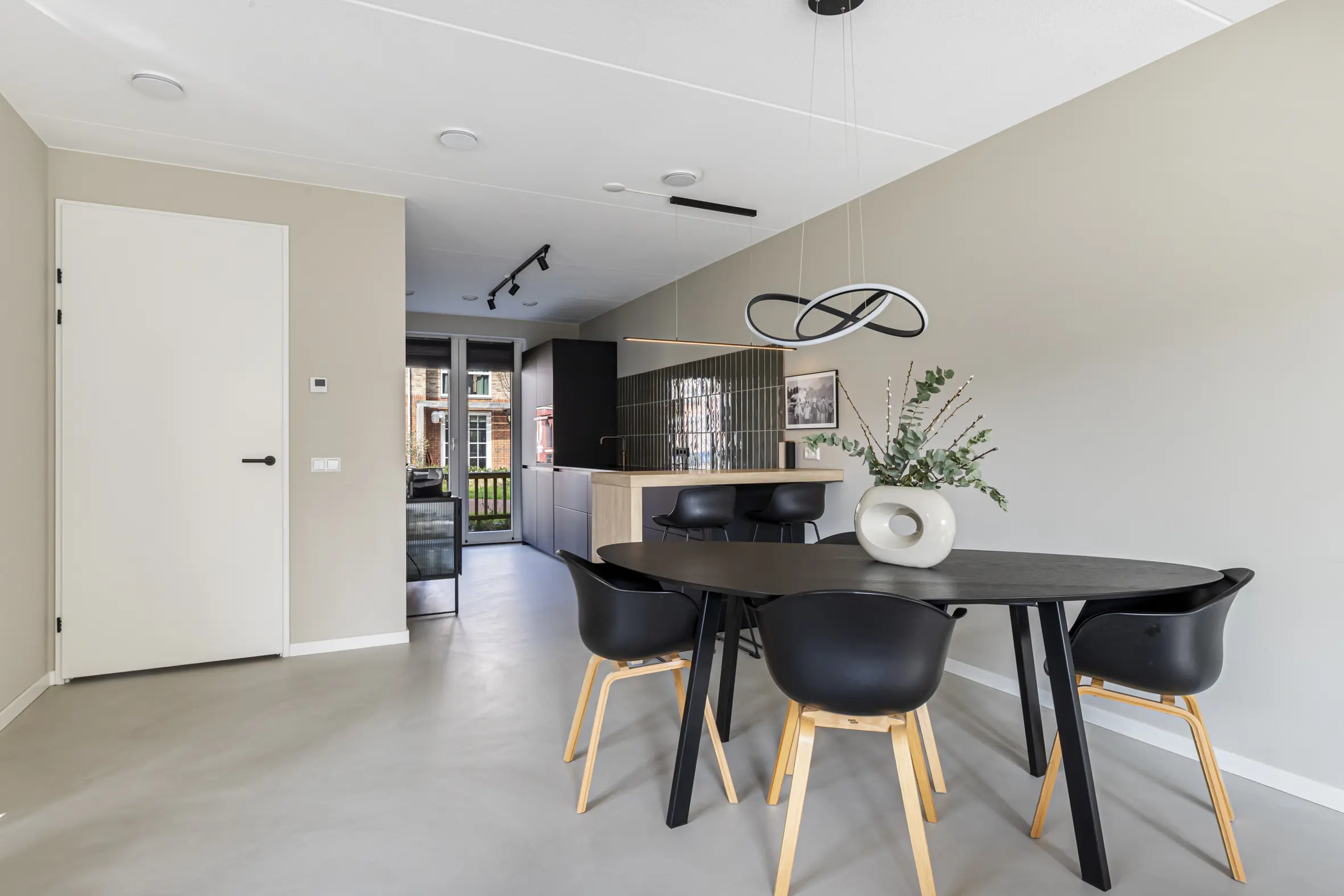 Entree met garderobe, meterkast, toilet, technische ruimte met o.a. bodemwarmtepomp en trapopgang naar de eerste verdieping. Via een stijlvolle deur kom je in de leefruimte. De gehele begane grond is voorzien van een hoogwaardige cementgebonden gietvloer.