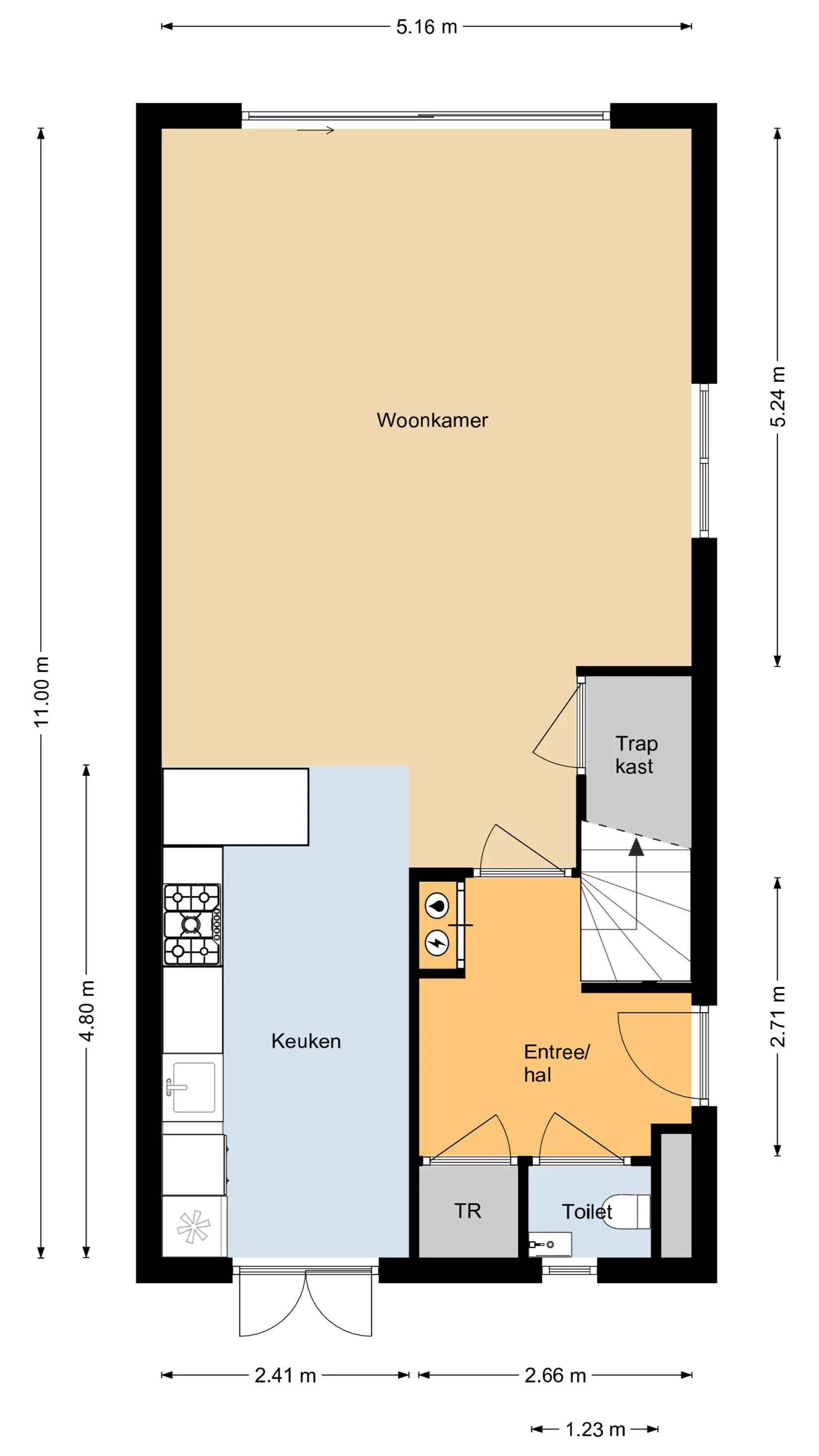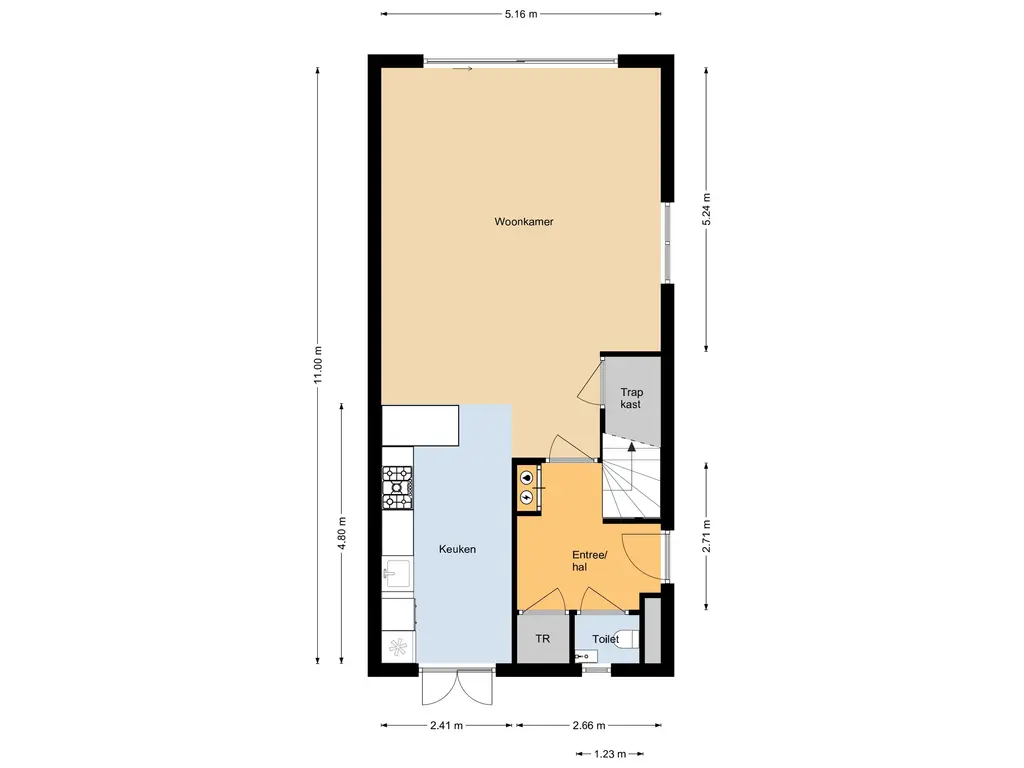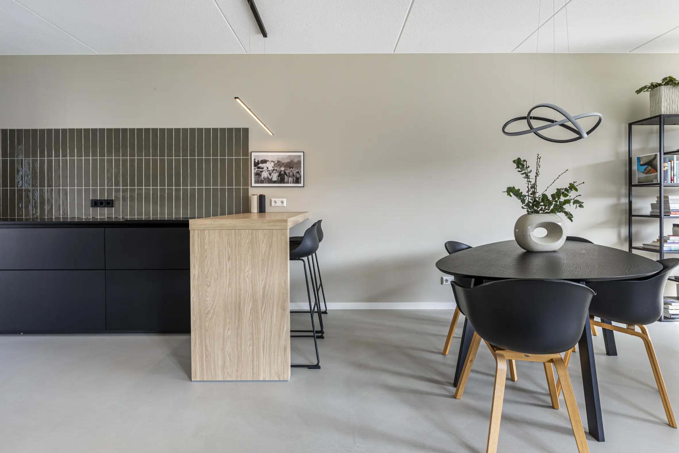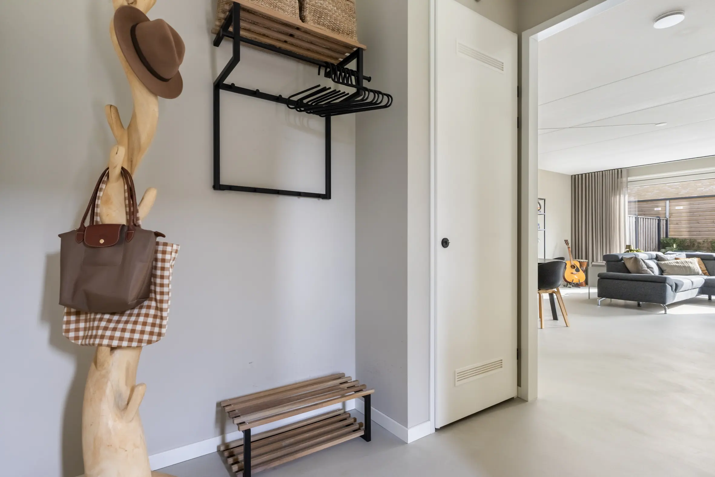 Entree met garderobe, meterkast, toilet, technische ruimte met o.a. bodemwarmtepomp en trapopgang naar de eerste verdieping. Via een stijlvolle deur kom je in de leefruimte. De gehele begane grond is voorzien van een hoogwaardige cementgebonden gietvloer.