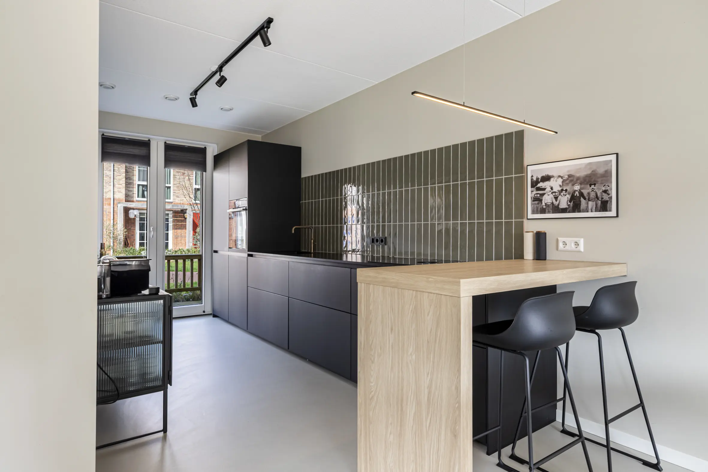 Aan de voorzijde ligt de luxe keuken in een strakke rechte opstelling met een barretje. De keuken (Next125) is voorzien van moderne inbouwapparatuur:
