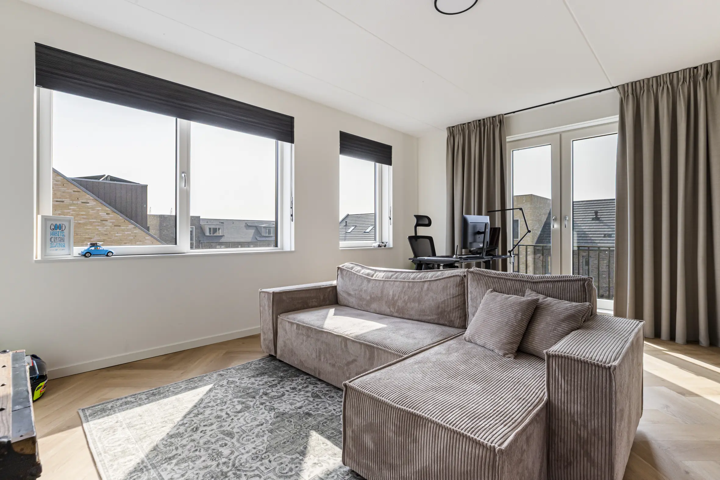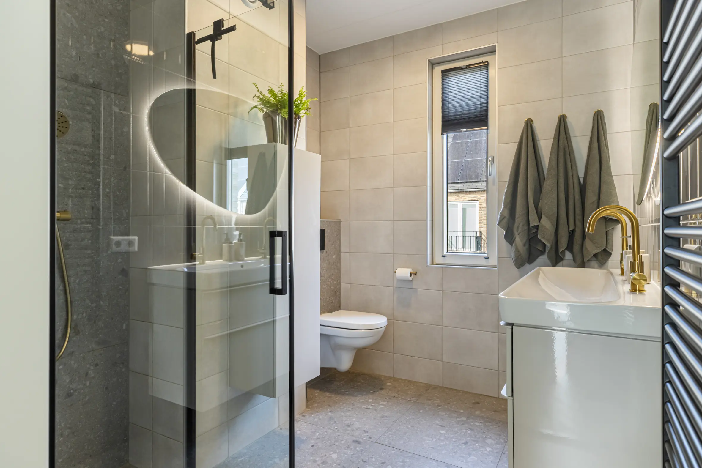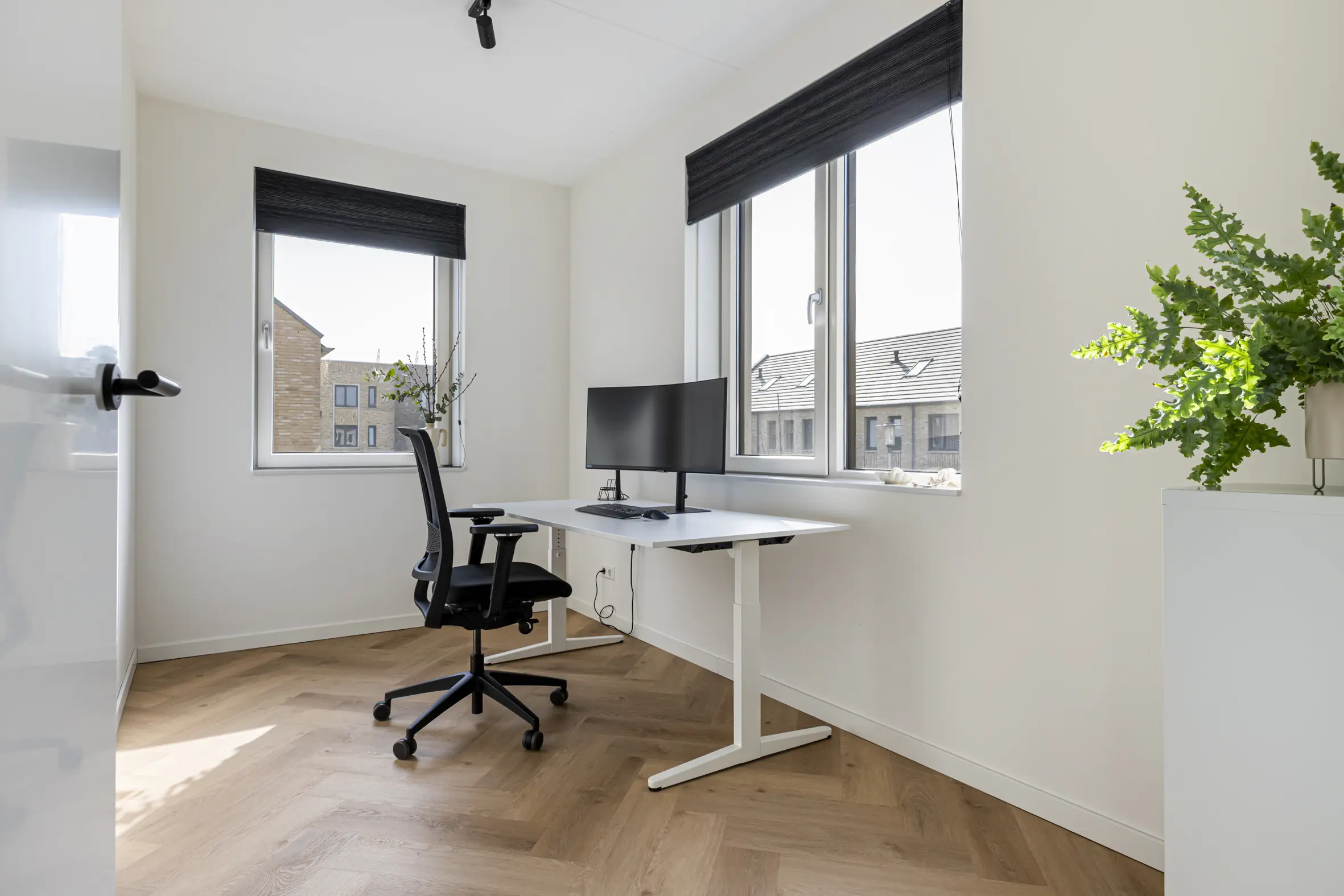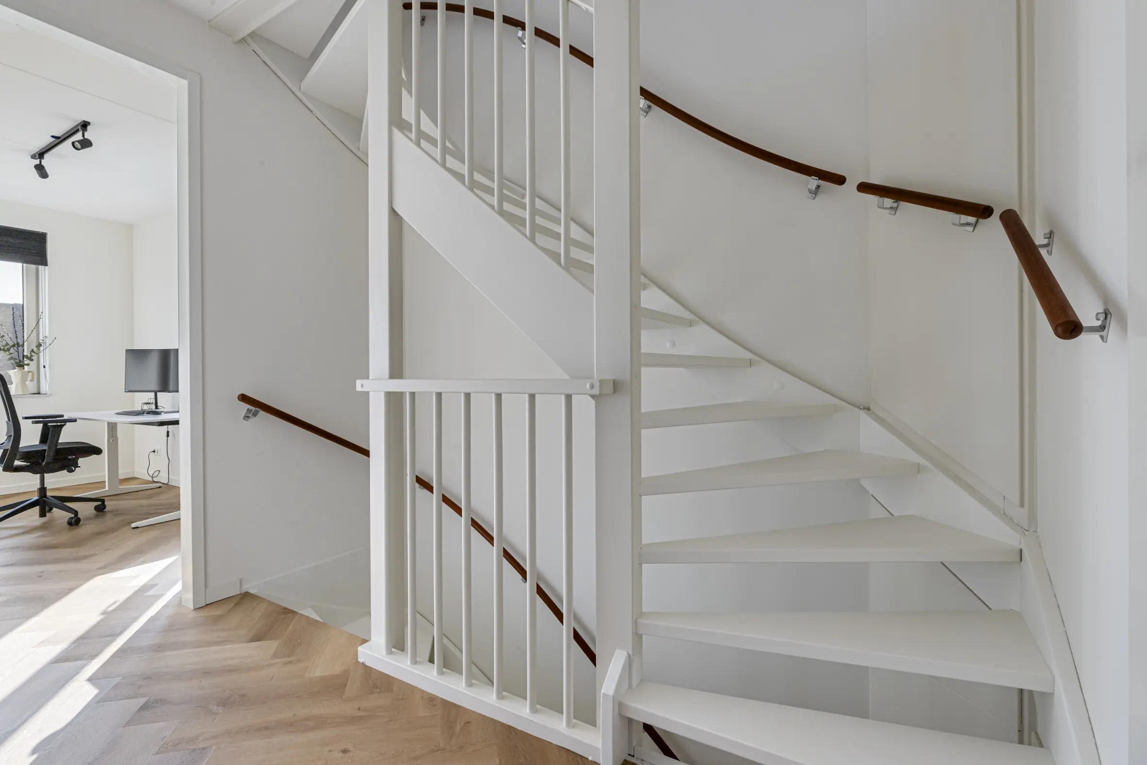 Ruime overloop met toegang tot drie goed bemeten slaapkamers, voorzien van een visgraat PVC-vloer. De moderne badkamer is compleet ingericht met een inloopdouche, dubbel wastafelmeubel, spiegel met verlichting, elektrische radiator, bedienbare mechanische ventilatie, vaste hangende kast en een tweede toilet.