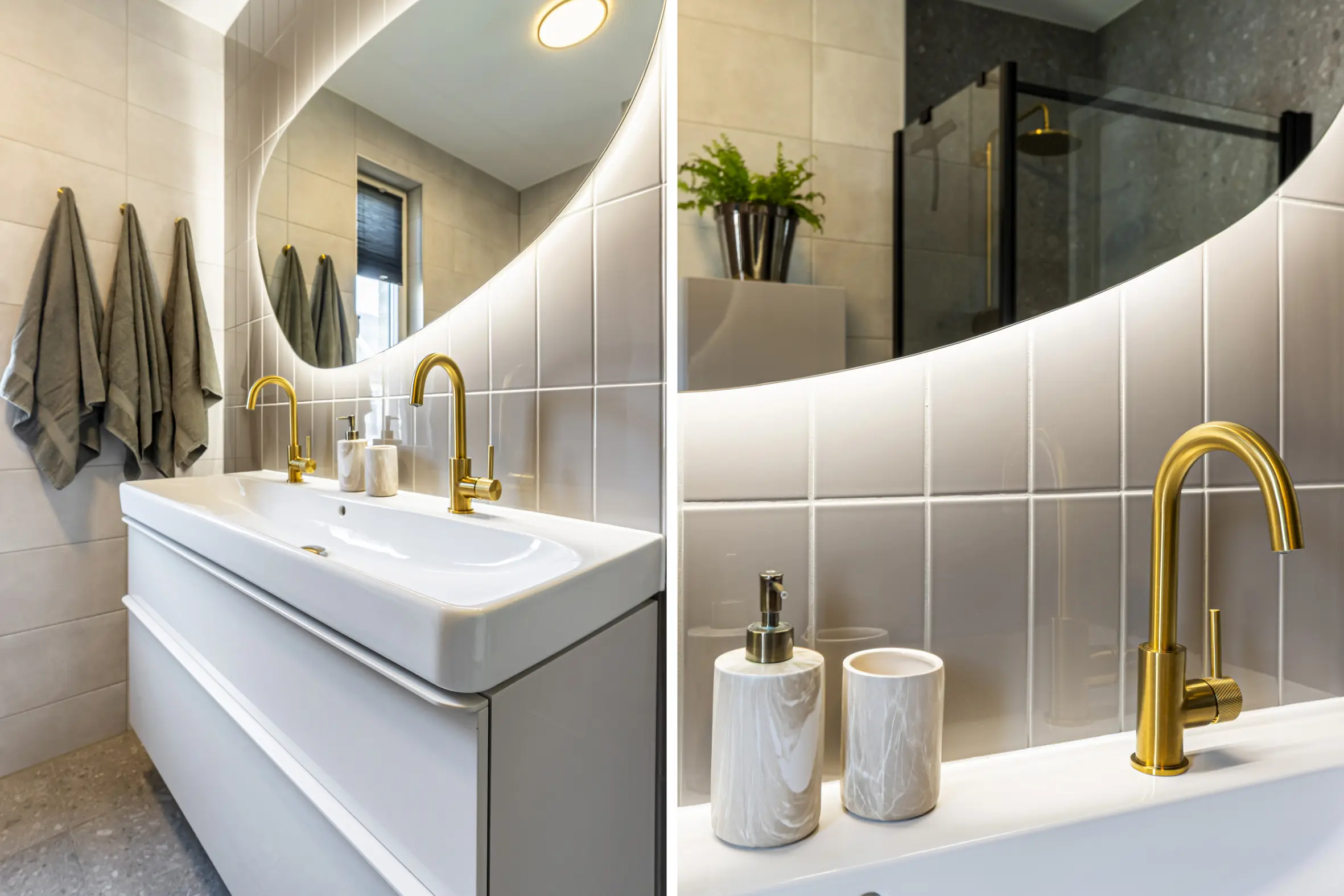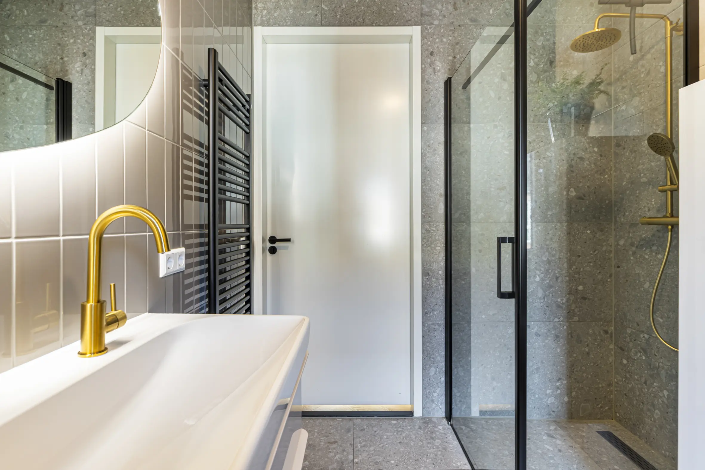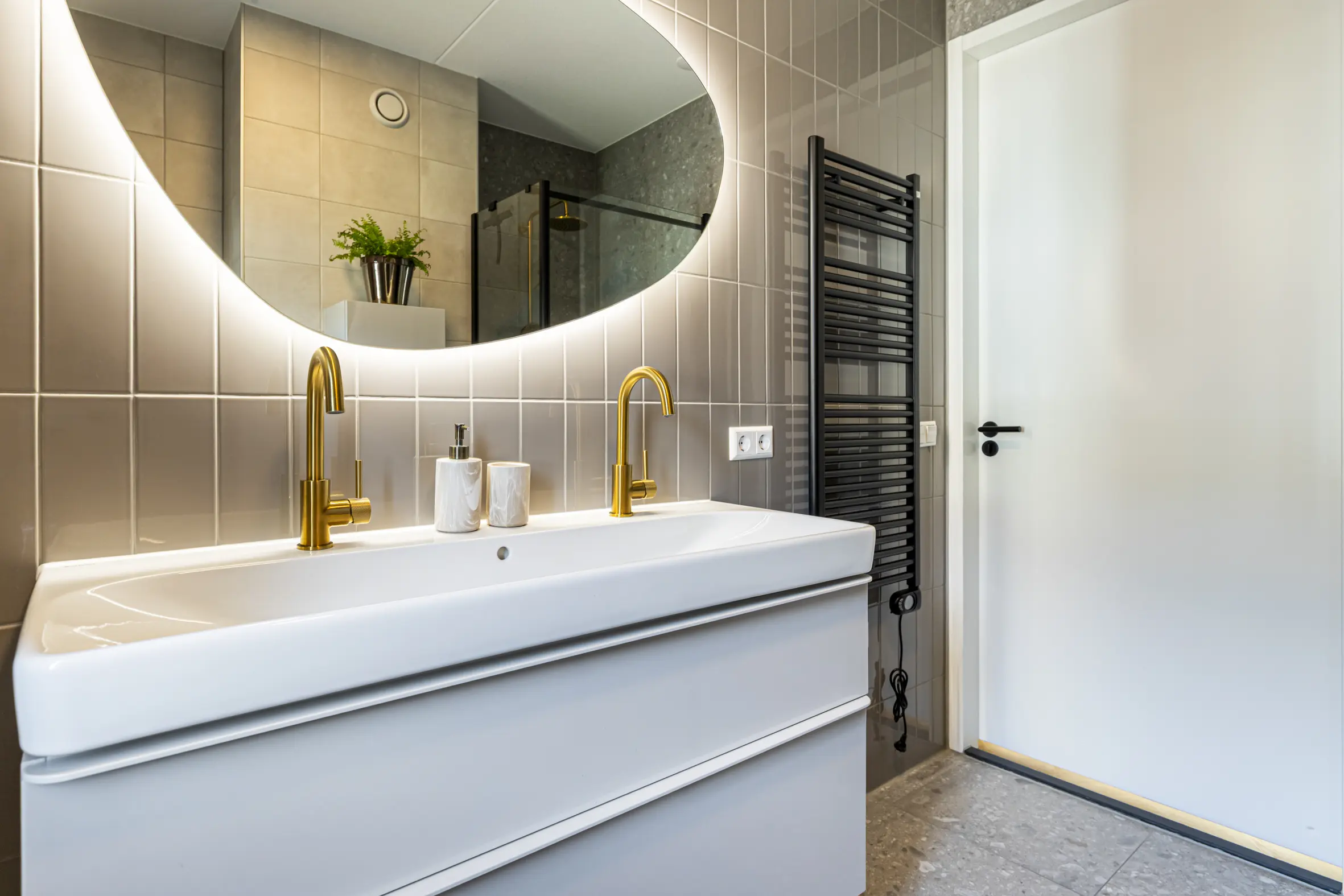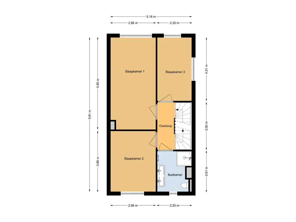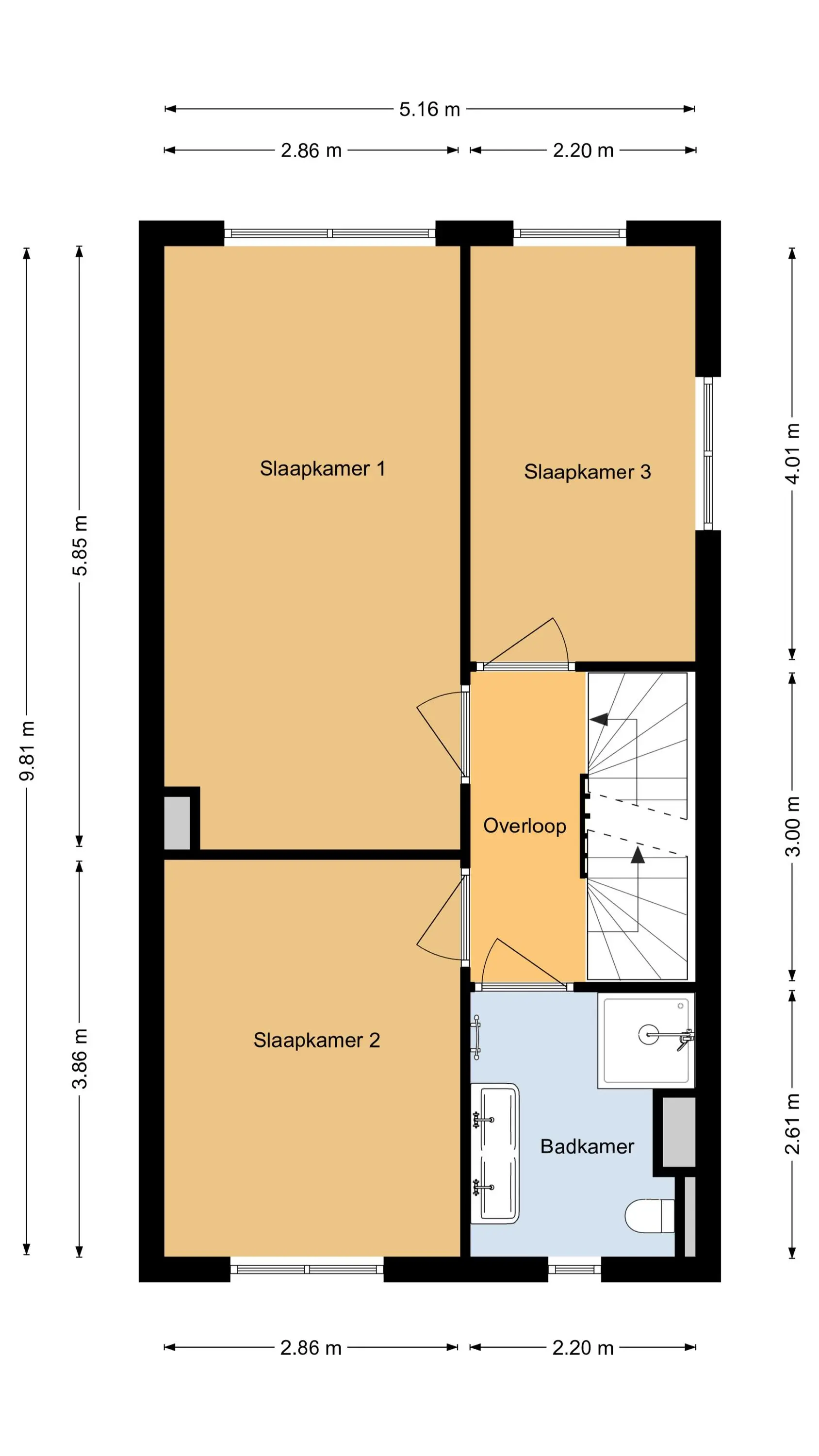 Ruime overloop met toegang tot drie goed bemeten slaapkamers, voorzien van een visgraat PVC-vloer. De moderne badkamer is compleet ingericht met een inloopdouche, dubbel wastafelmeubel, spiegel met verlichting, elektrische radiator, bedienbare mechanische ventilatie, vaste hangende kast en een tweede toilet.