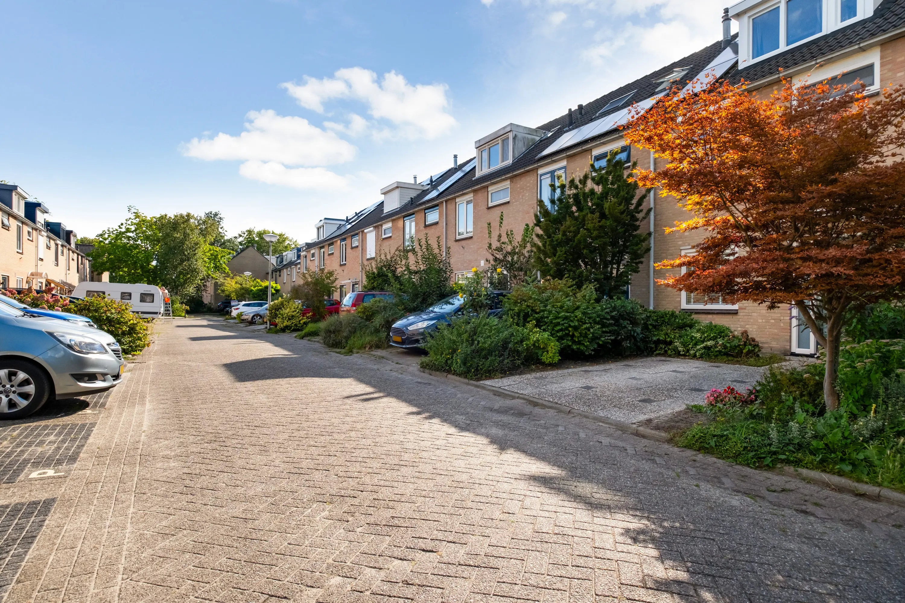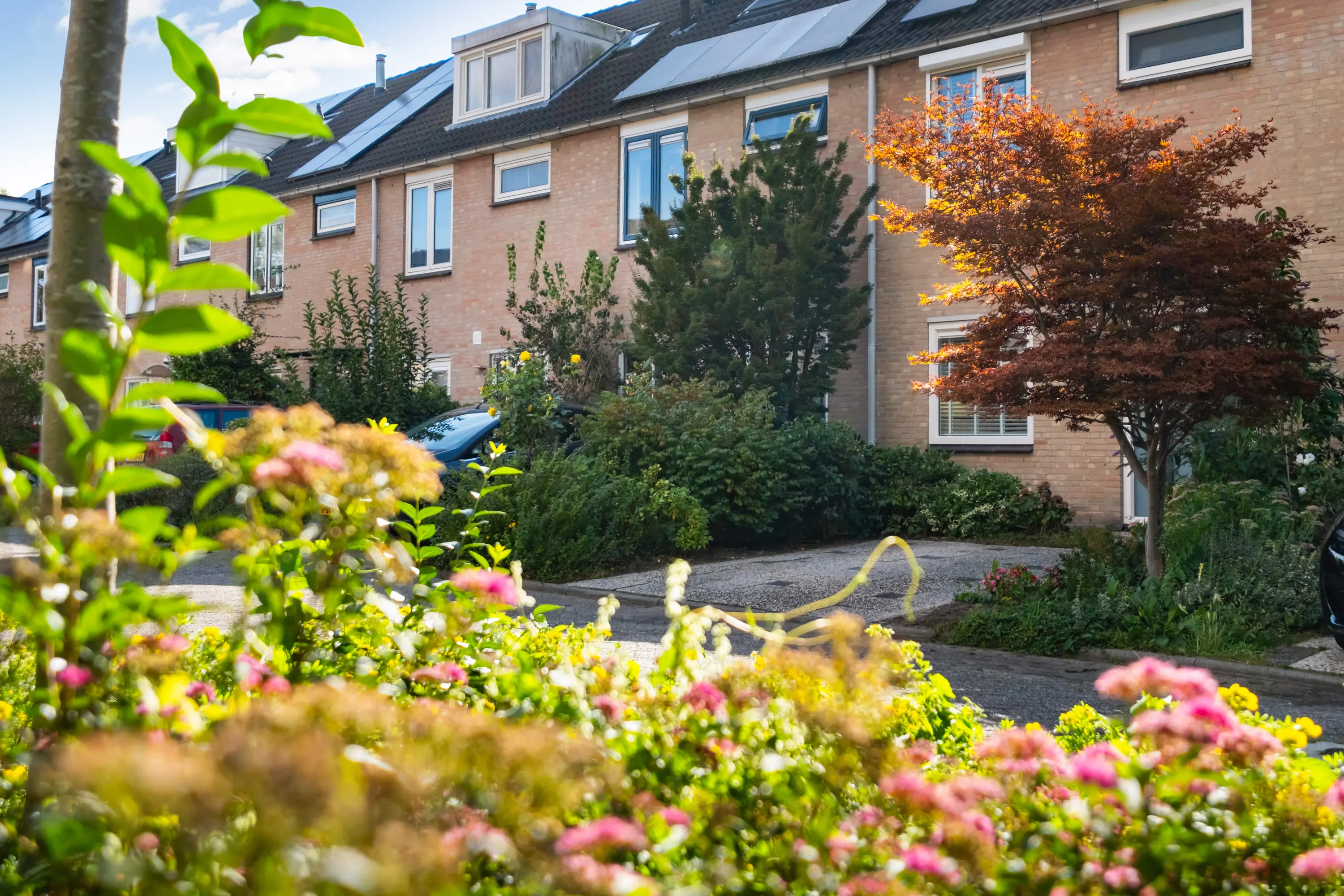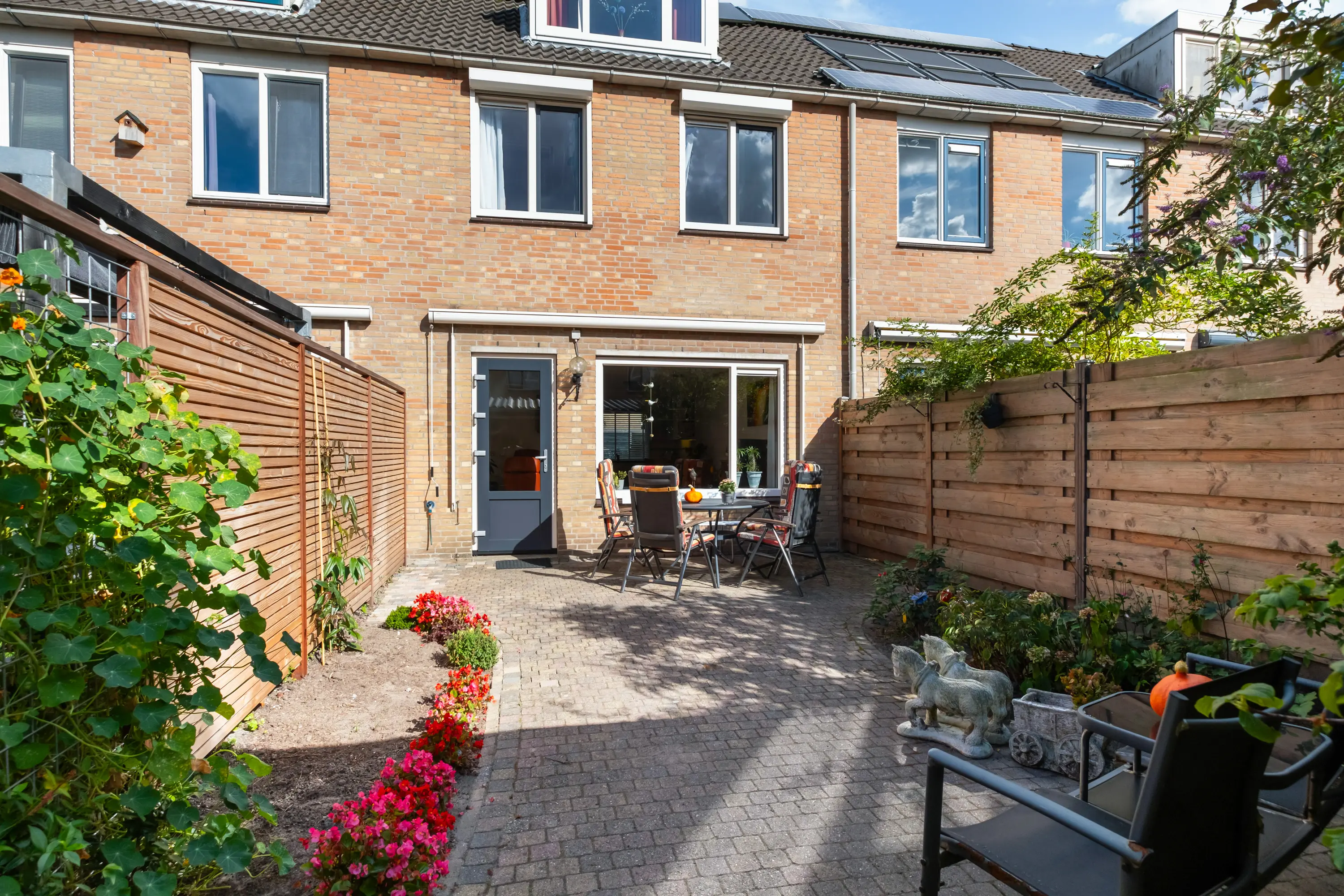 De zonnige achtertuin van ca. 10 meter diep ligt op het westen en biedt volop ruimte om te genieten van de middag- en avondzon. Aan de achtergevel hangt een zonnescherm en er is een buitenkraan aanwezig. De tuin is grotendeels bestraat, afgewisseld met groene borders met beplanting. Achterin staat een praktische stenen berging met elektra en een deur naar het achterpad, waardoor de tuin ook via achterom bereikbaar is.