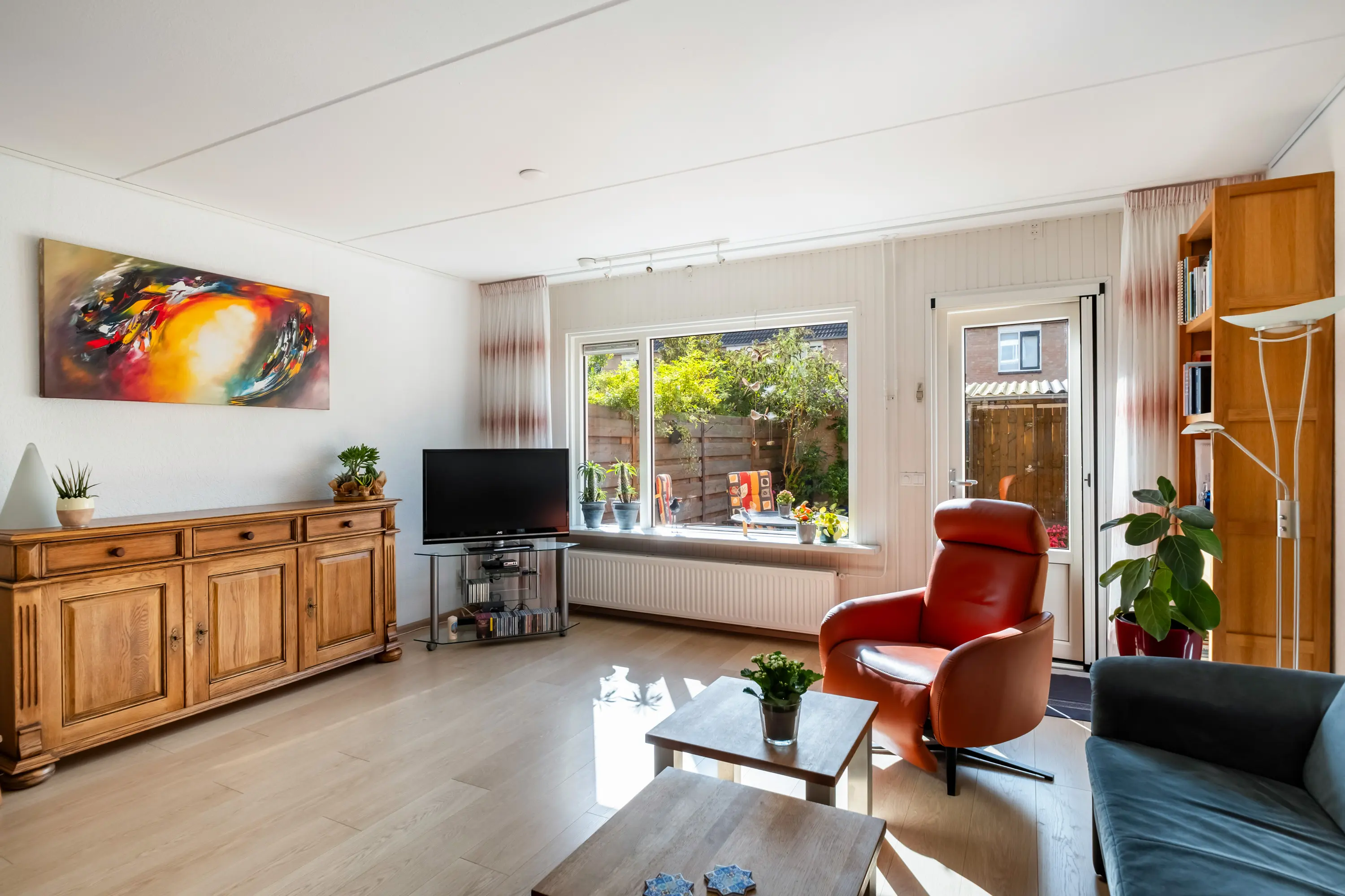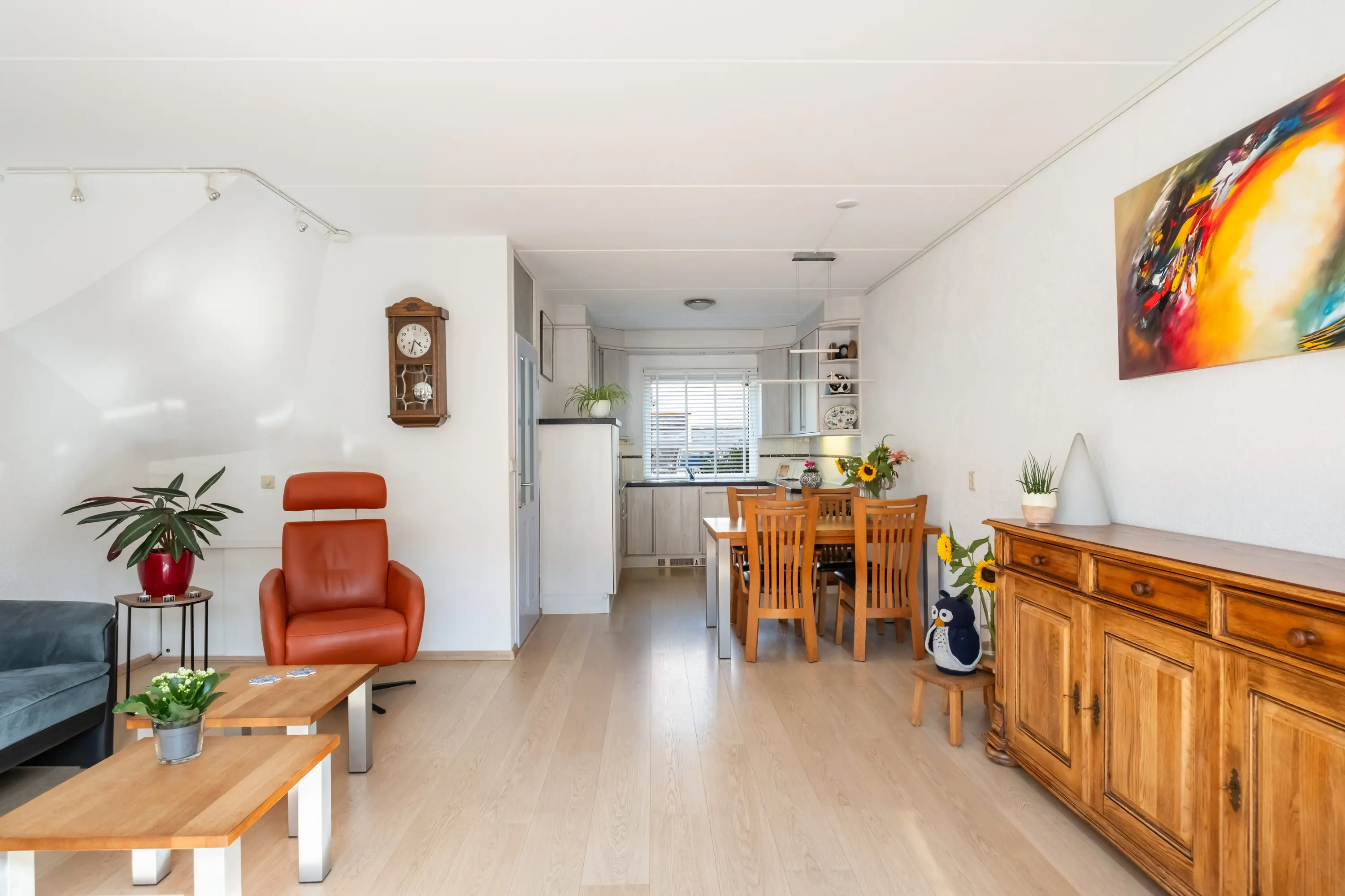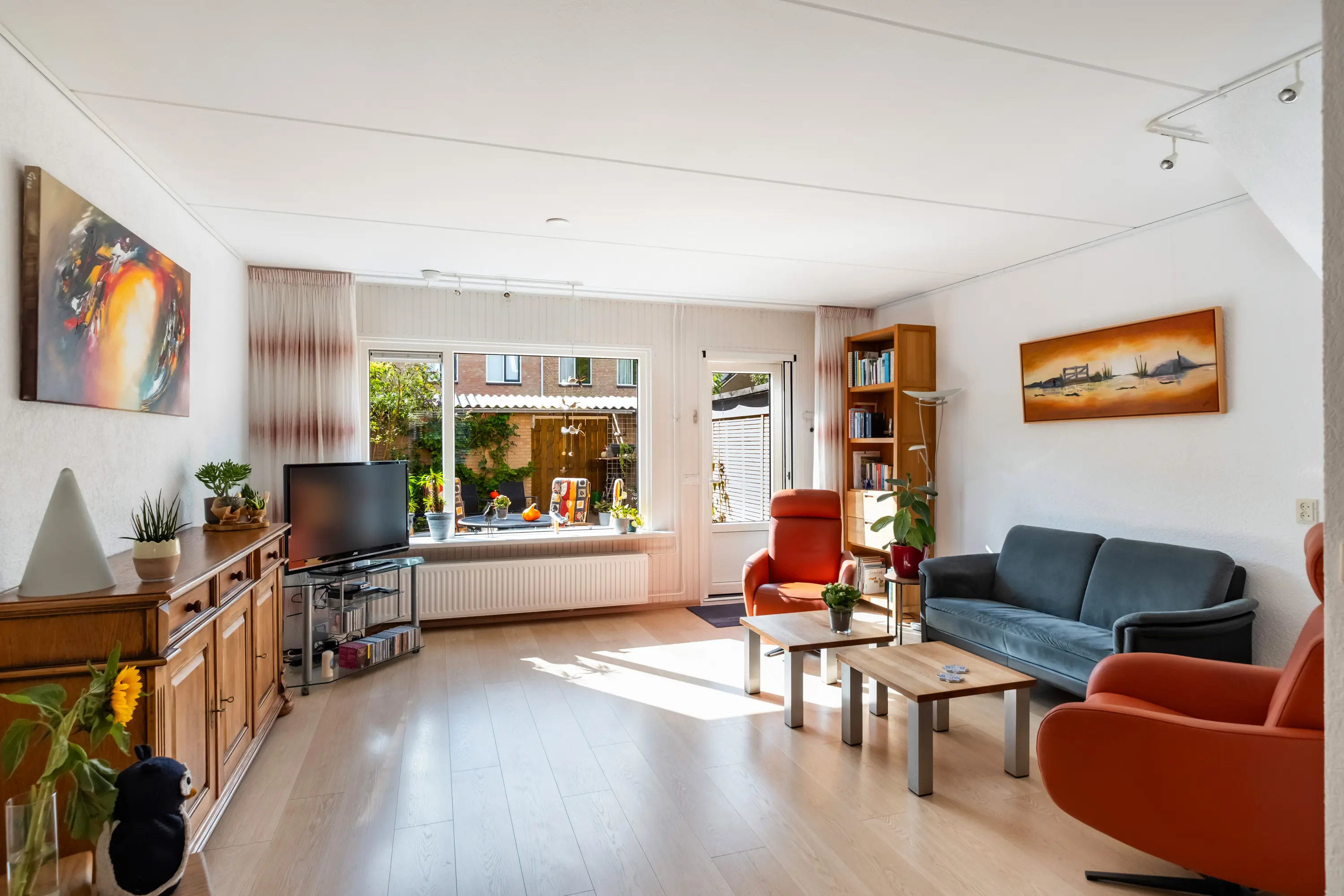 De entree brengt je in de hal met garderoberuimte, meterkast (met glasvezelaansluiting) en een volledig betegeld toilet met fonteintje. Vanuit de hal kom je in de lichte woonkamer met open keuken. De woonkamer ligt aan de achterzijde en biedt voldoende ruimte voor een gezellige zithoek. door de grote ramen aan zowel de voor- als achterzijde valt er veel natuurlijk licht binnen. Vanuit de woonkamer is er een deur naar de zonnige achtertuin.