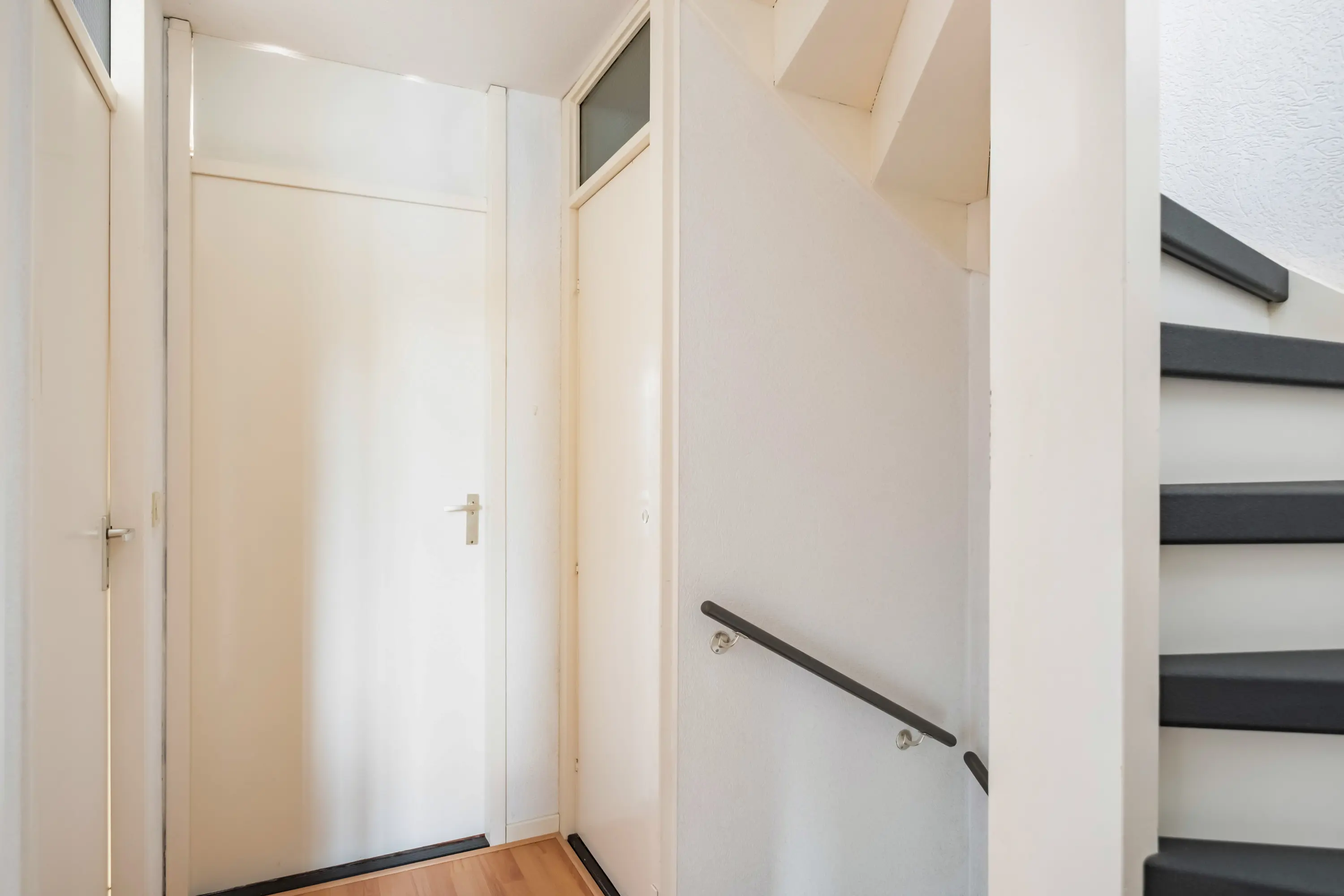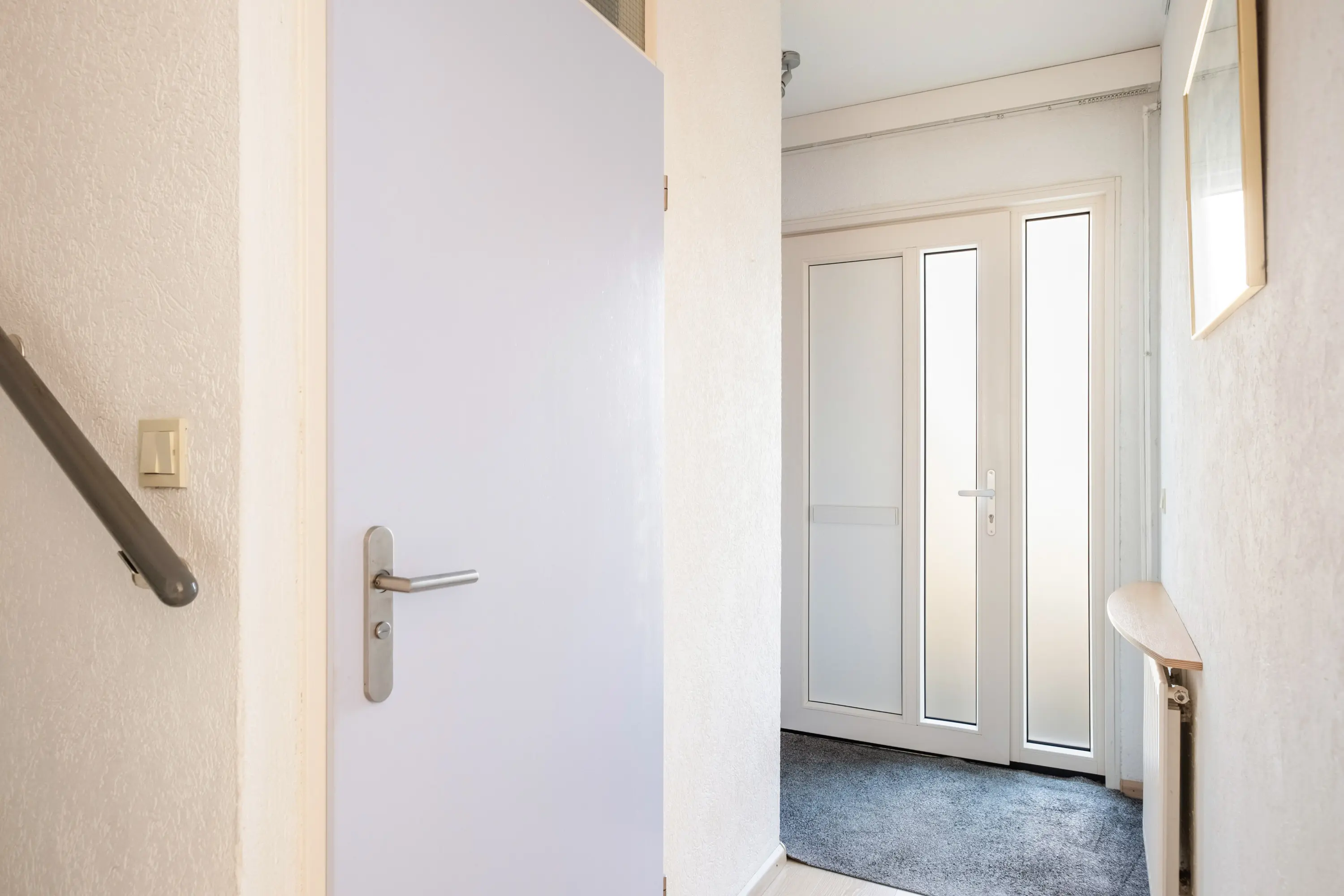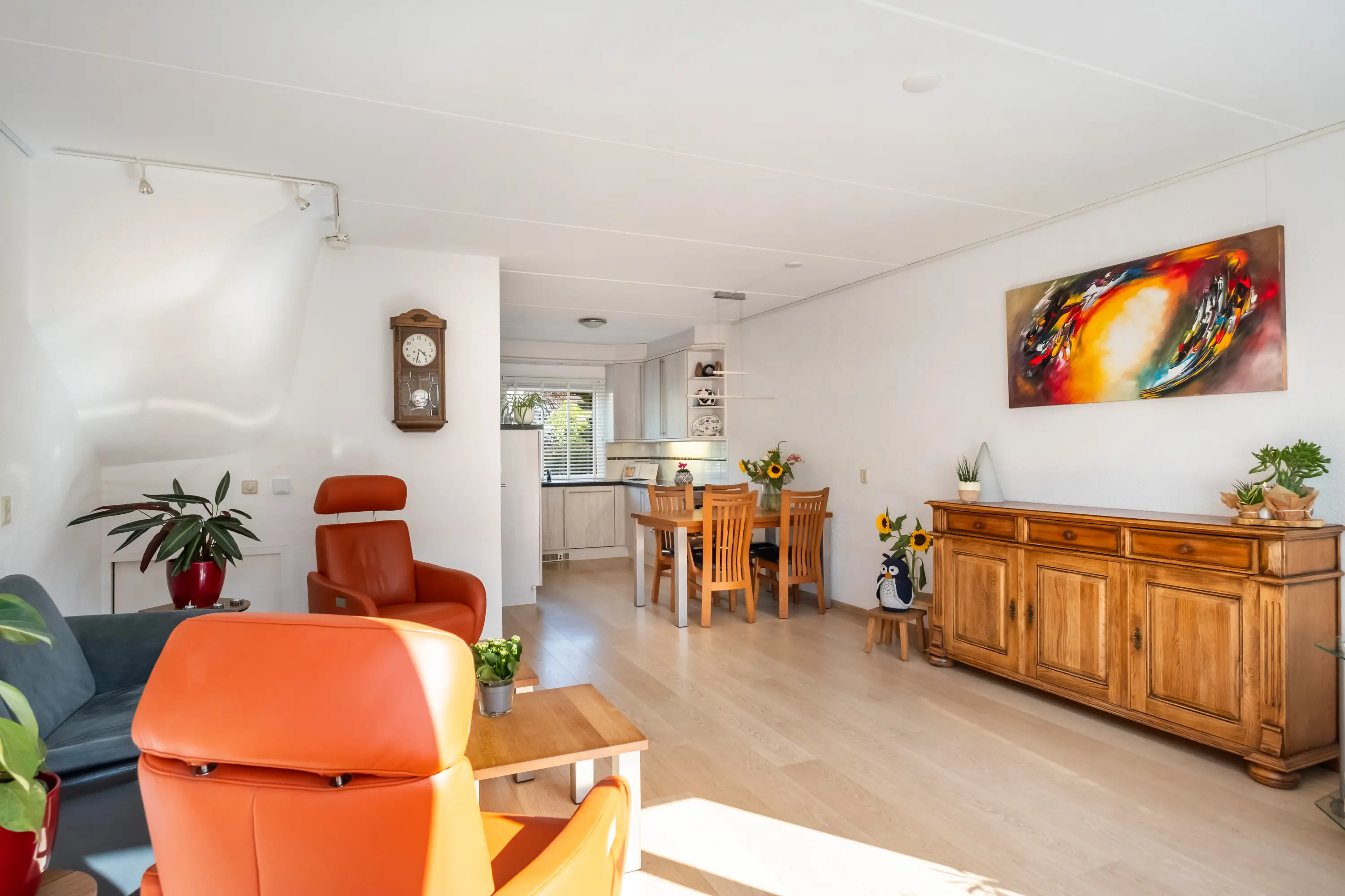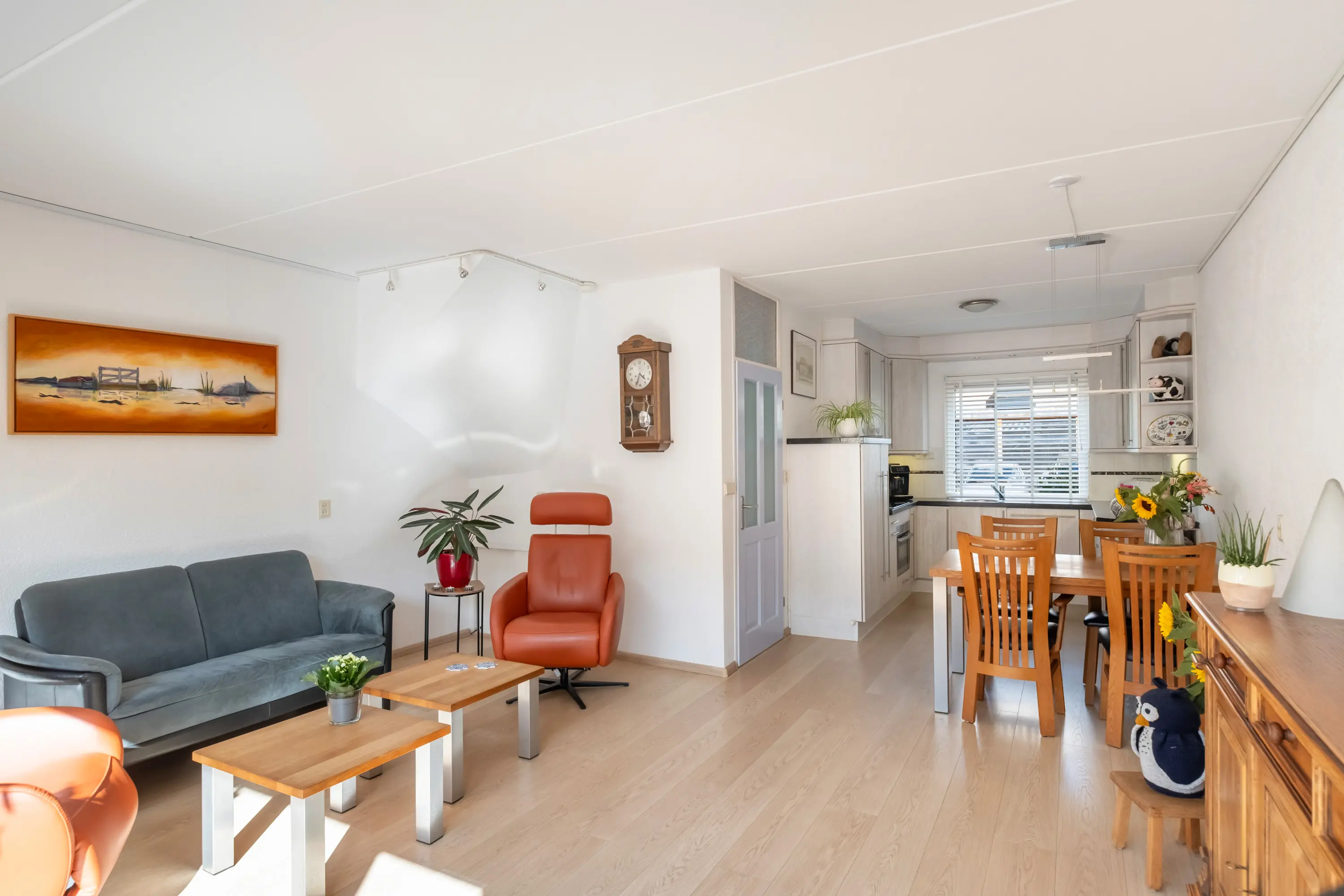 De entree brengt je in de hal met garderoberuimte, meterkast (met glasvezelaansluiting) en een volledig betegeld toilet met fonteintje. Vanuit de hal kom je in de lichte woonkamer met open keuken. De woonkamer ligt aan de achterzijde en biedt voldoende ruimte voor een gezellige zithoek. door de grote ramen aan zowel de voor- als achterzijde valt er veel natuurlijk licht binnen. Vanuit de woonkamer is er een deur naar de zonnige achtertuin.